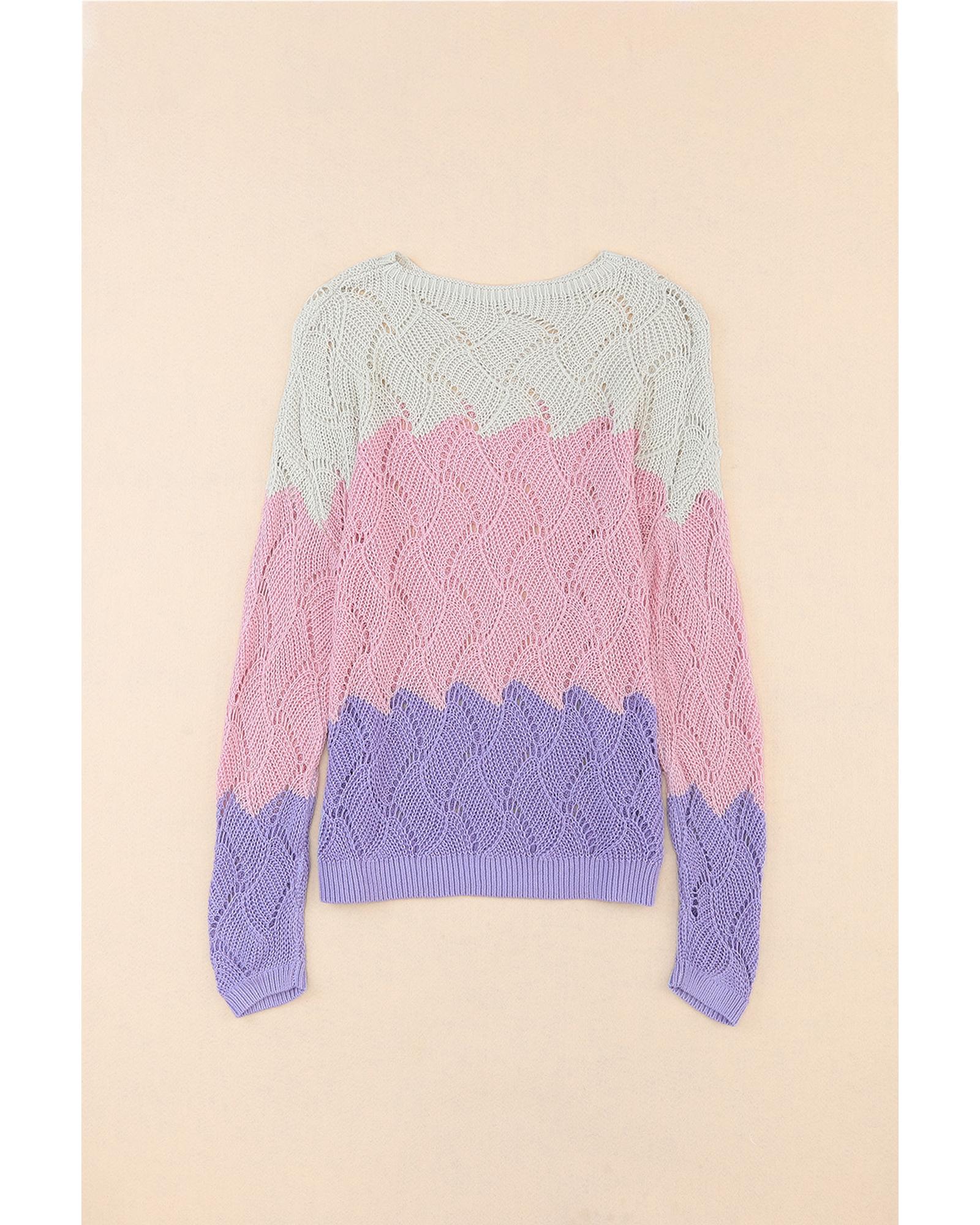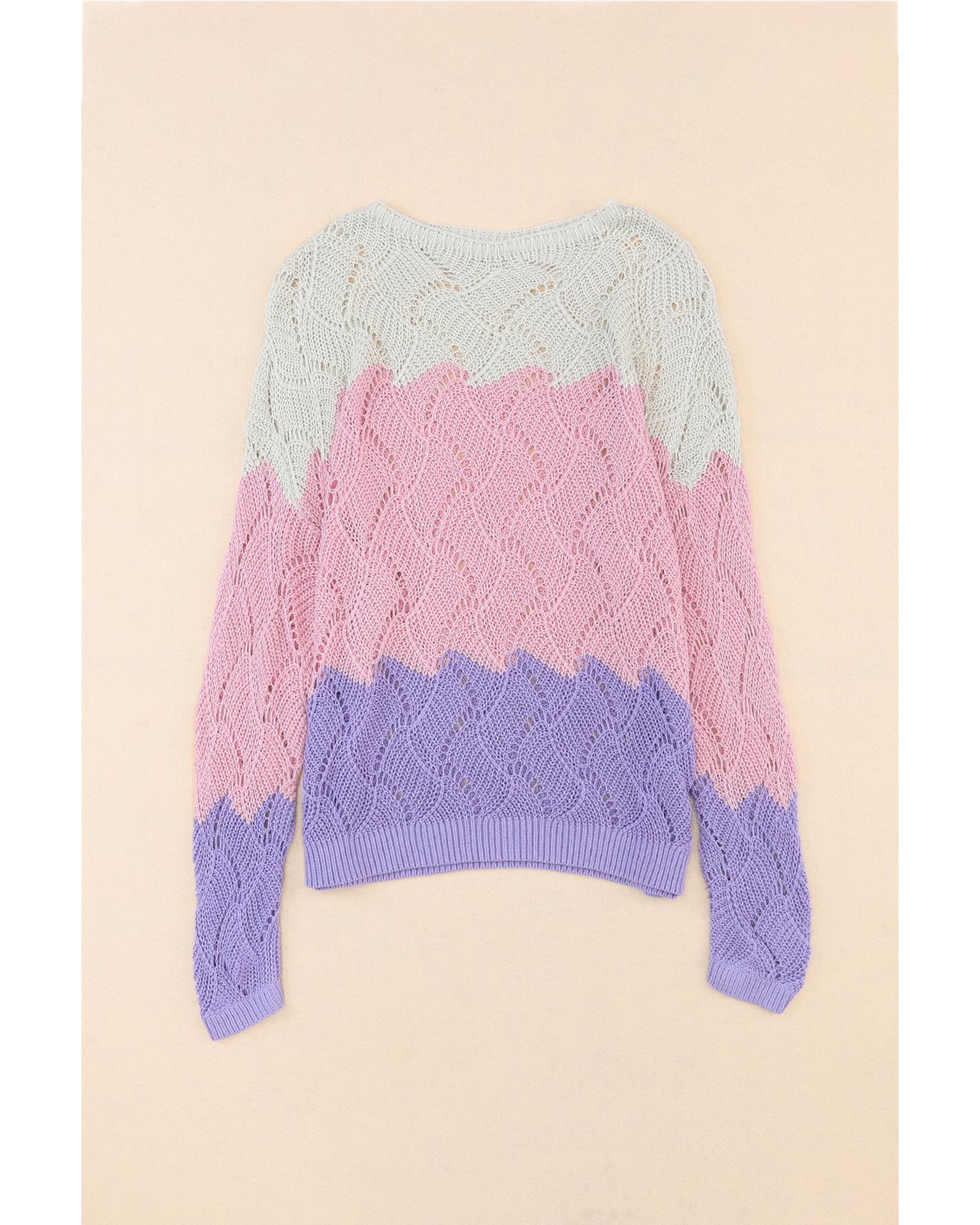 Pink Color Block Hollow Knitted Loose Sweater – L