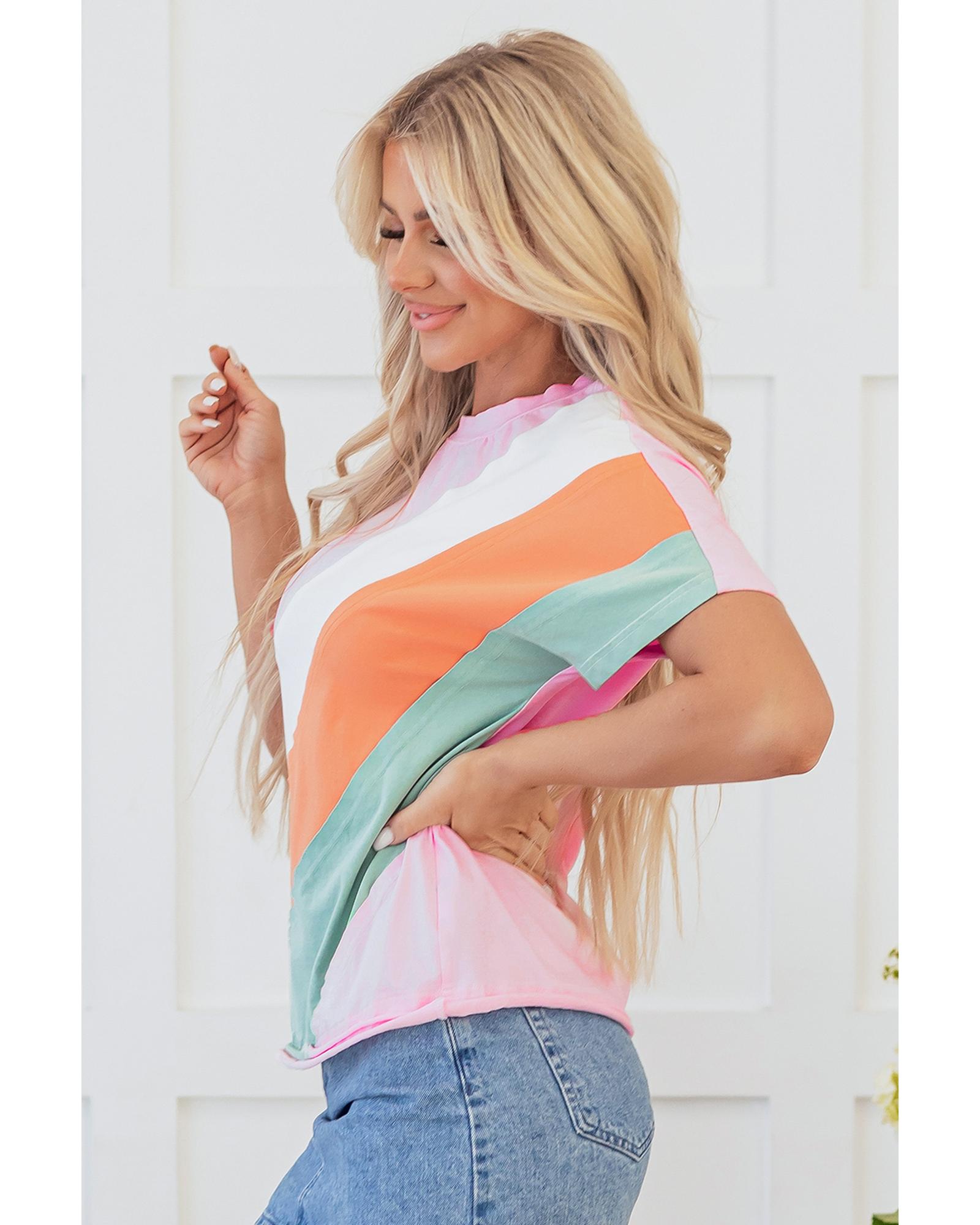 Pink Color Block Patchwork Seamed Crewneck T Shirt – S