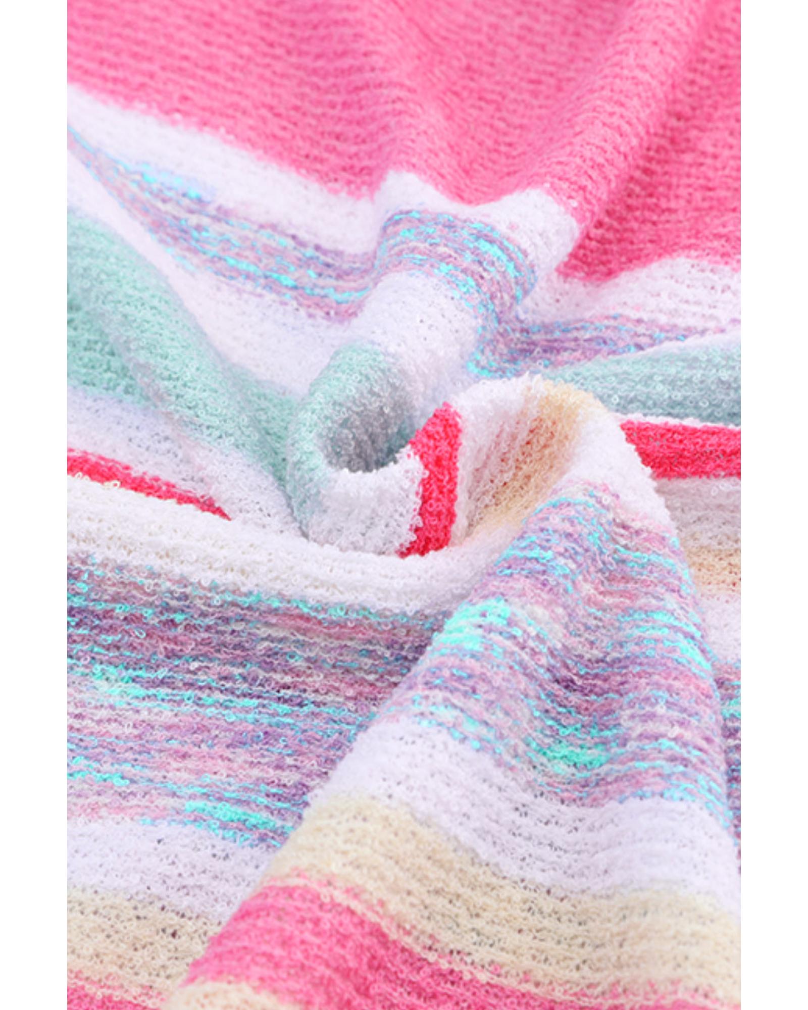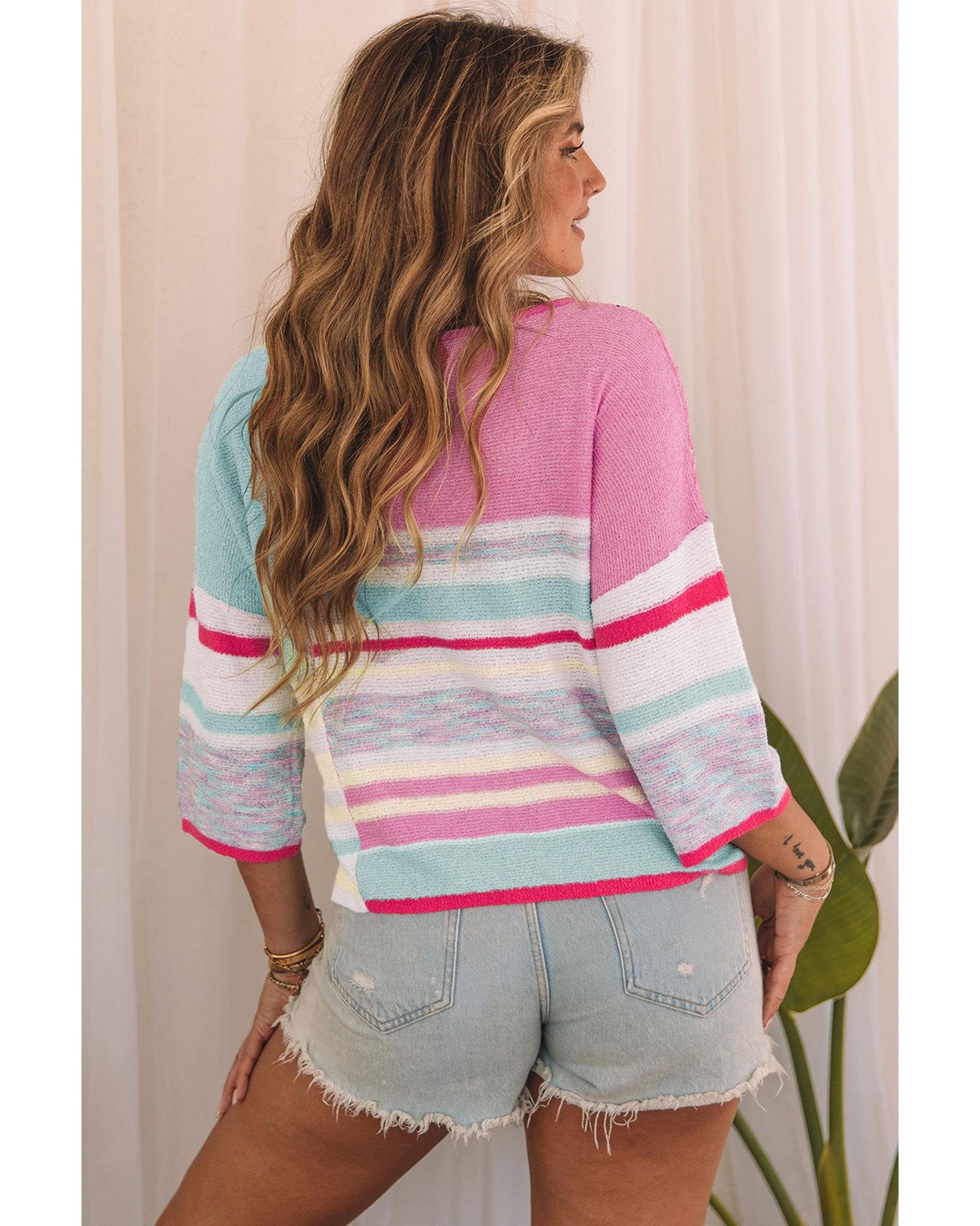 Pink Color Block Striped Three-Quarter Sleeve Knitted Top – M