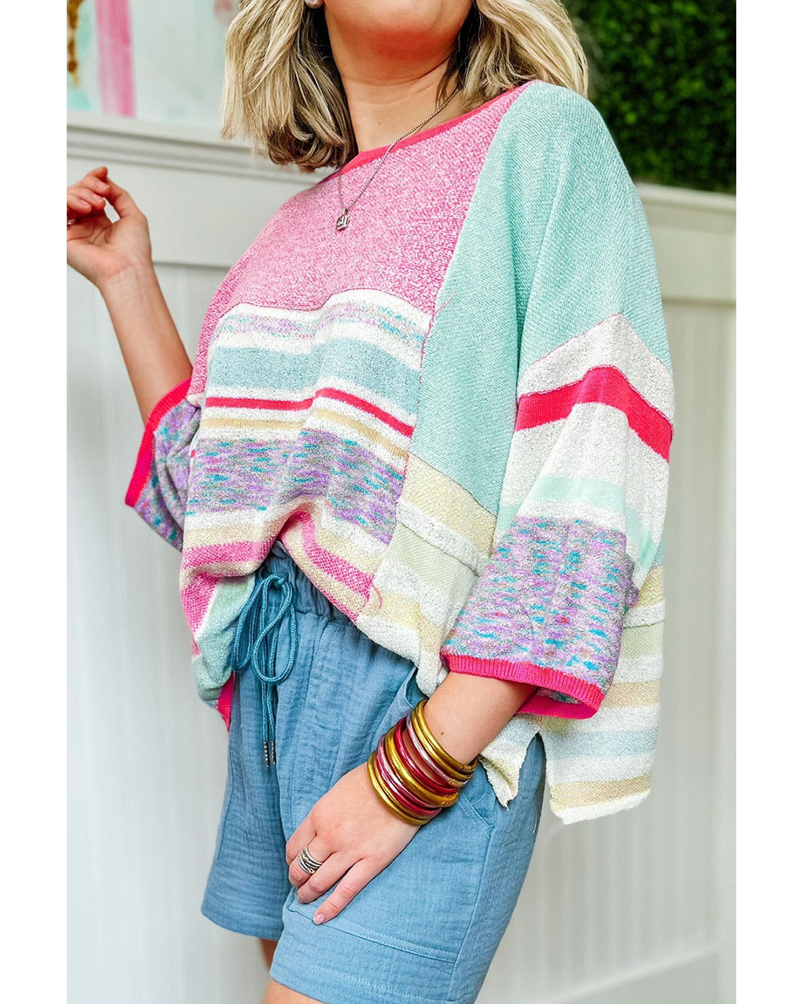 Pink Color Block Striped Three-Quarter Sleeve Knitted Top – XL