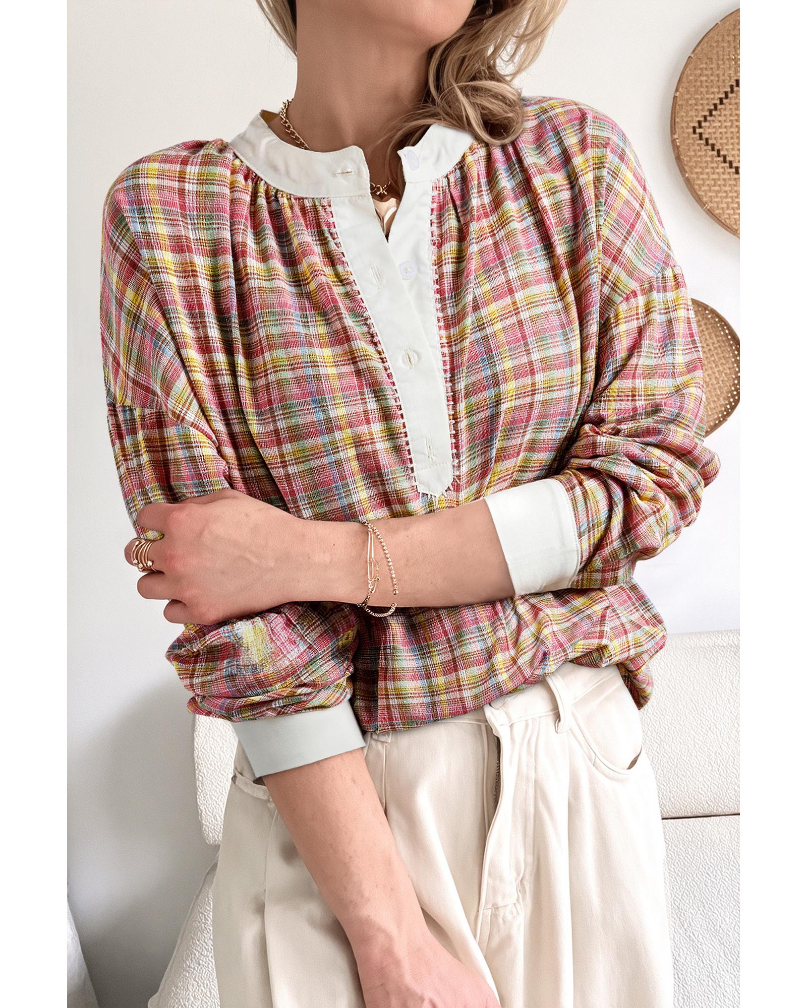 Pink Colorblock Plaid Patchwork Henley Blouse – M