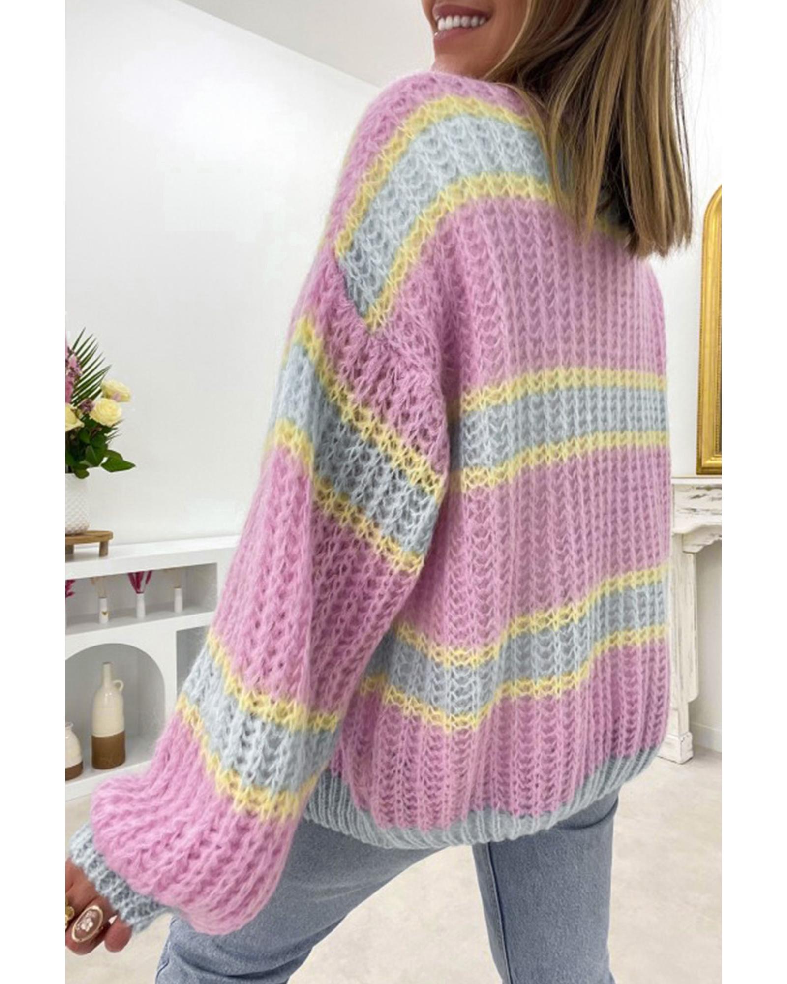 Pink Contrast Striped Open Front Cable Cardigan – M