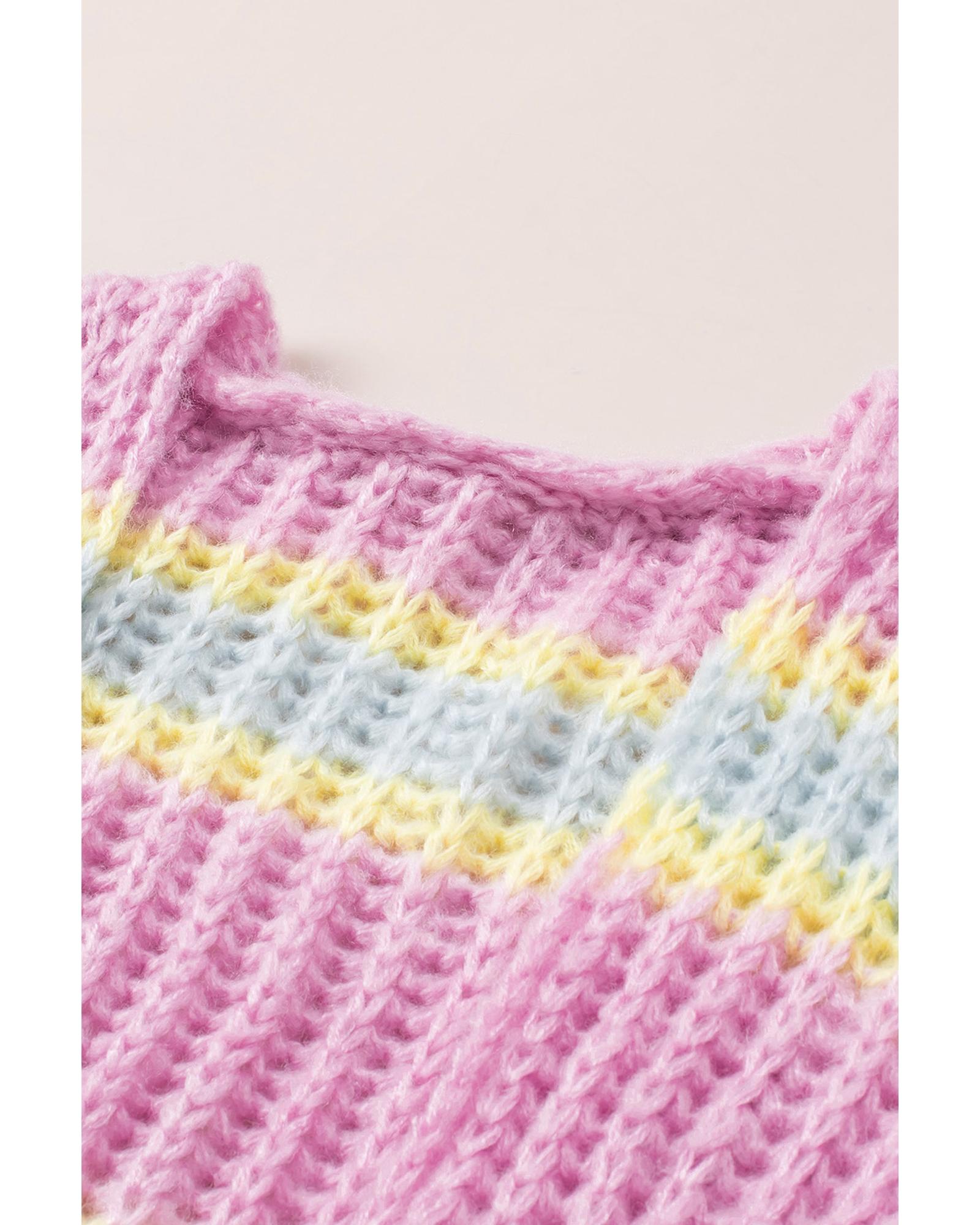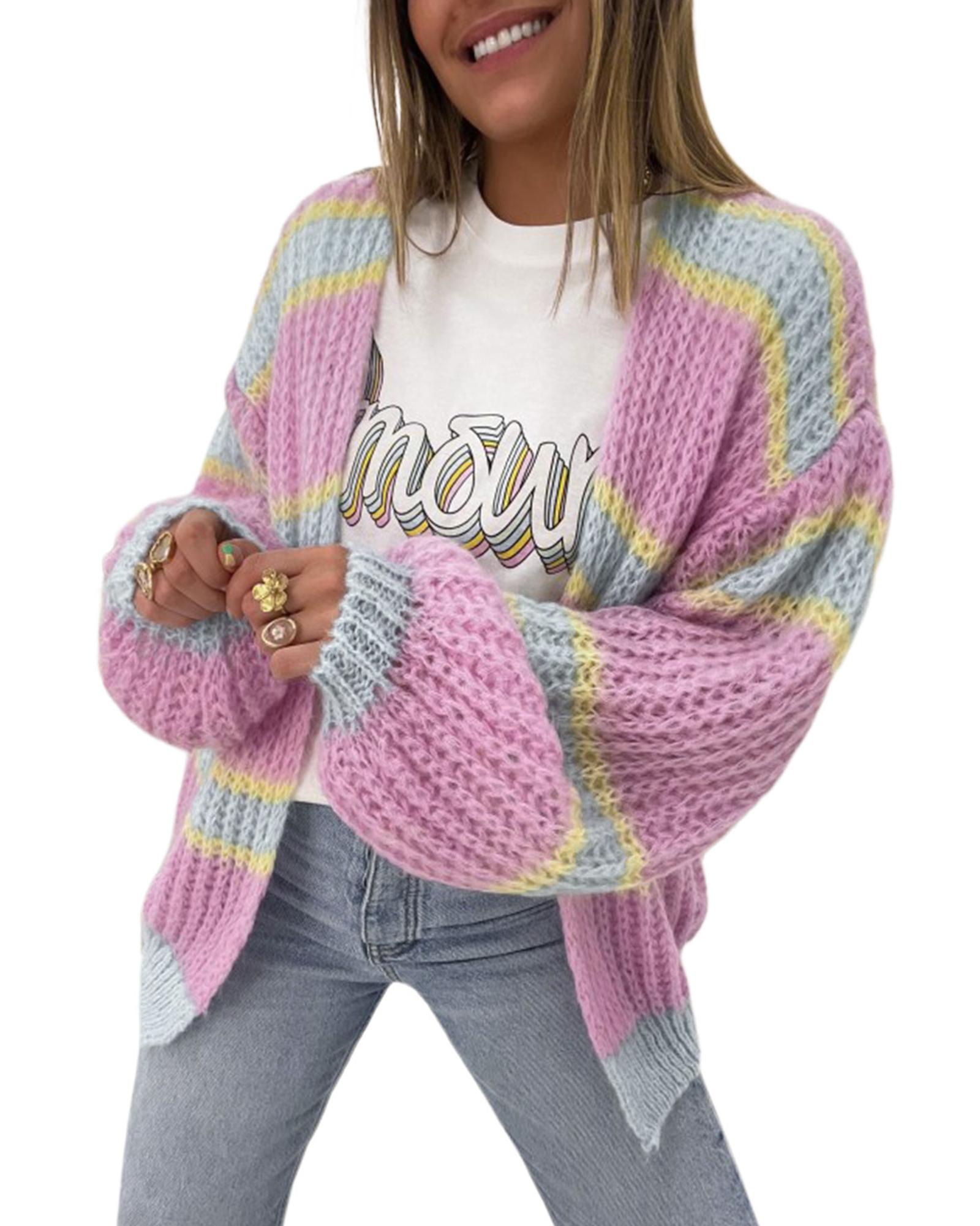 Pink Contrast Striped Open Front Cable Cardigan – S