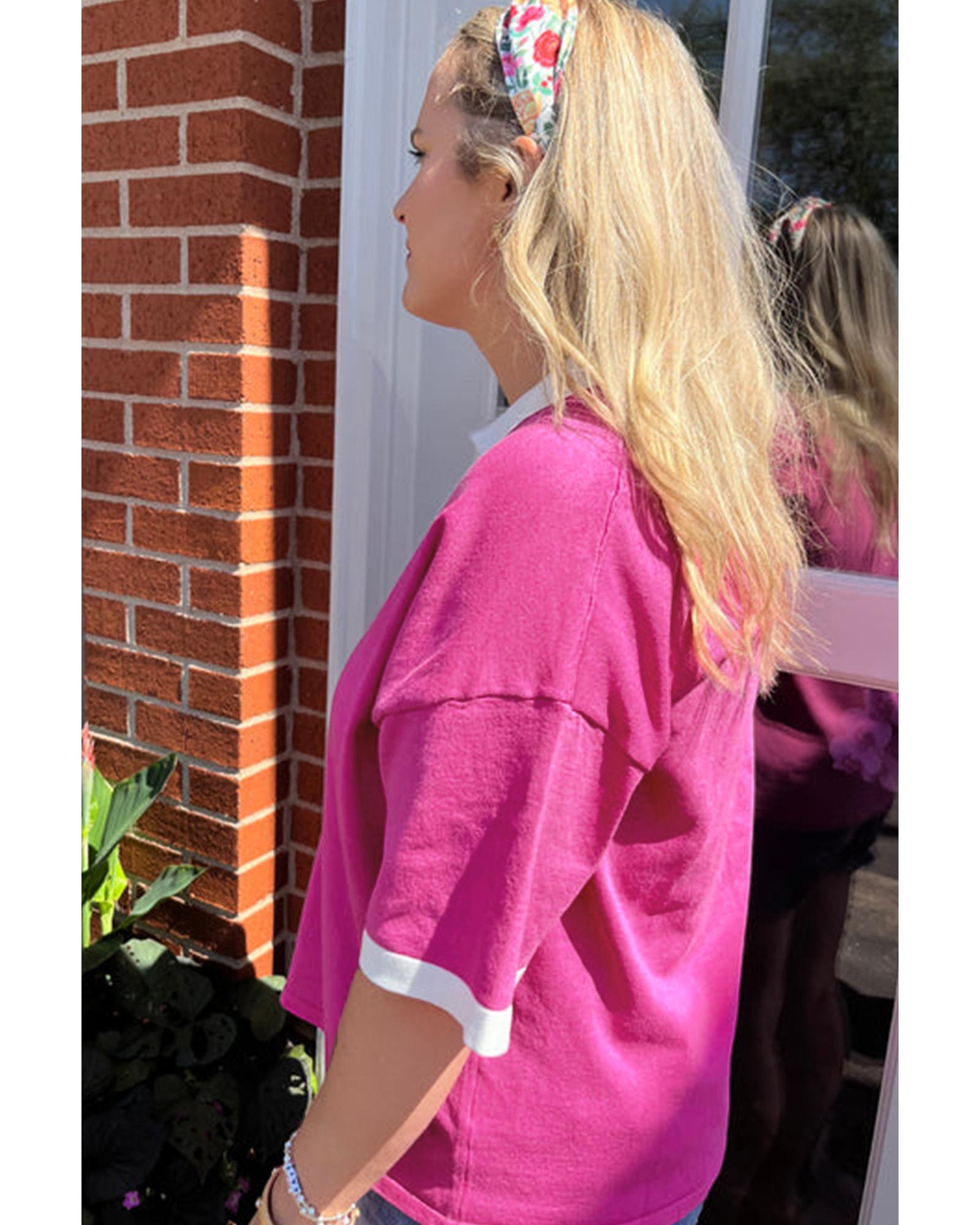 Pink Contrast Trim Collared Split Neck Short Sleeve Plus Size Top – 2X
