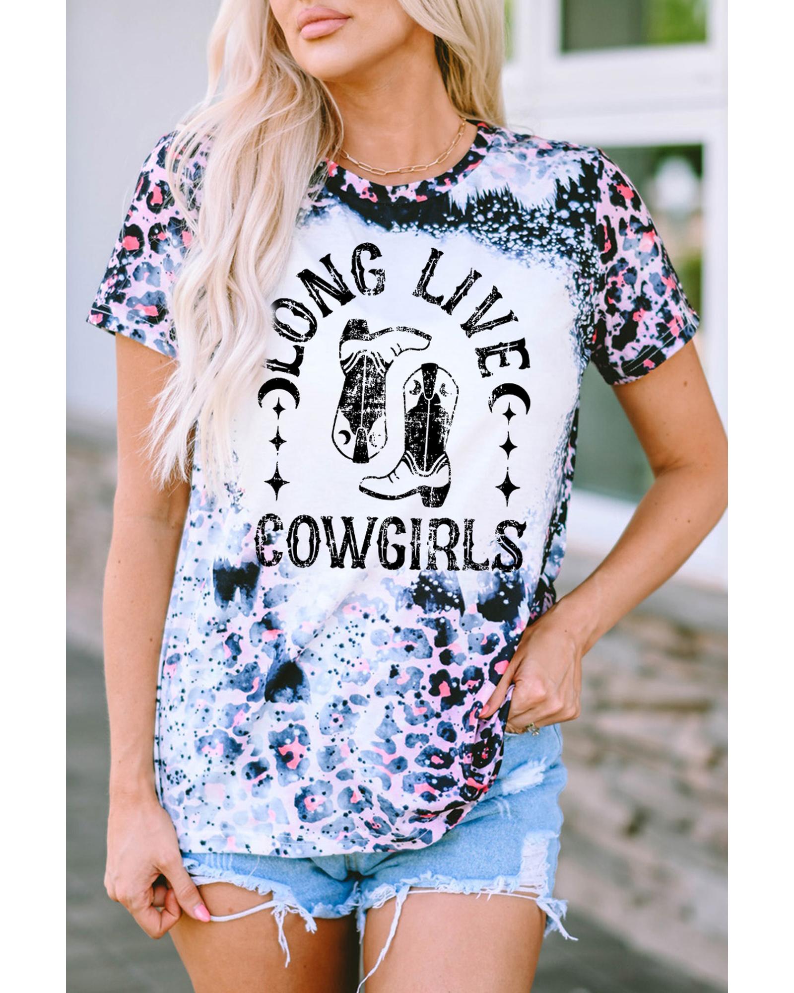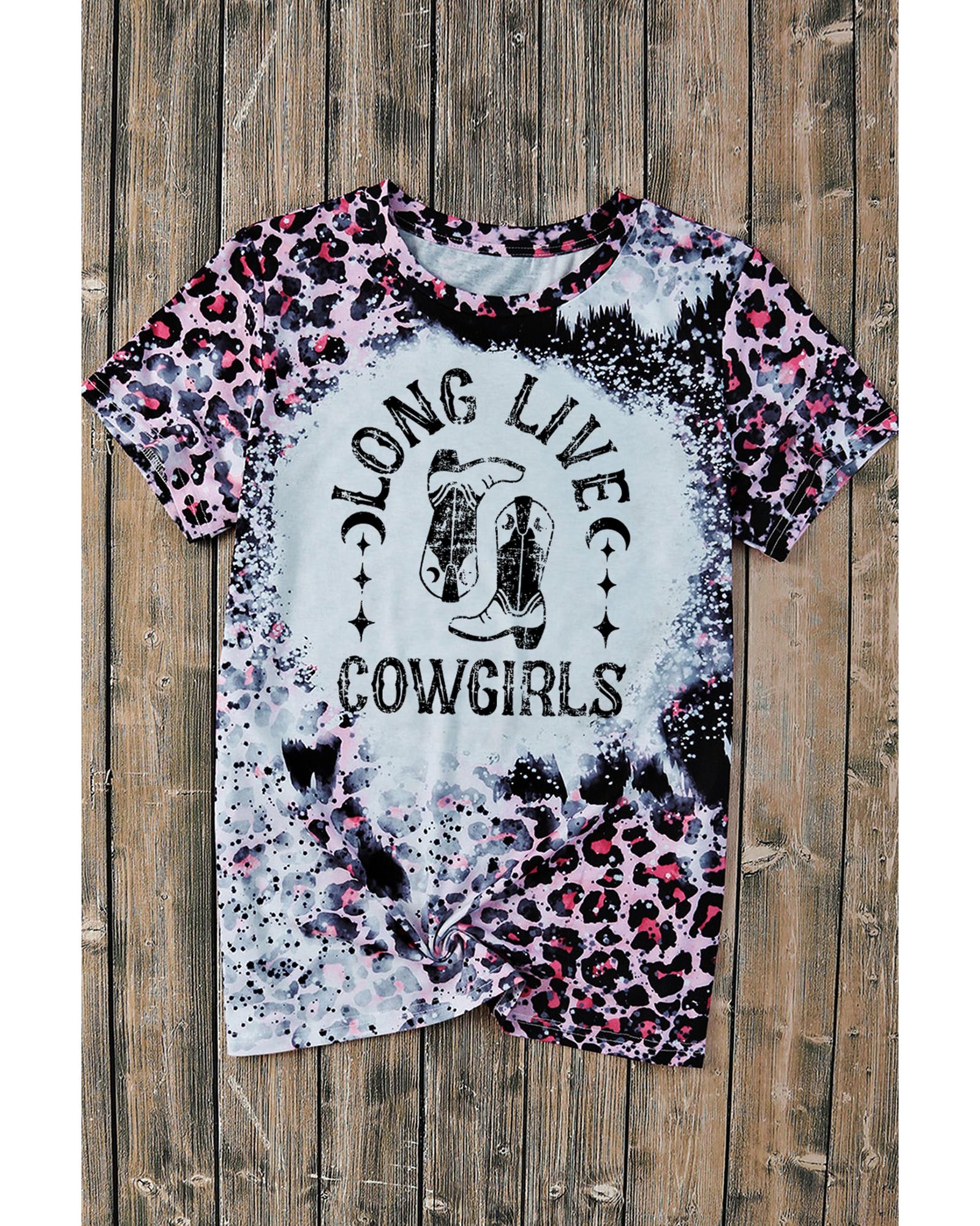 Pink Cowgirls Boots Leopard Bleached Crew Neck T Shirt – M