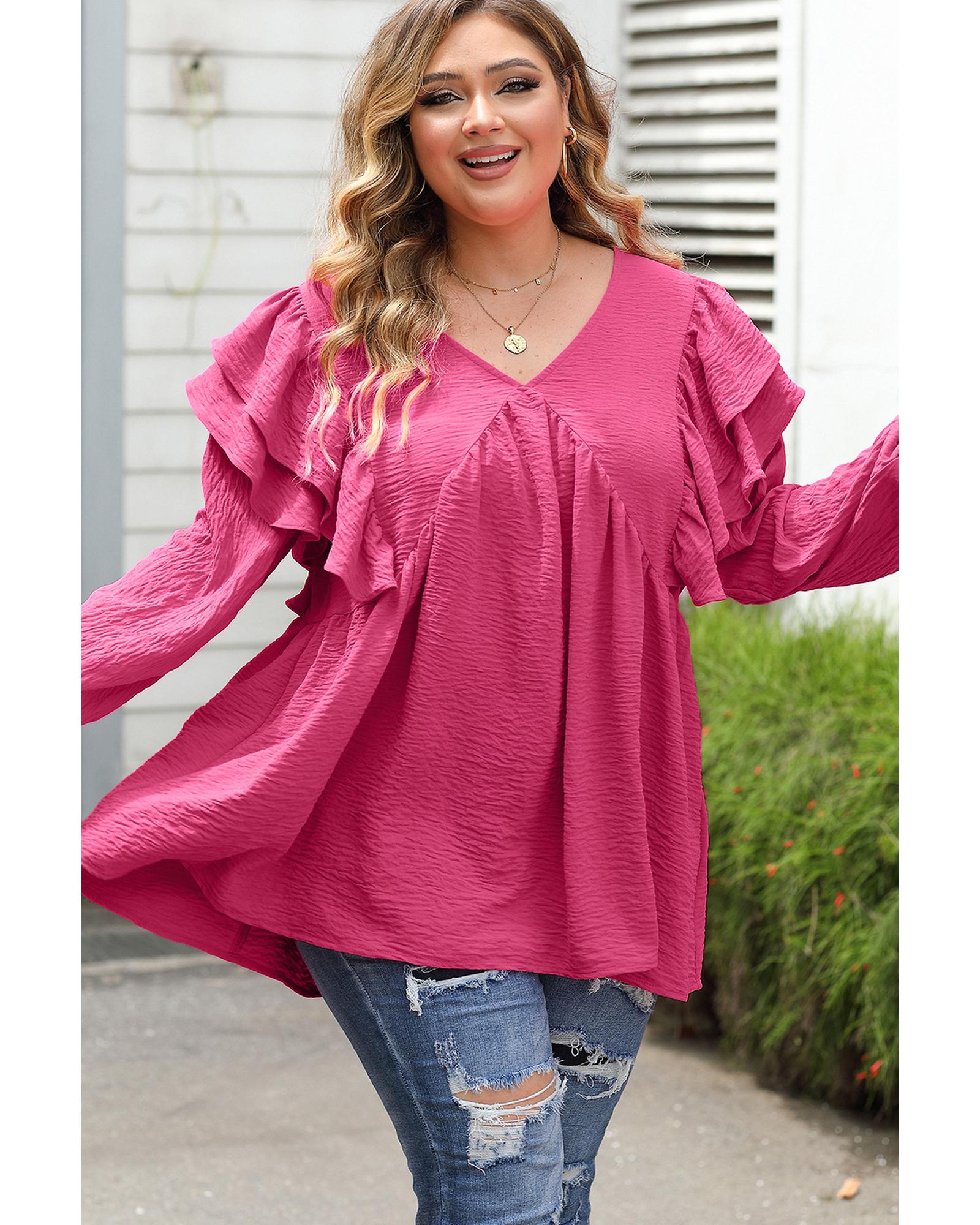 Pink Crinkle Ruffled V Neck Plus Size Blouse - 3X