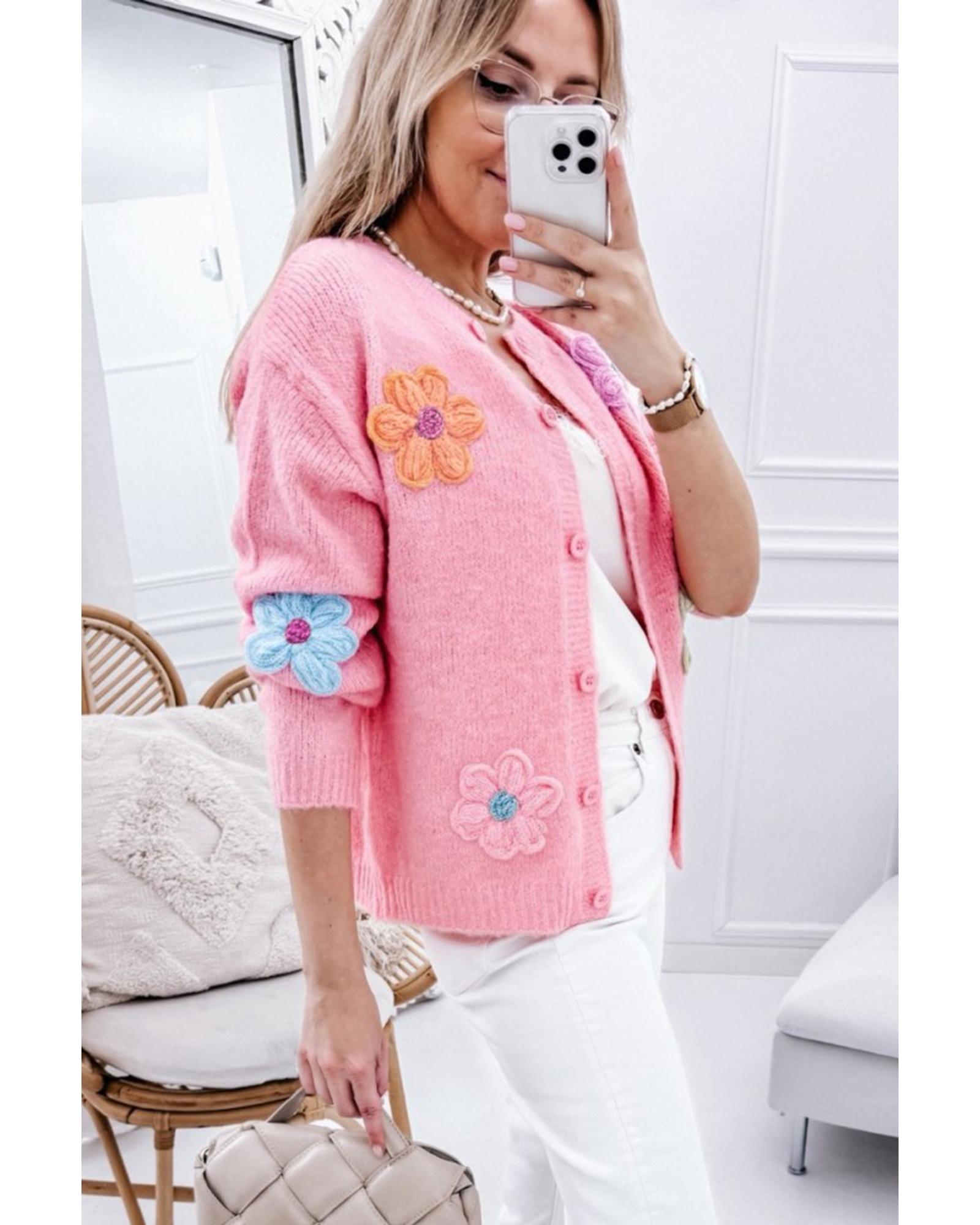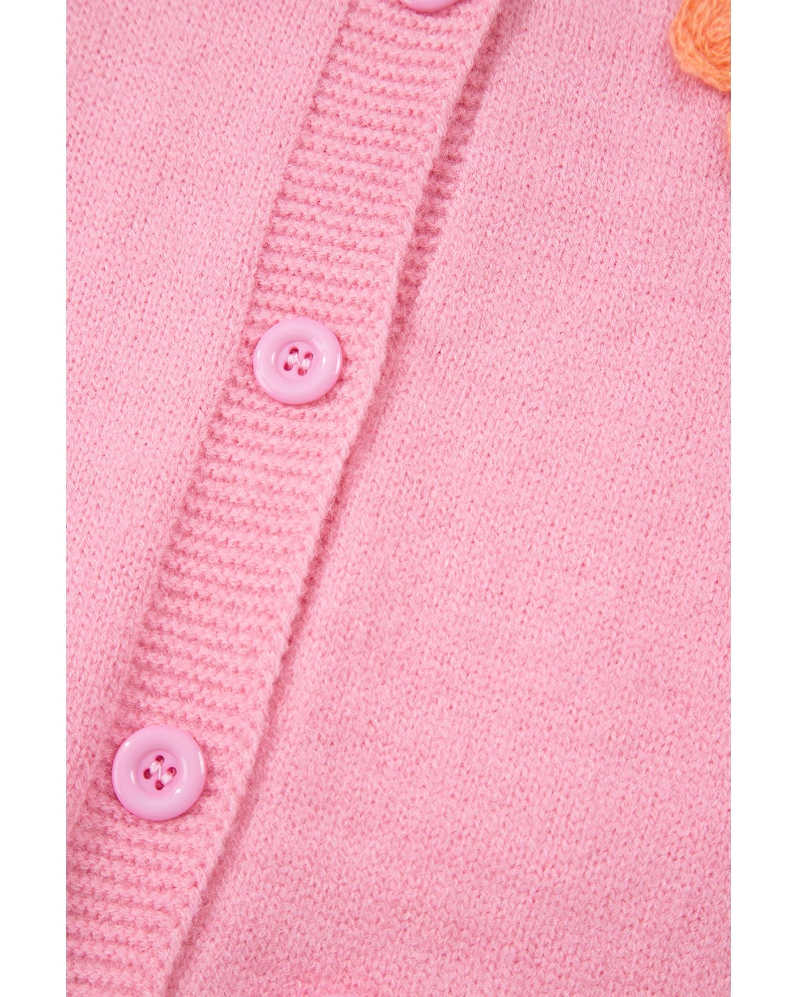 Pink Cute Knitted Floral Pattern Button Up Cardigan – L