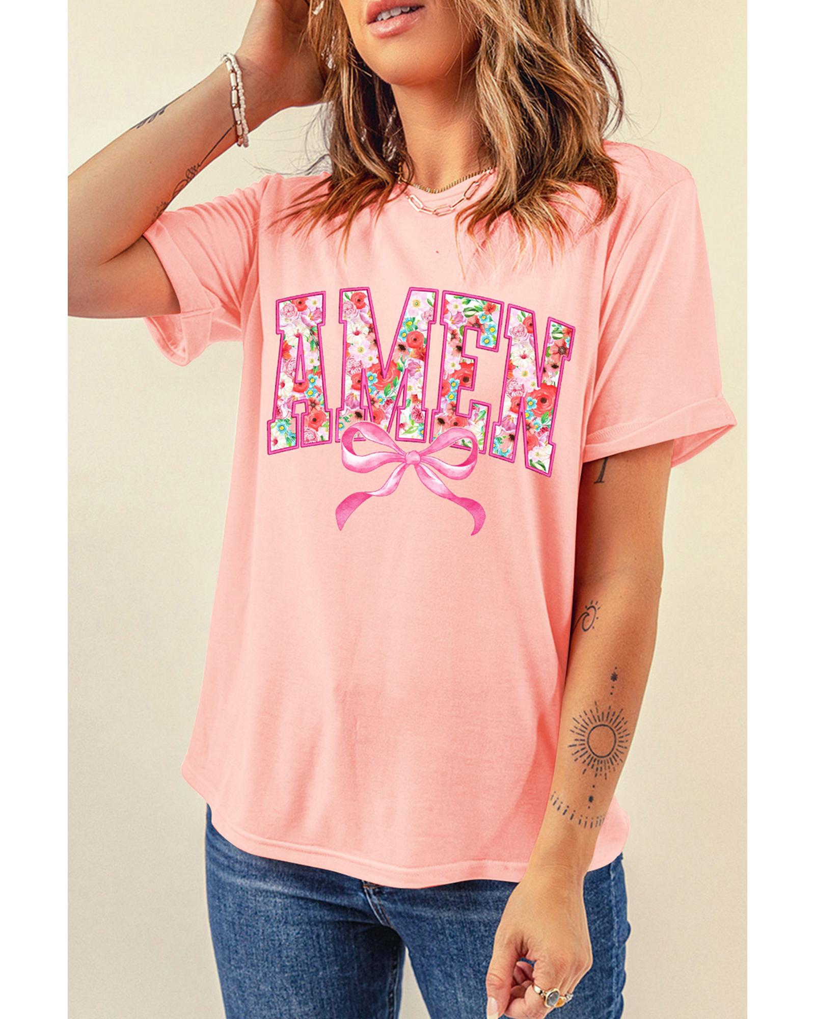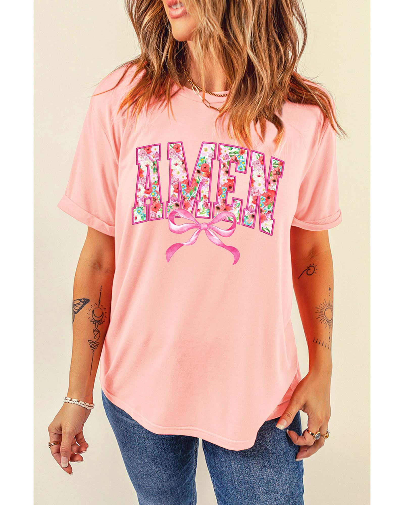 Pink Floral AMEN Bow Graphic Crewneck T Shirt – M