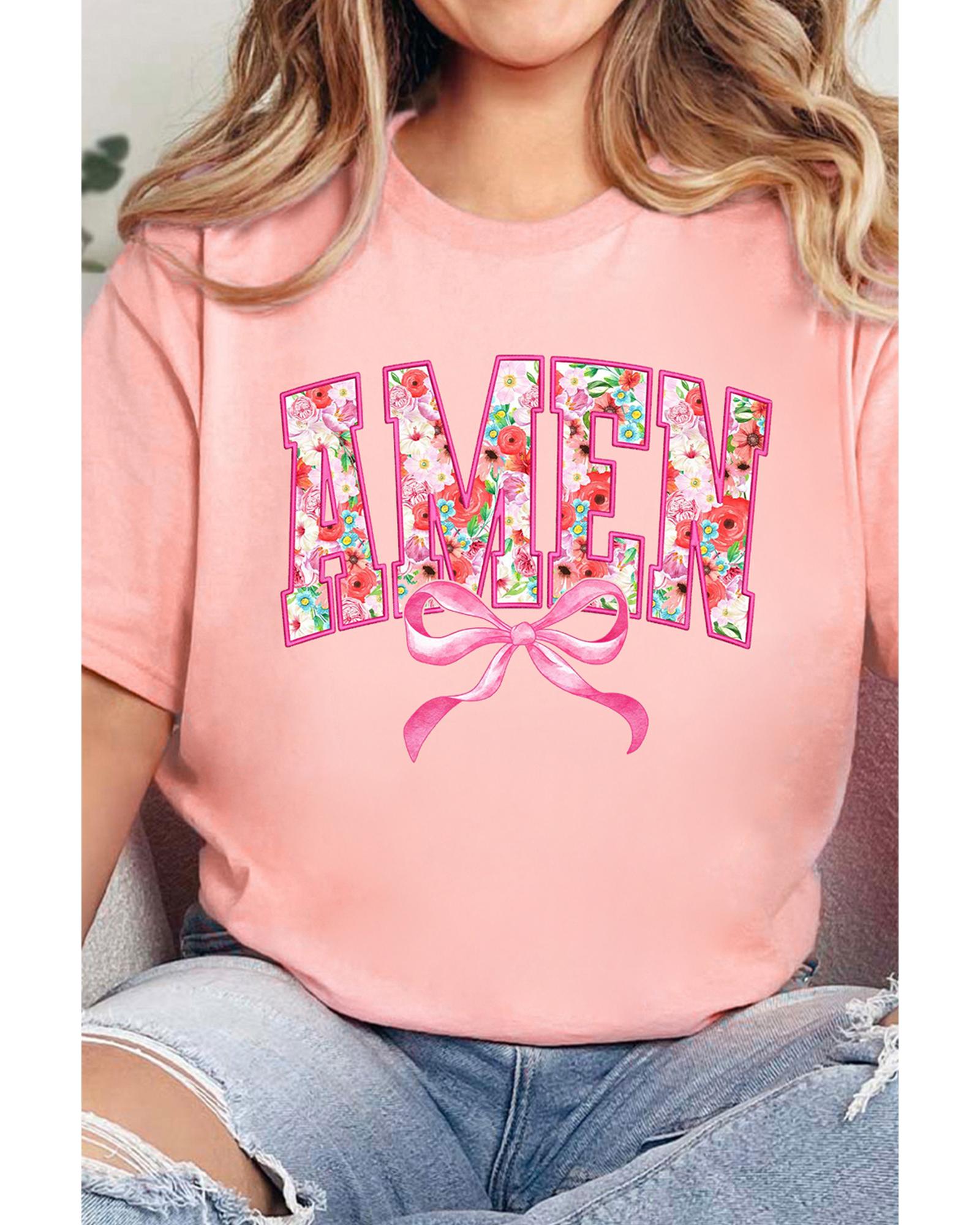 Pink Floral AMEN Bow Graphic Crewneck T Shirt – S