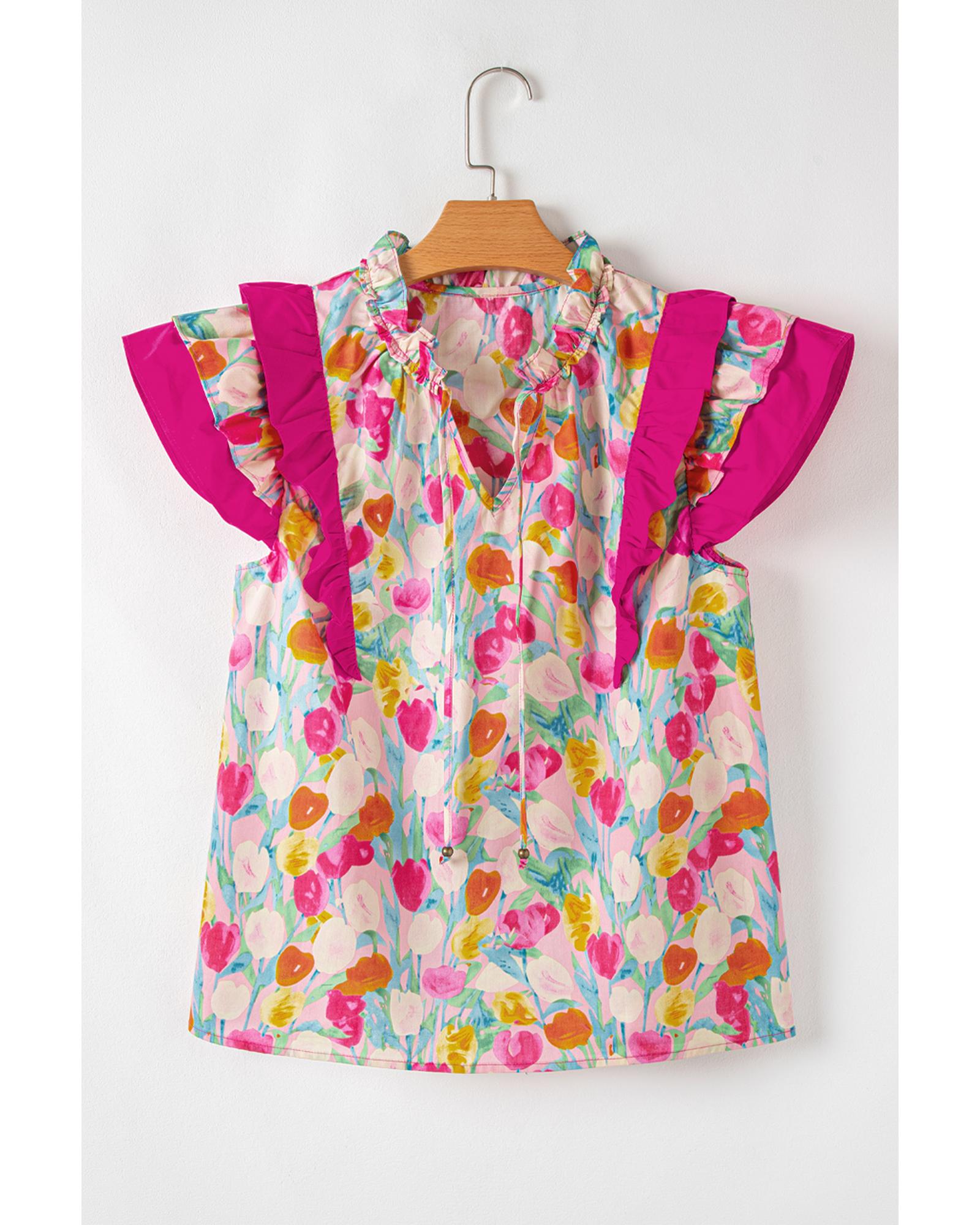 Pink Floral Layered Ruffle Flutter Sleeve Tie V Neck Blouse – S