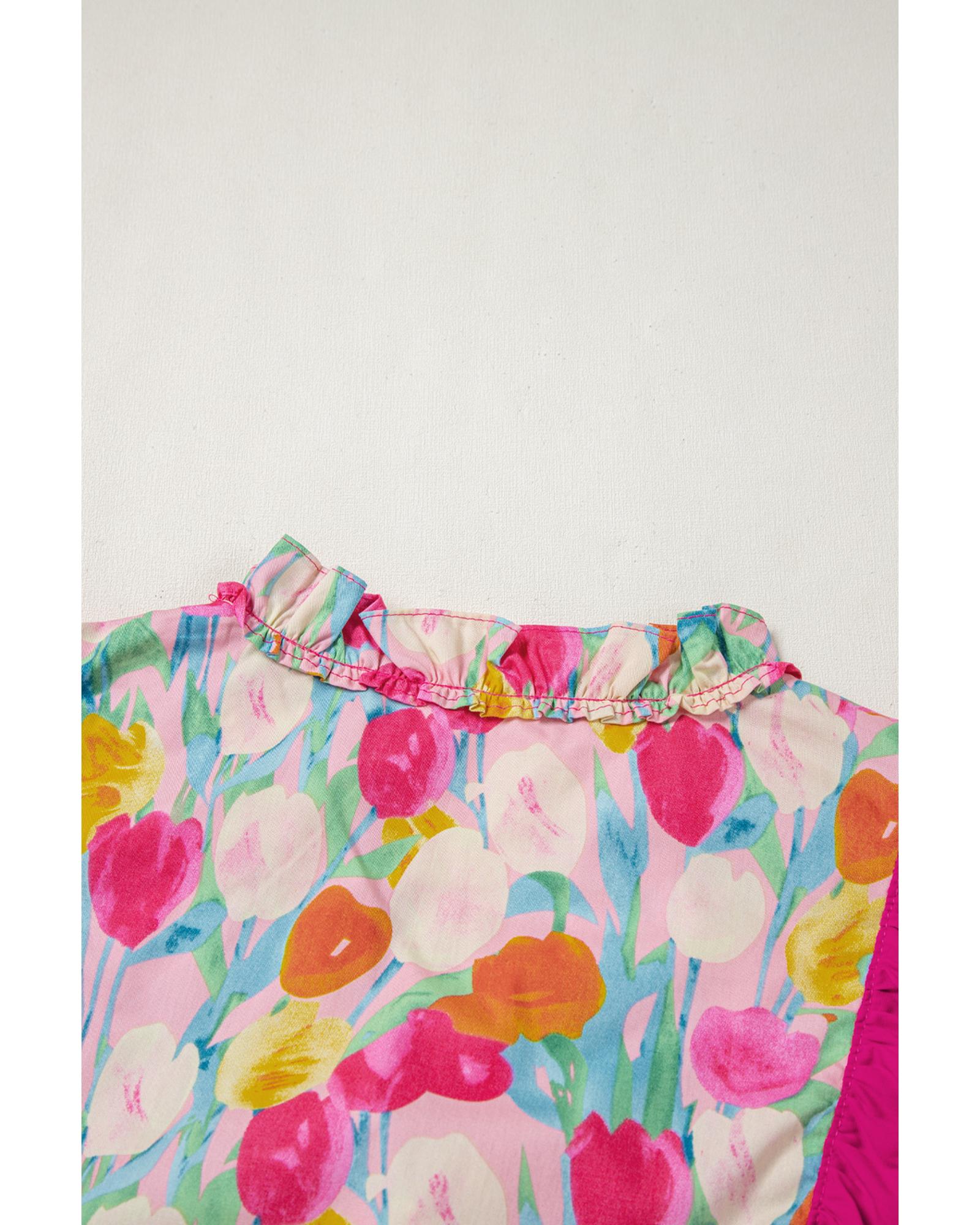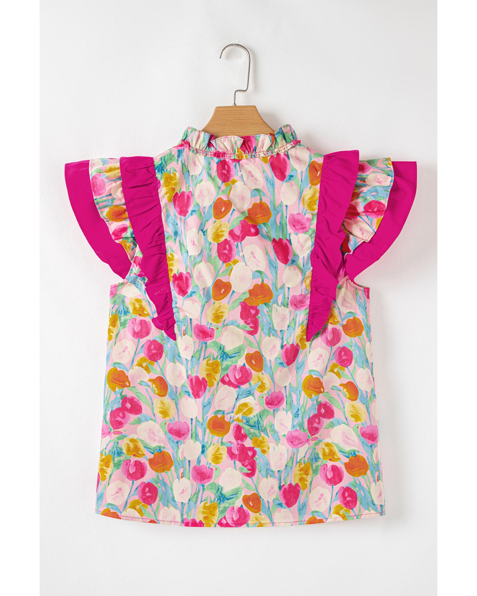 Pink Floral Layered Ruffle Flutter Sleeve Tie V Neck Blouse – XL
