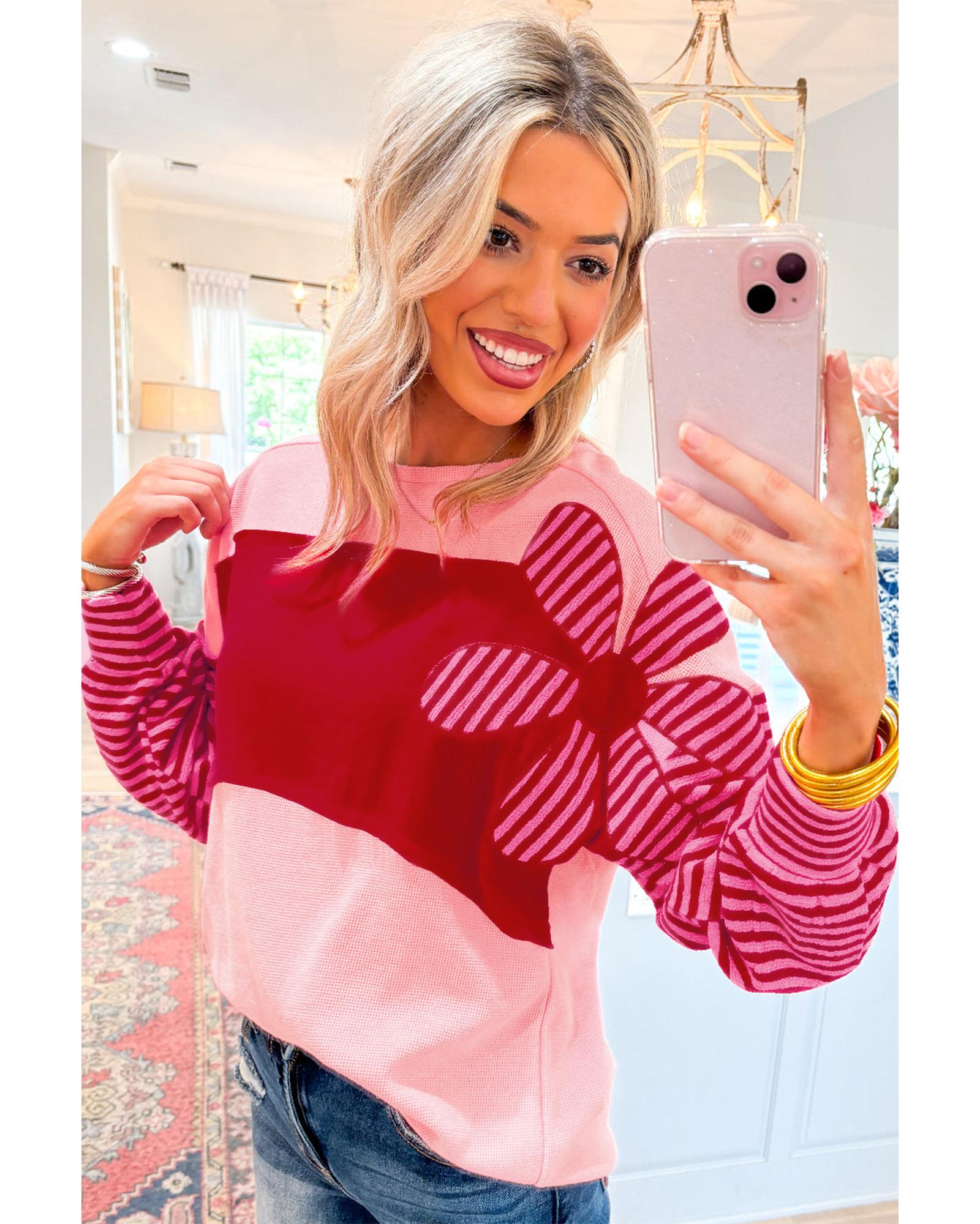 Pink Floral Patch Color Block Striped Sleeve Textured Top – M