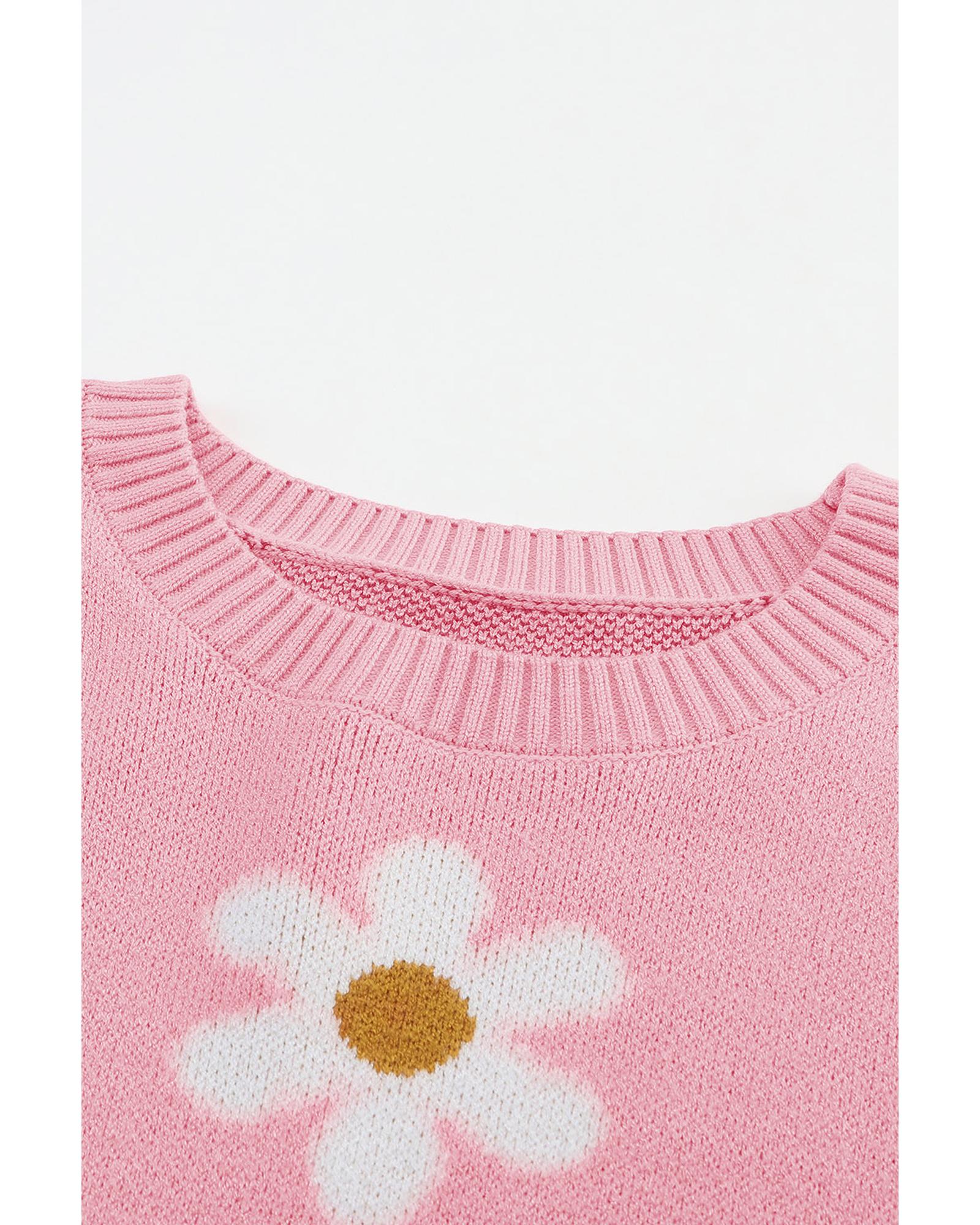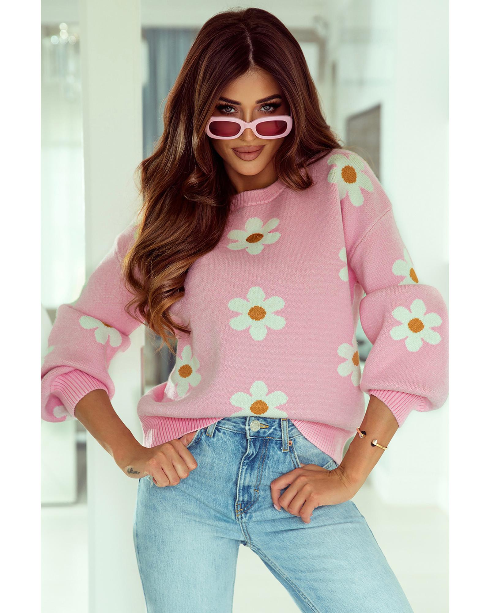 Pink Floral Pattern Drop Shoulder Sweater – L