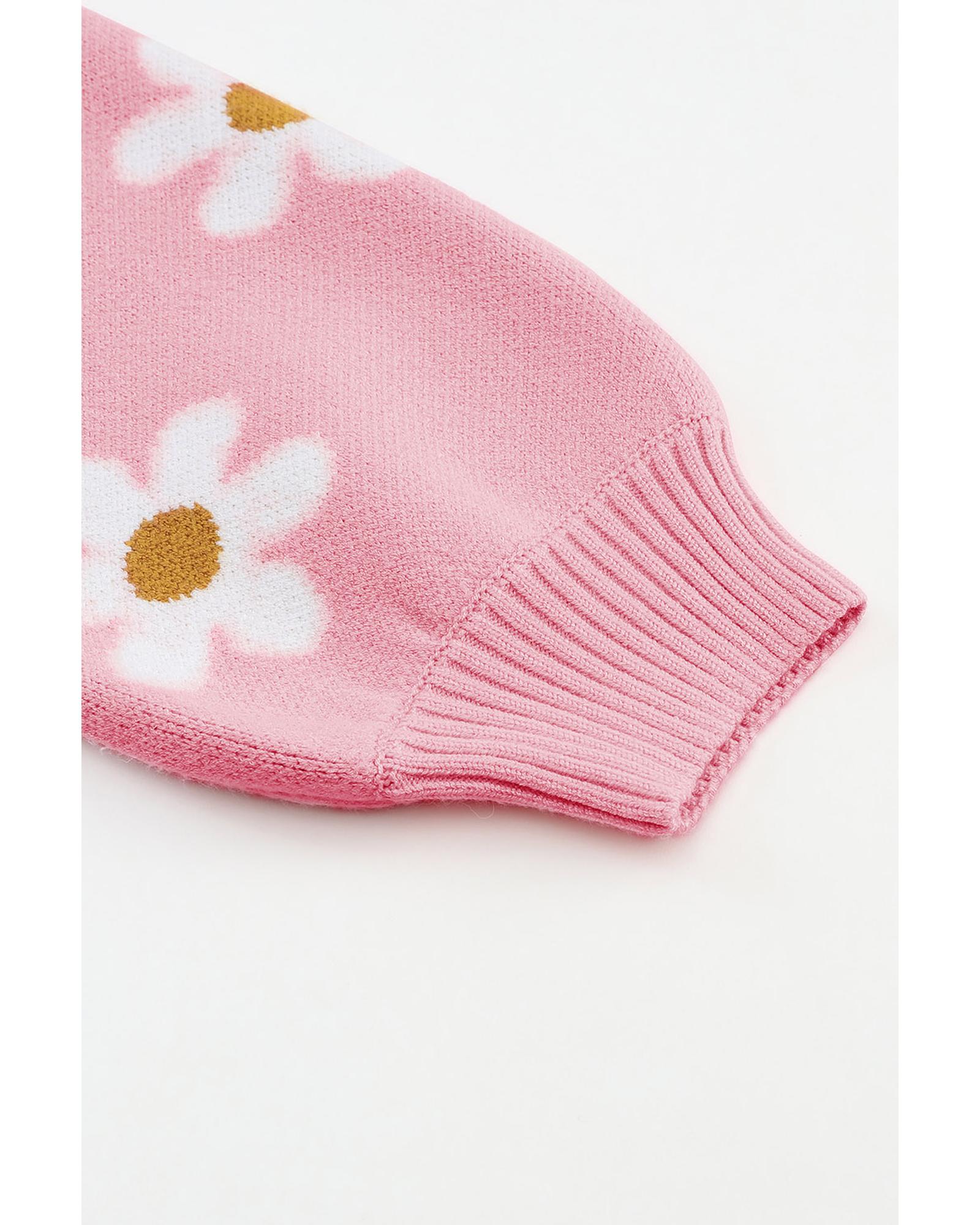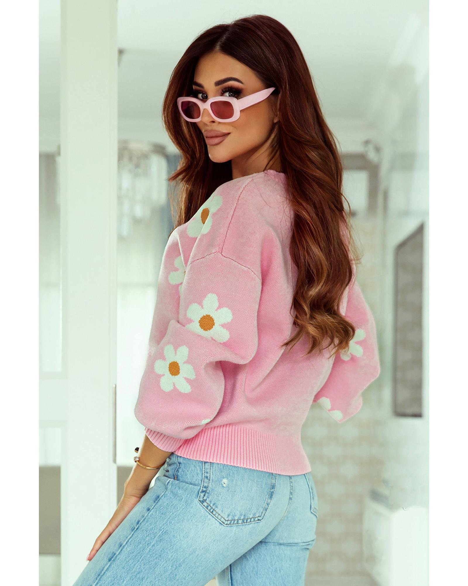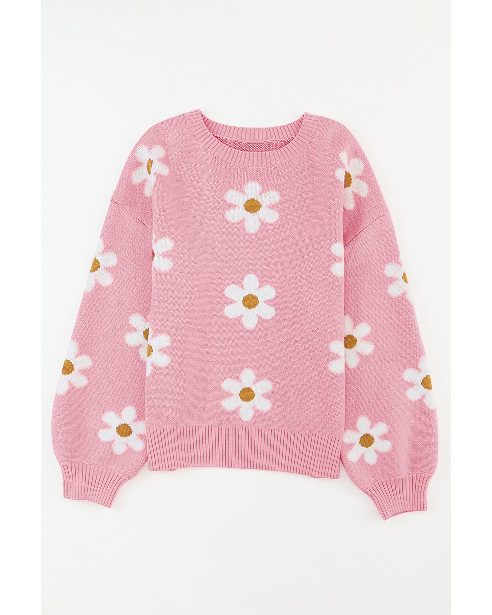 Pink Floral Pattern Drop Shoulder Sweater – M