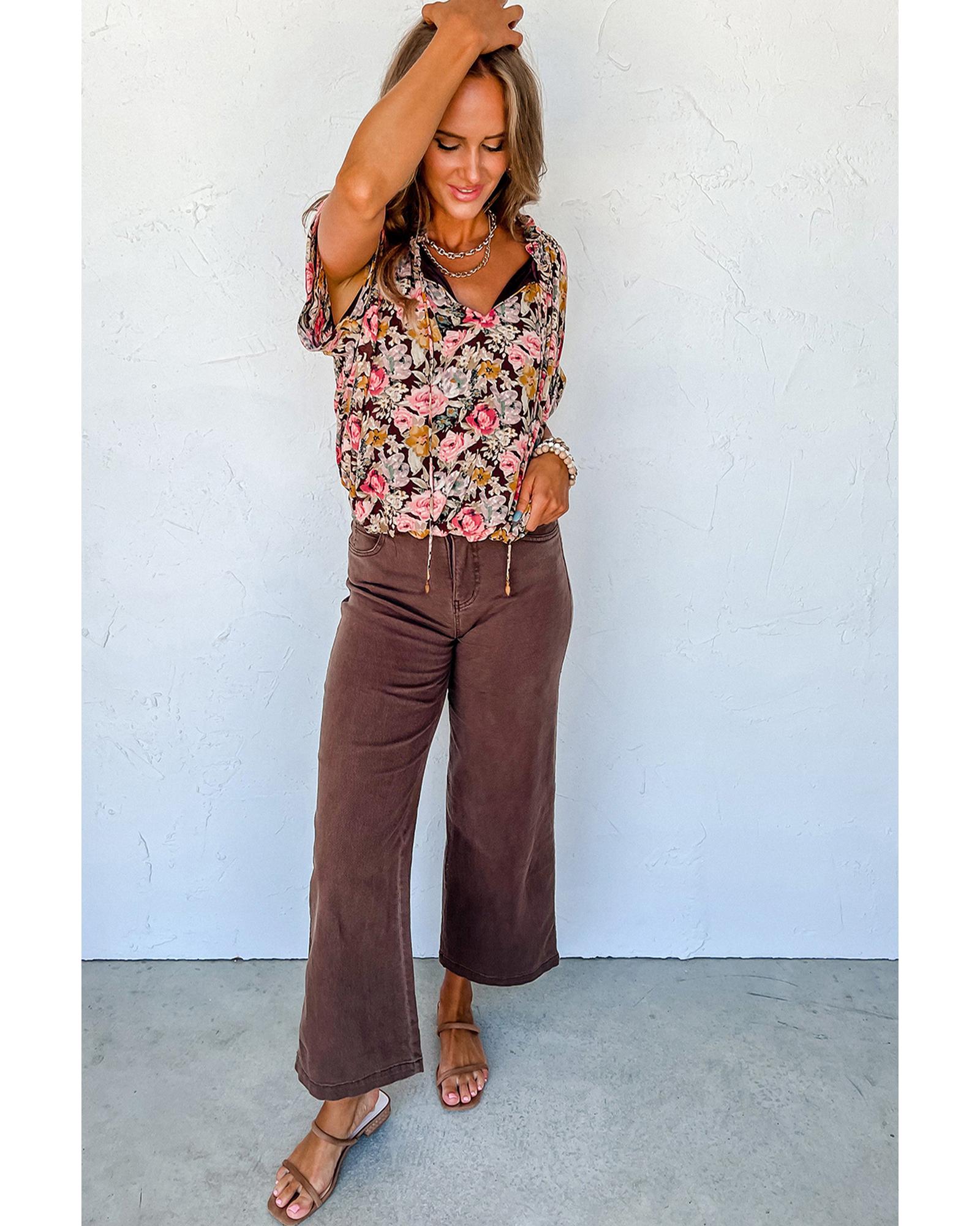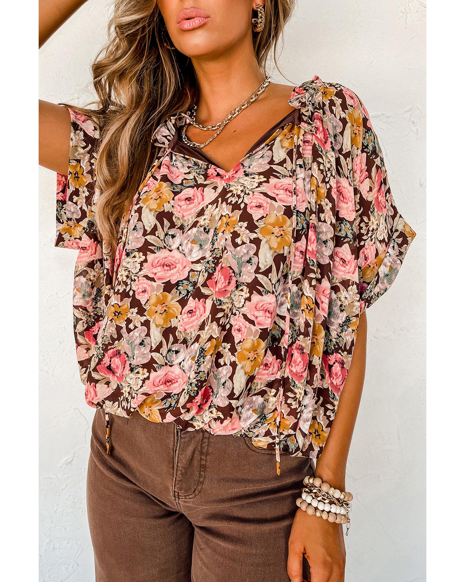 Pink Floral Print Bubble Hem Split Neck Blouse – L