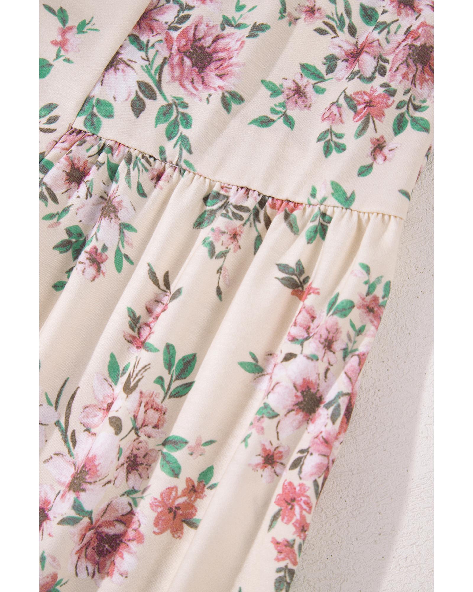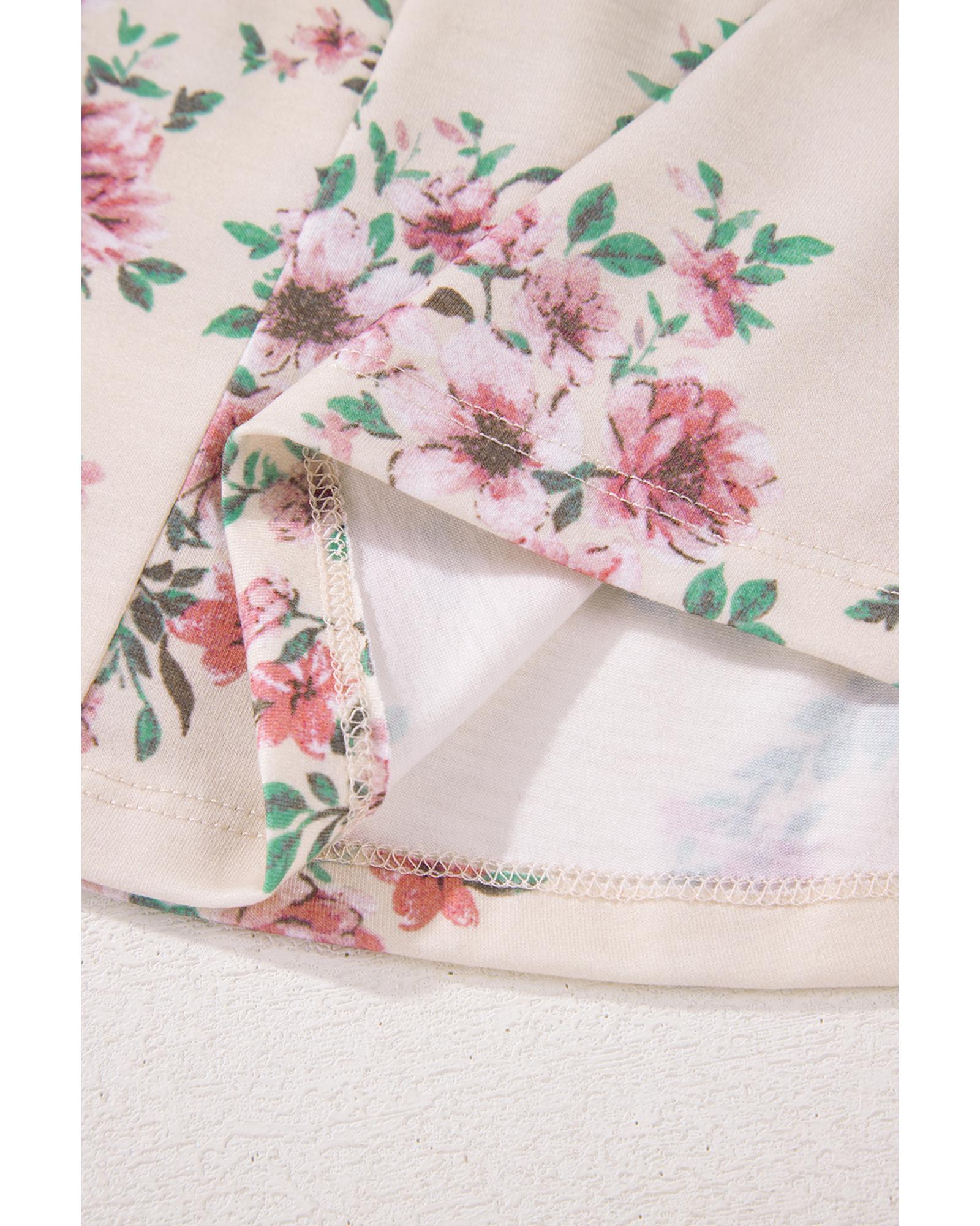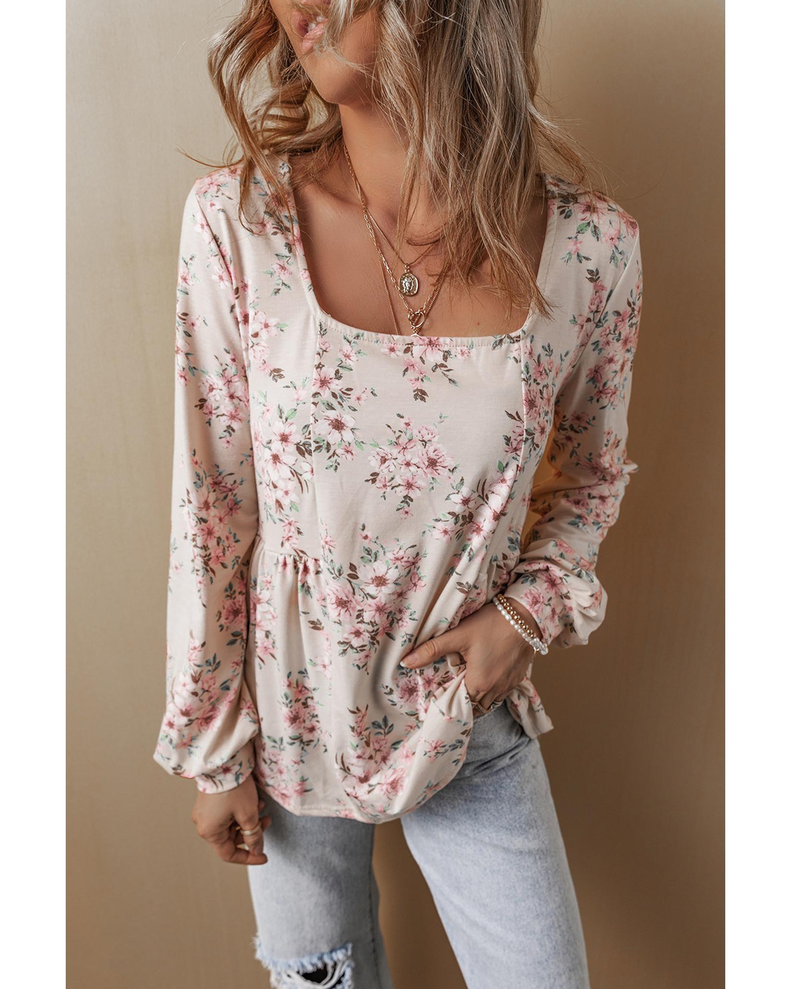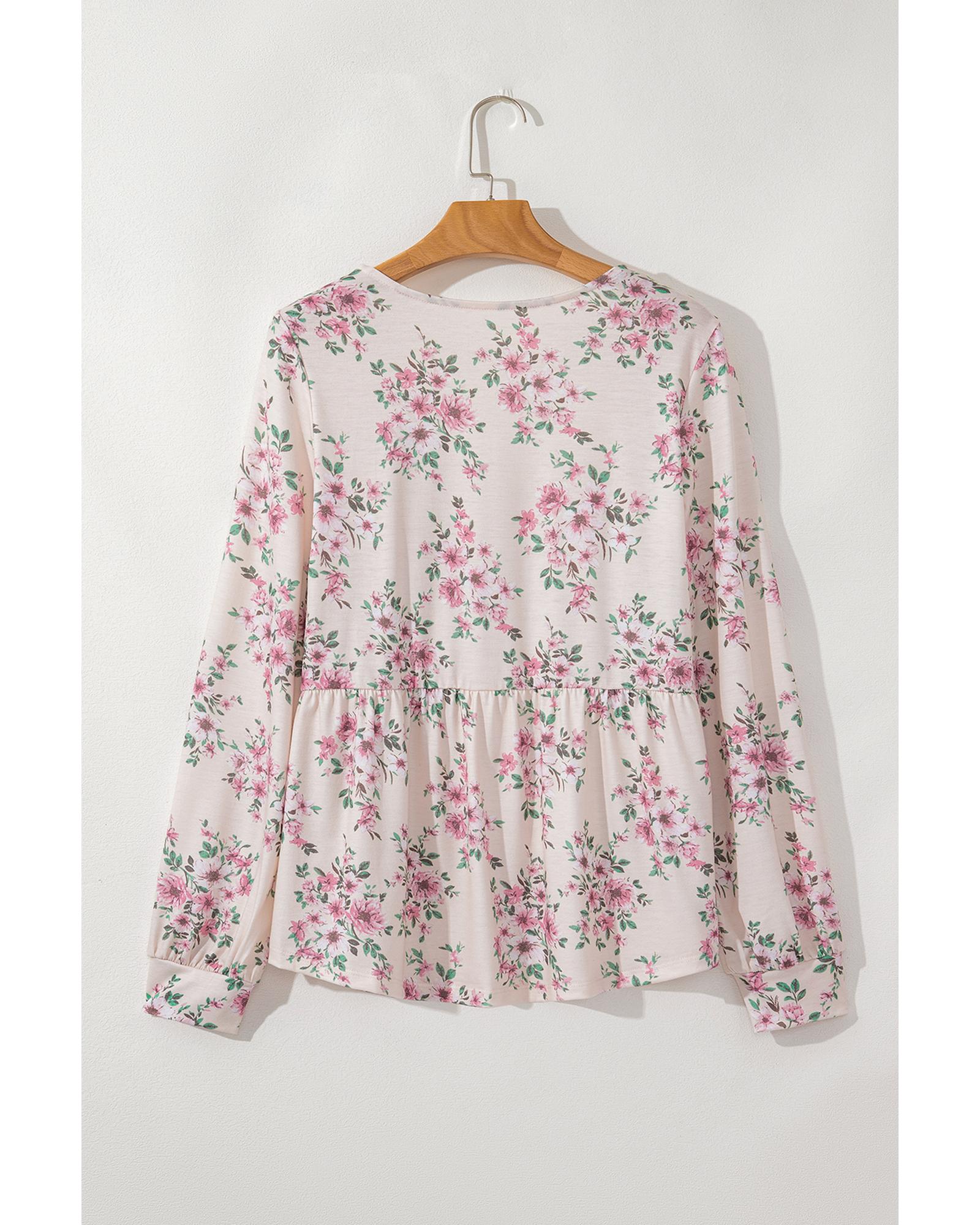 Pink Floral Print Pleated U Neck Loose Fit Blouse – M