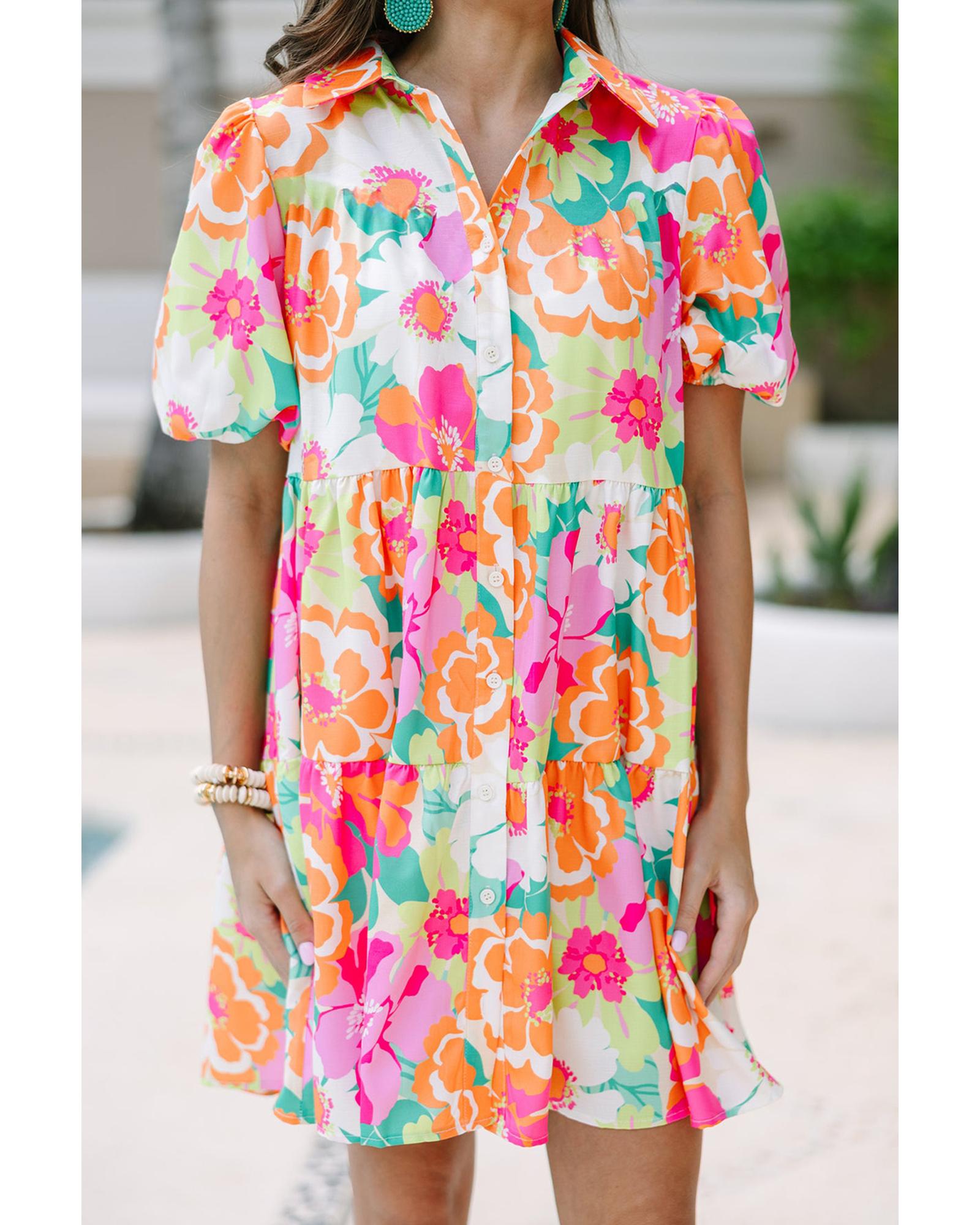 - Pink Floral Puff Sleeve Collar Buttoned Babydoll Dress