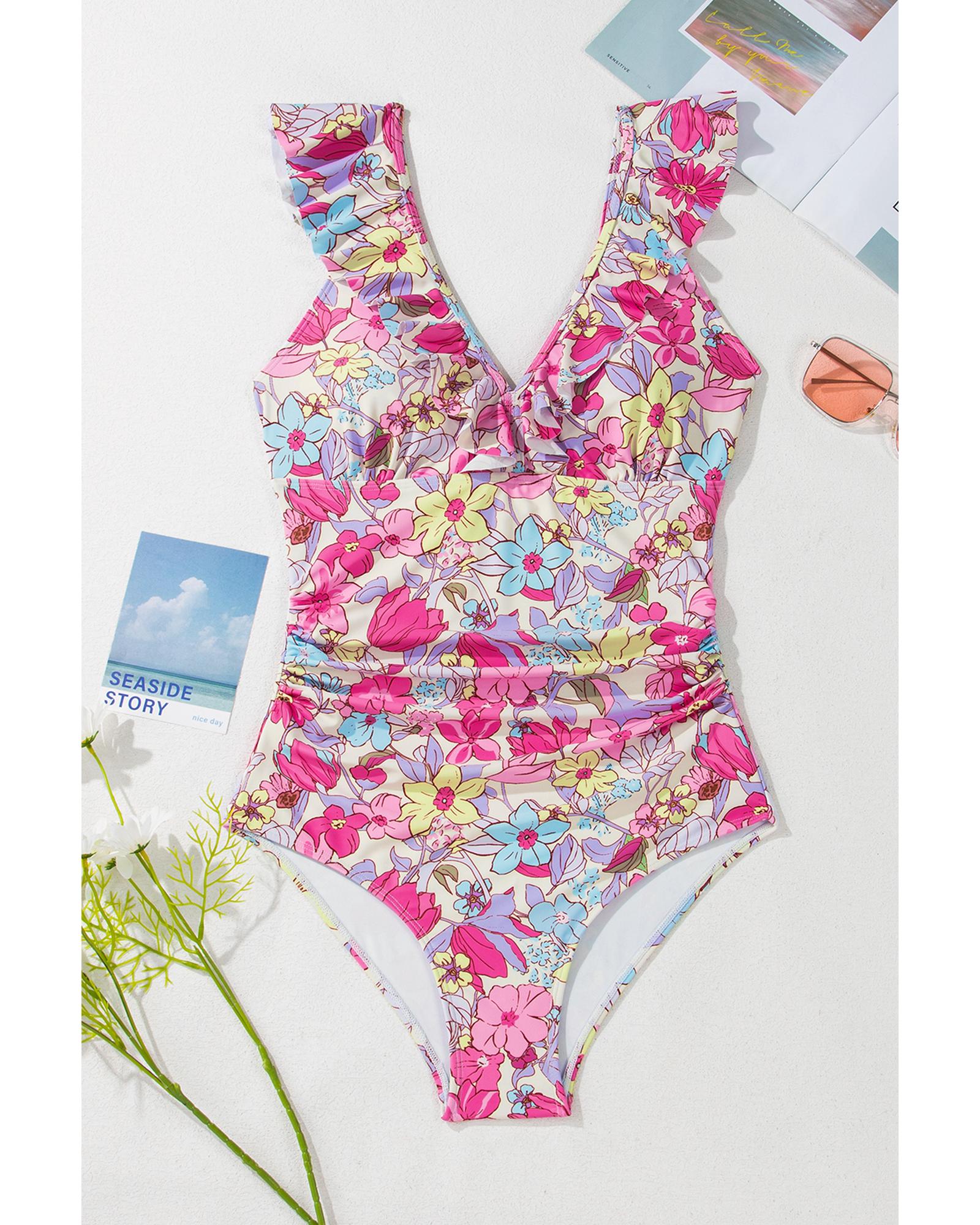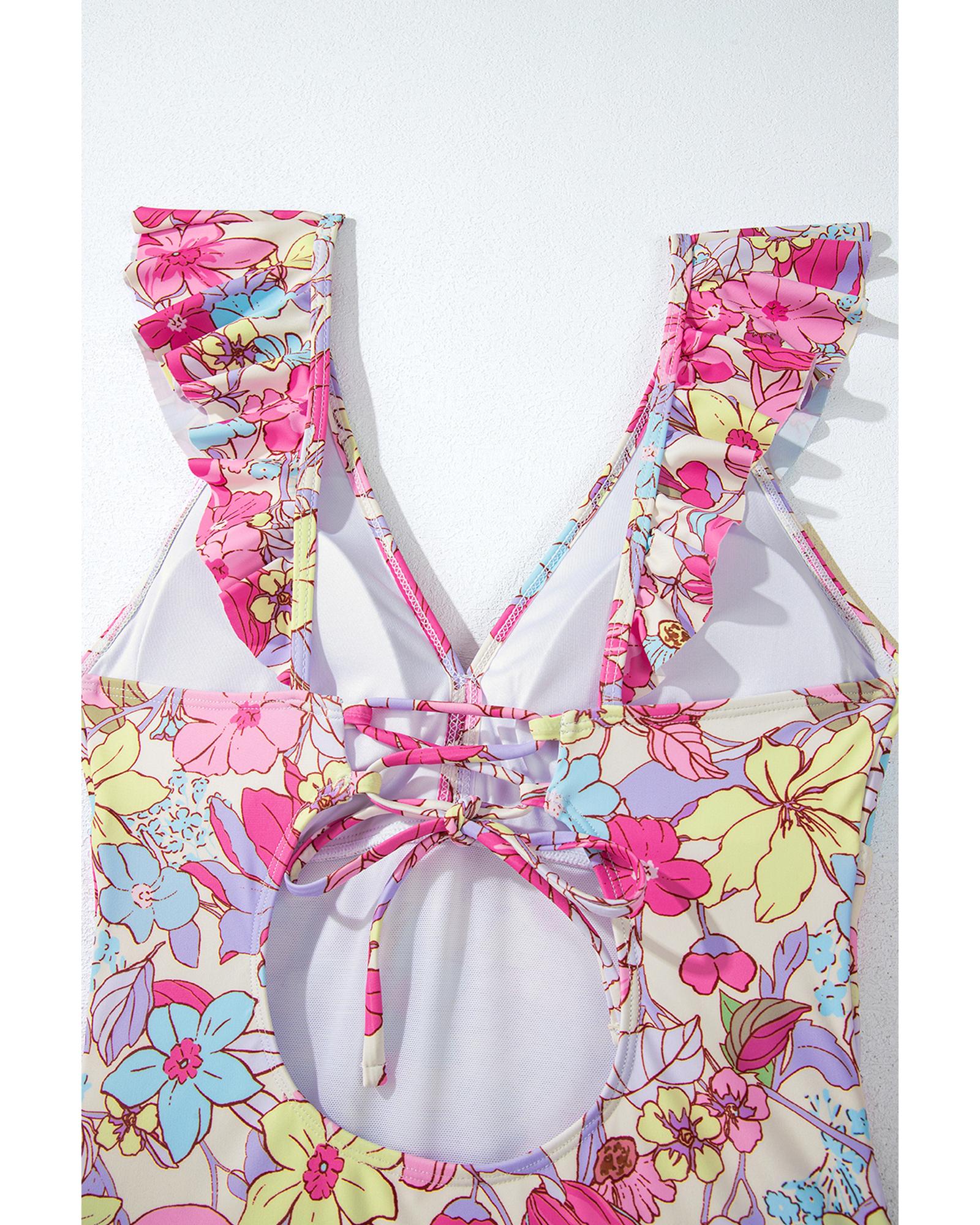 Pink Floral Ruffle Trim V Neck Lace-up Back Tummy Control One Piece Swimsuit – XL