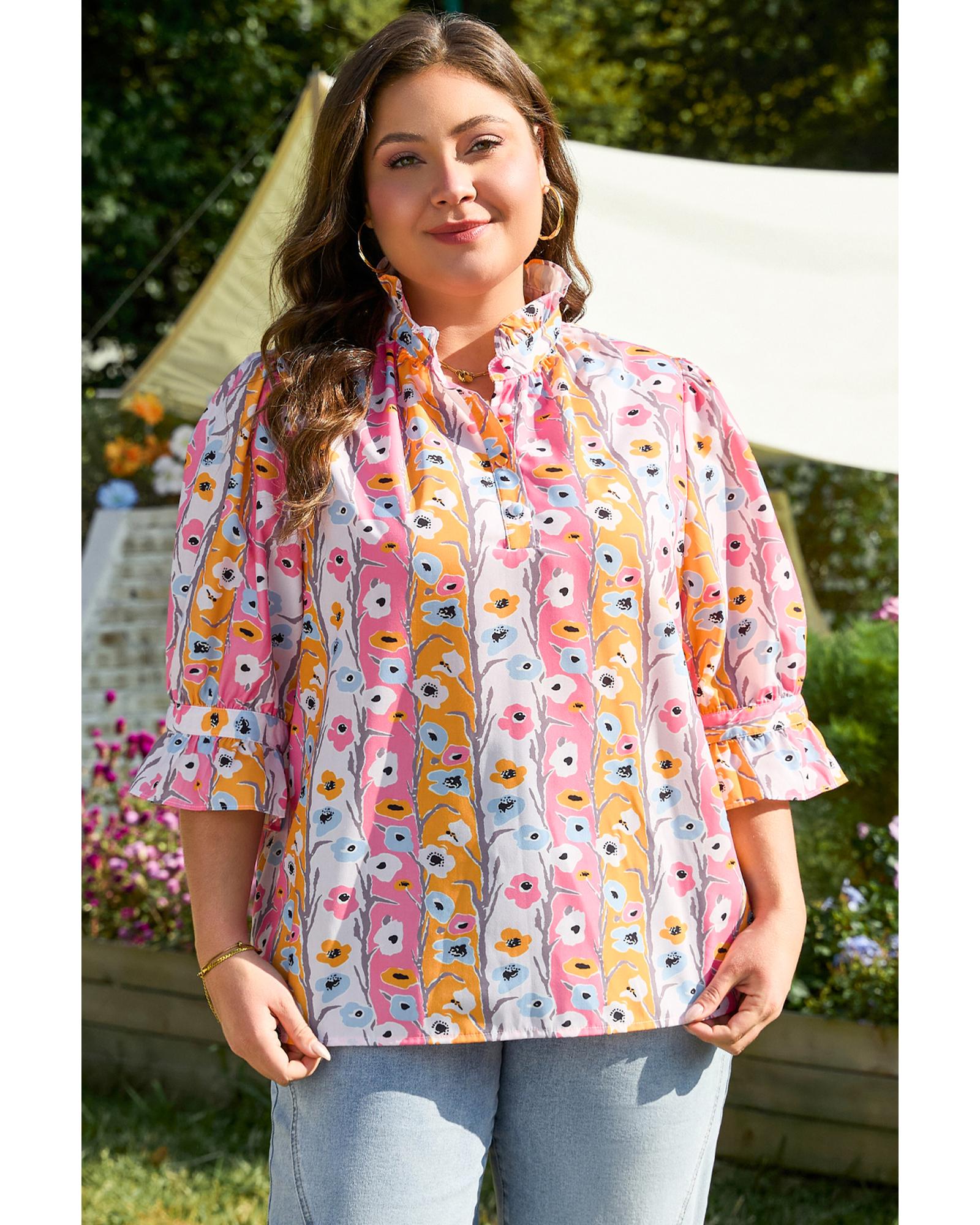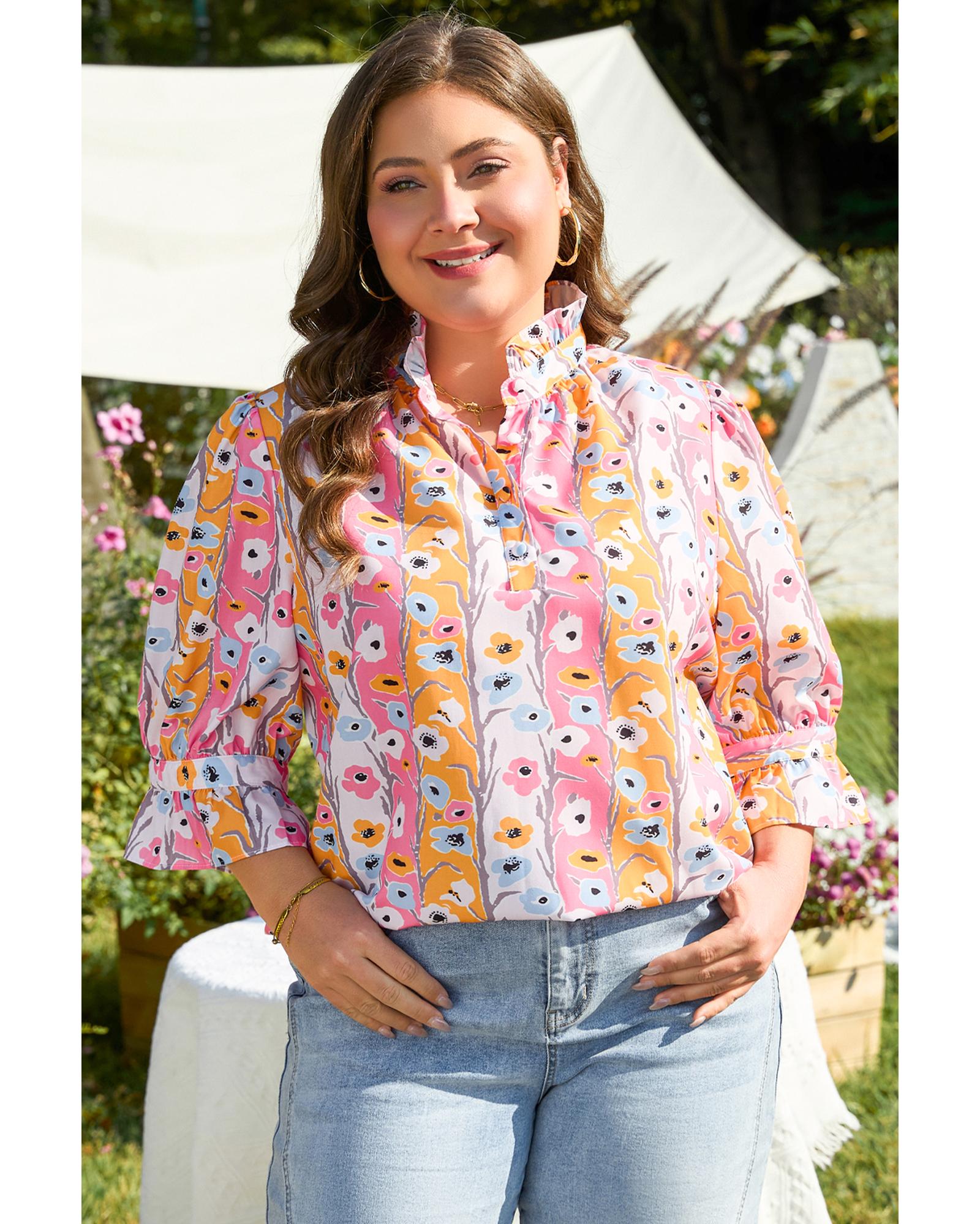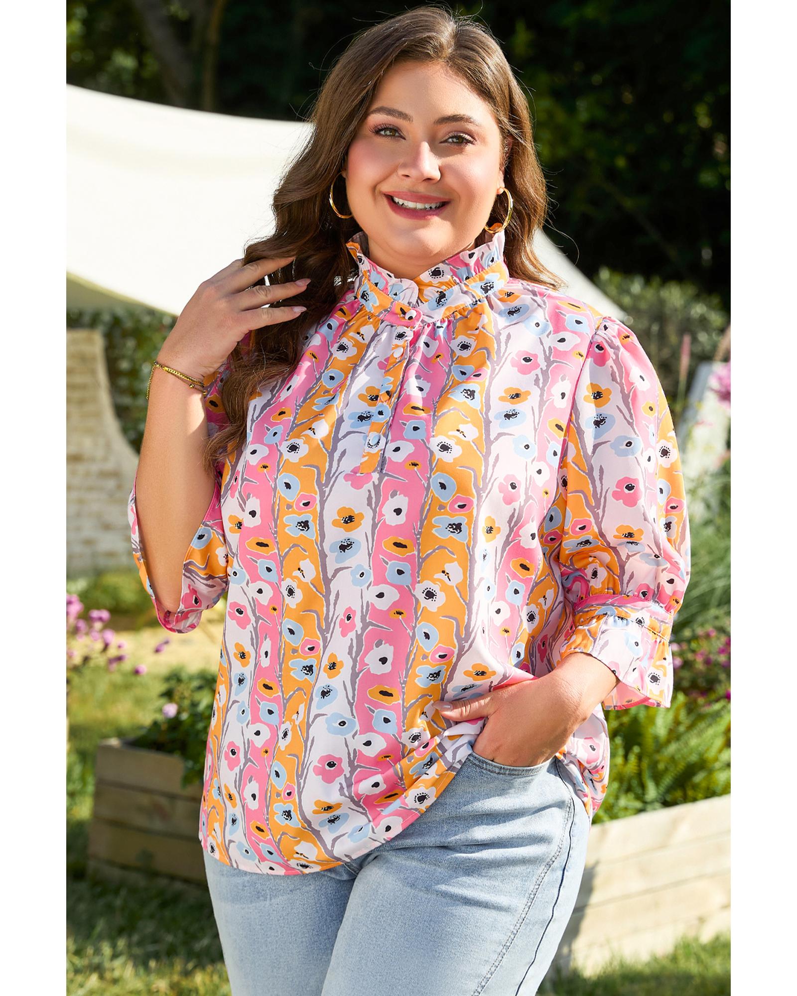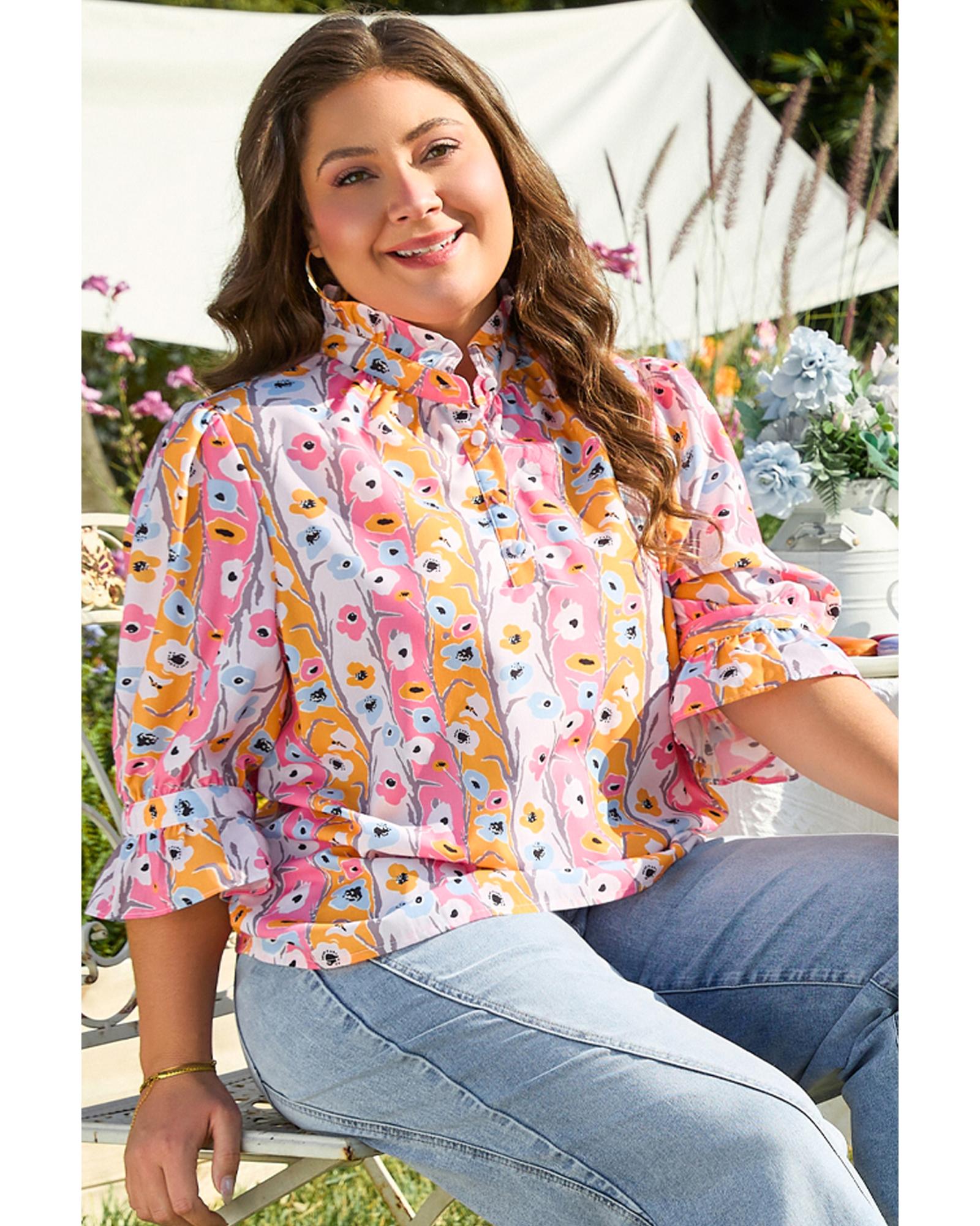 Pink Floral Ruffled Collar Bracelet Sleeve Plus Size Blouse Top – 1X