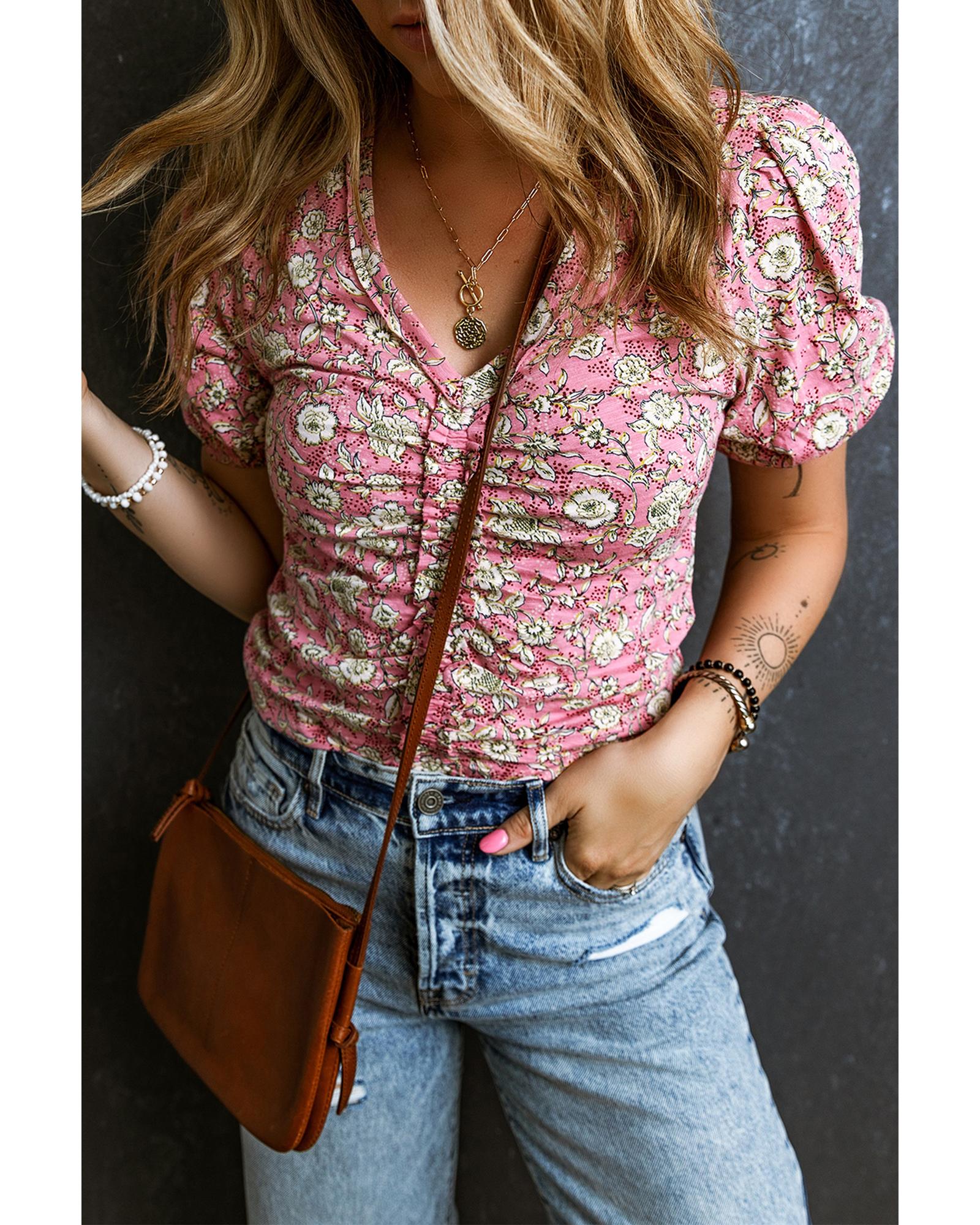 - Pink Floral Short Puff Sleeve V Neck Ruched Blouse