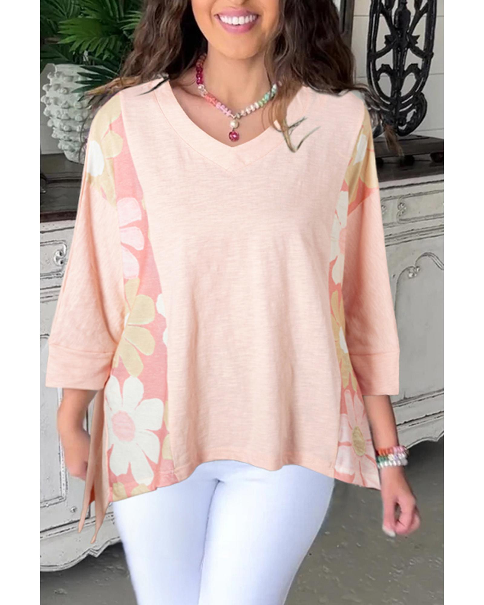 Pink Flower Patchwork Exposed Seam Oversized High Low Top – XL