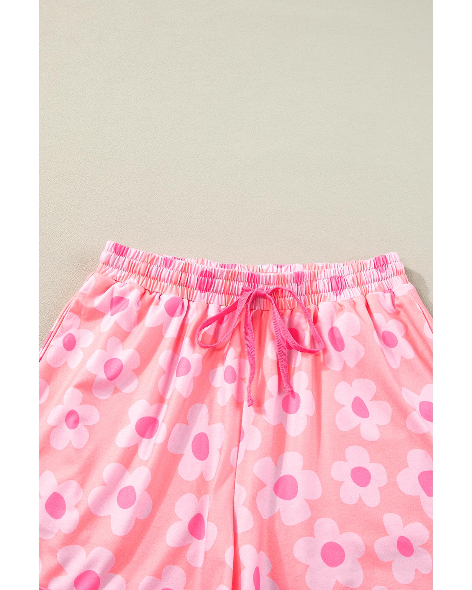 • Sweet and stylish Pink Flower Print Short Sleeve Shirt Pajamas Set