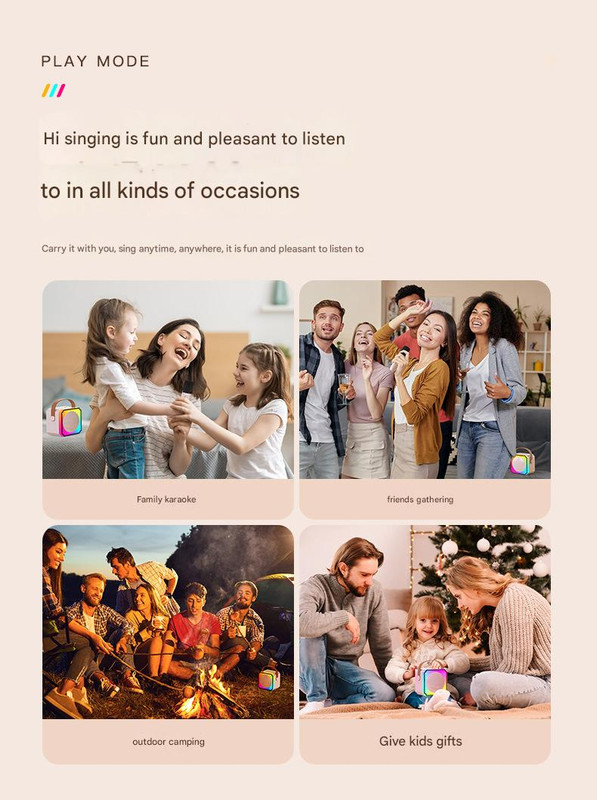 Bring the party anywhere with this fun and stylish Portable Mini Karaoke Machine & Bluetooth Speaker! Combining a high-quality Bluetooth speaker, a wireless microphone, and dazzling RGB lighting effects, this compact system is perfect for home KTV nights, family gatherings, kids’ parties, outdoor camping, and more.