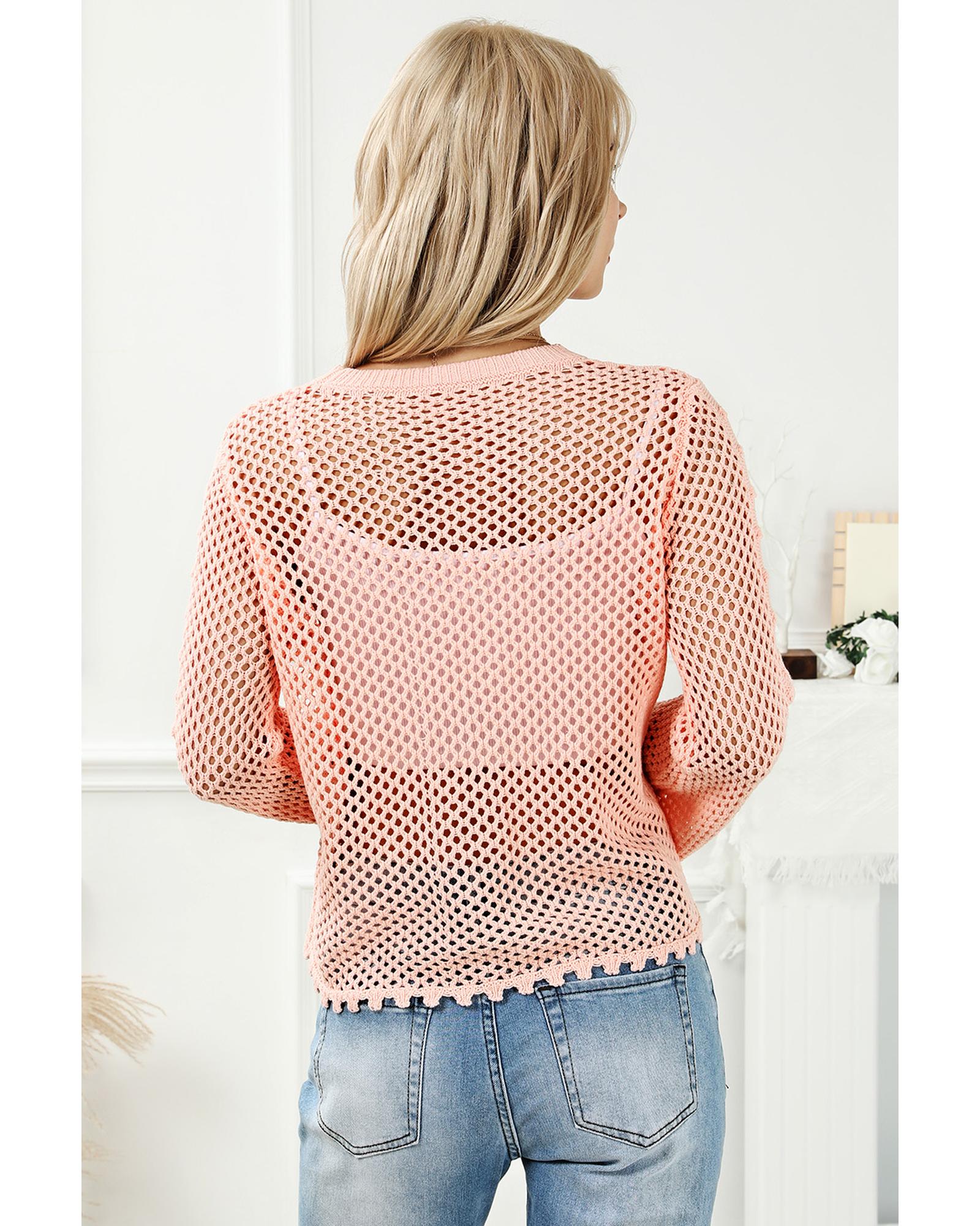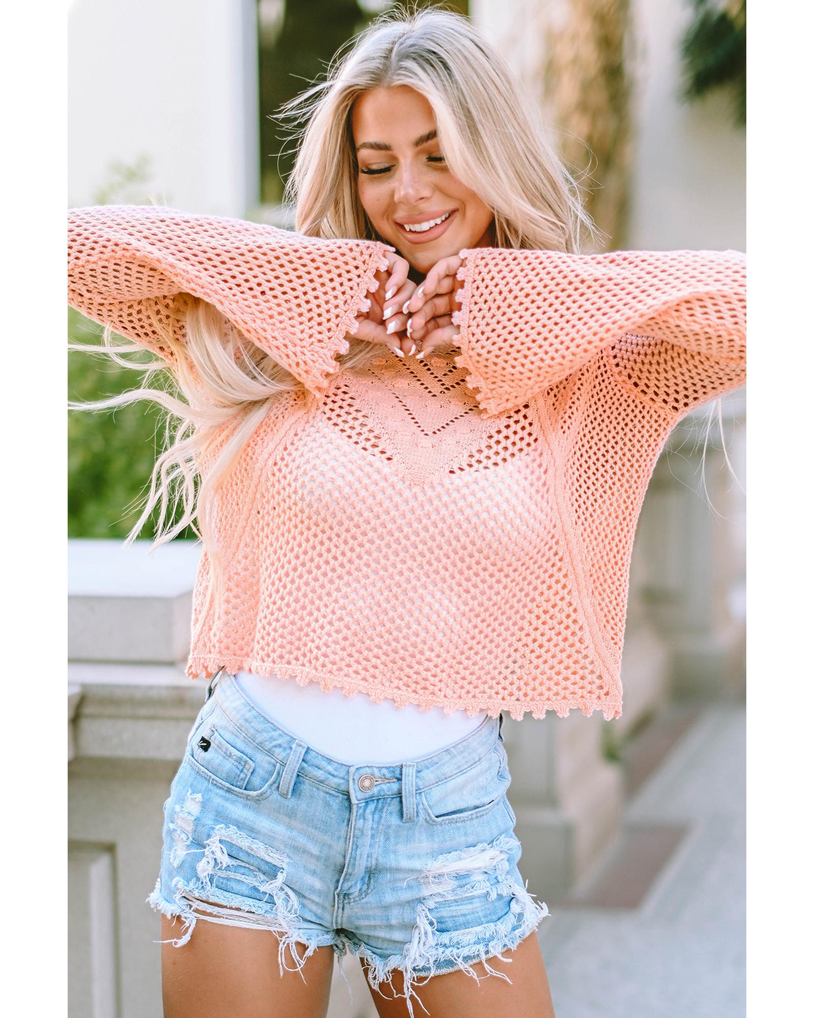 Pink Hollowed Eyelets Knit Bell Sleeve Sweater – L