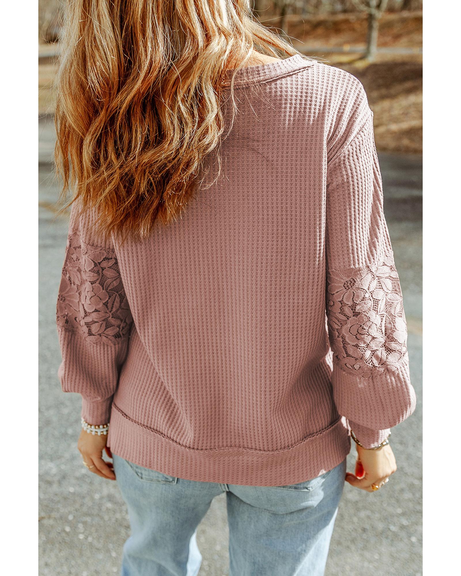 • Pink Lace Waffle Patchwork Strappy V Neck Long Sleeve Top
