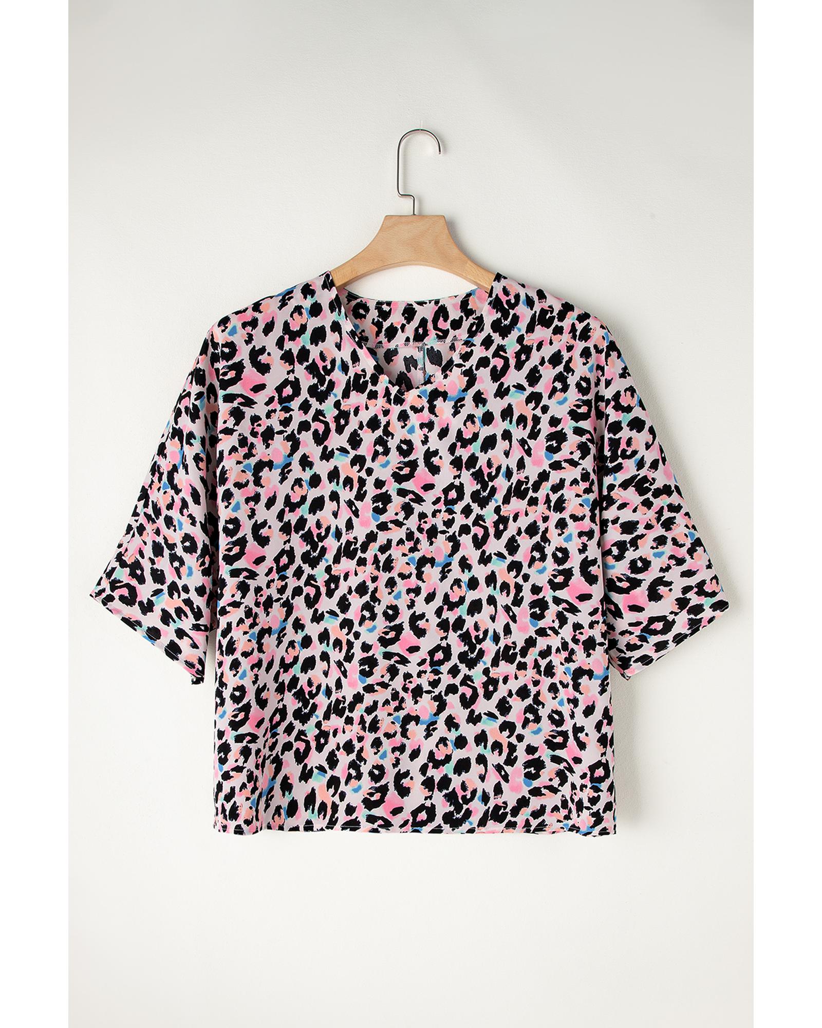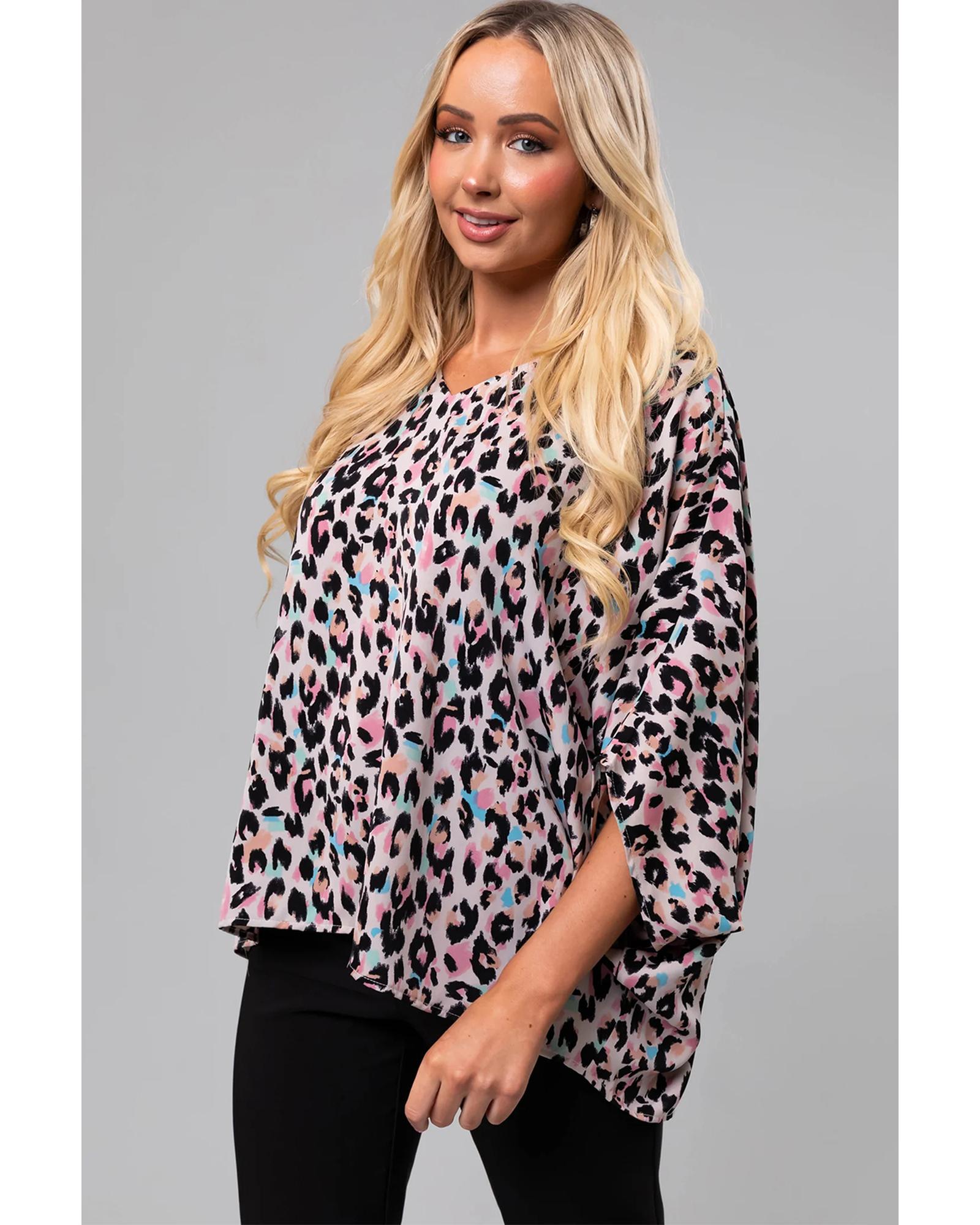 • Pink Multicolor Leopard Print V Neck Oversized Blouse
