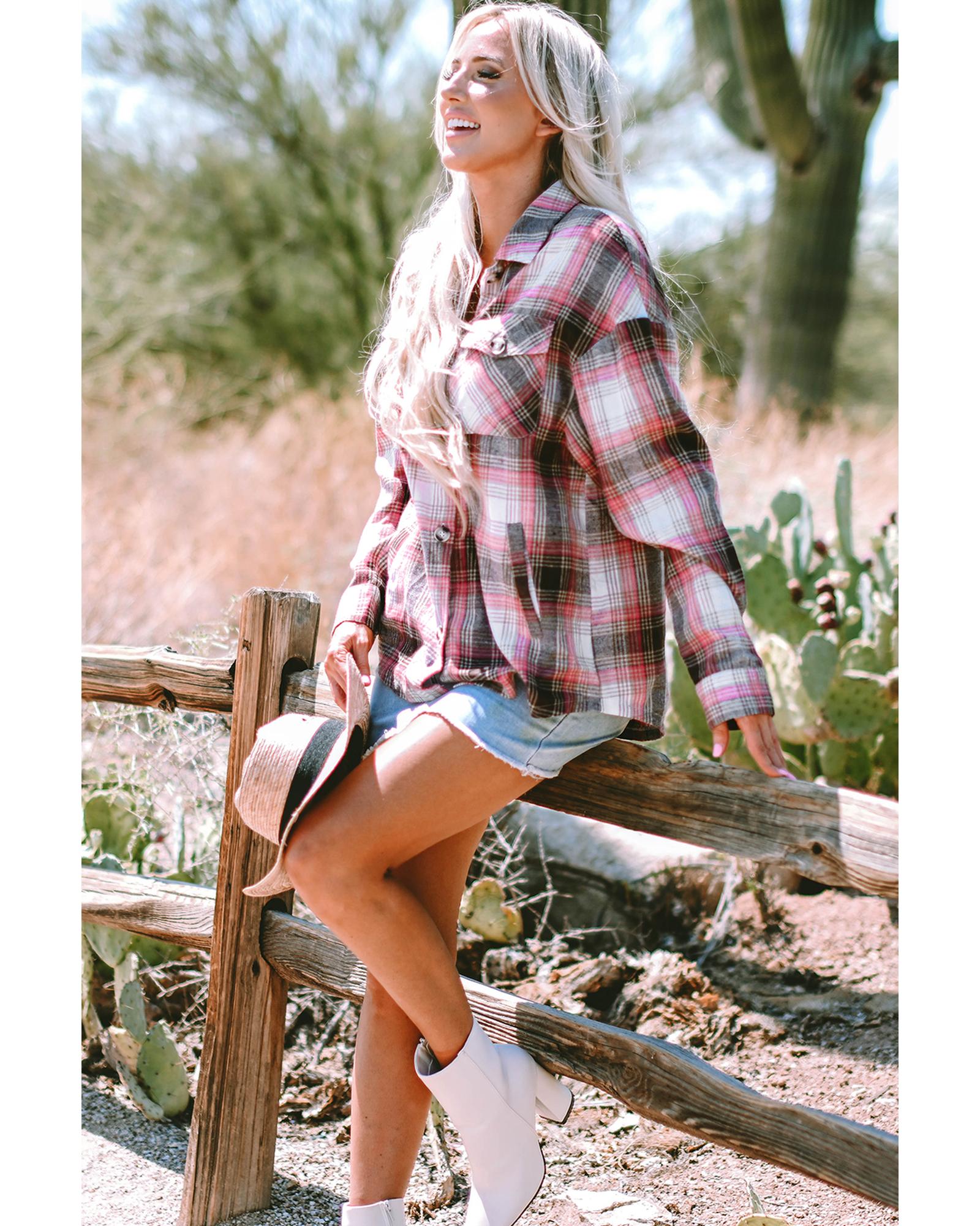 Pink Plaid Flap Pocket Button Up Shacket – 2XL