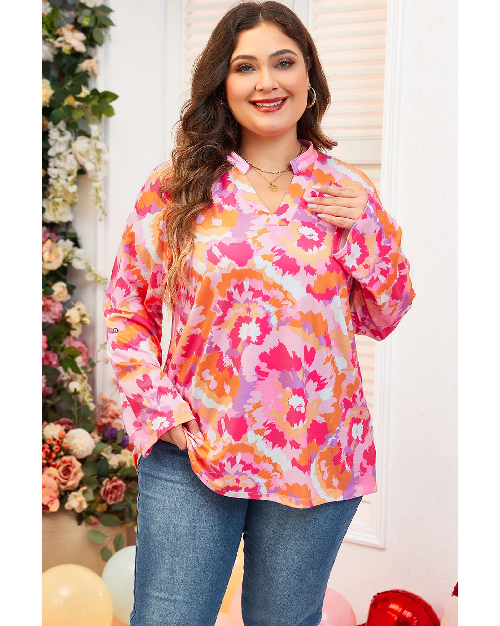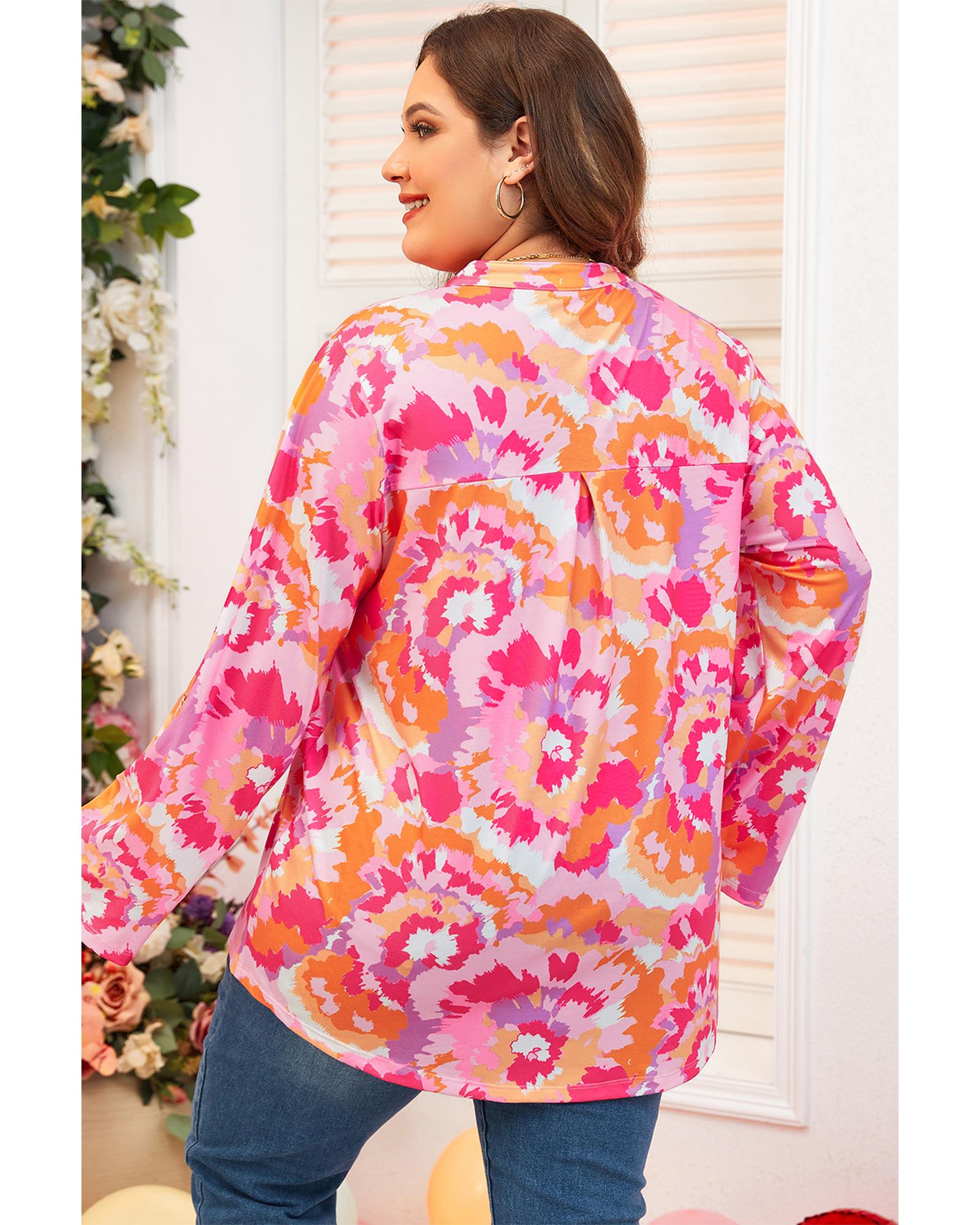 Pink Plus Size Abstract Floral Print V Neck Blouse - 2X