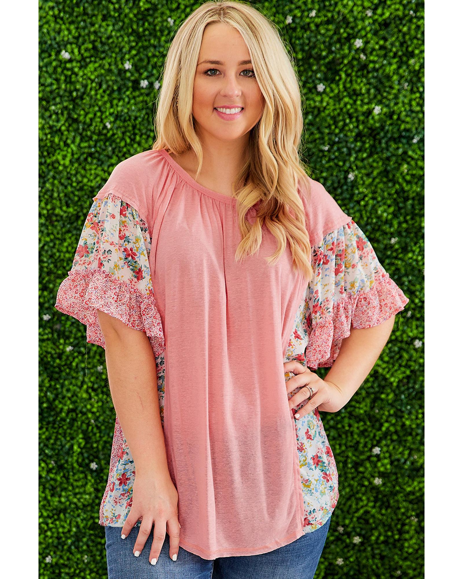 Pink Plus Size Floral Patchwork Ruffled Short Sleeve Blouse – 3X