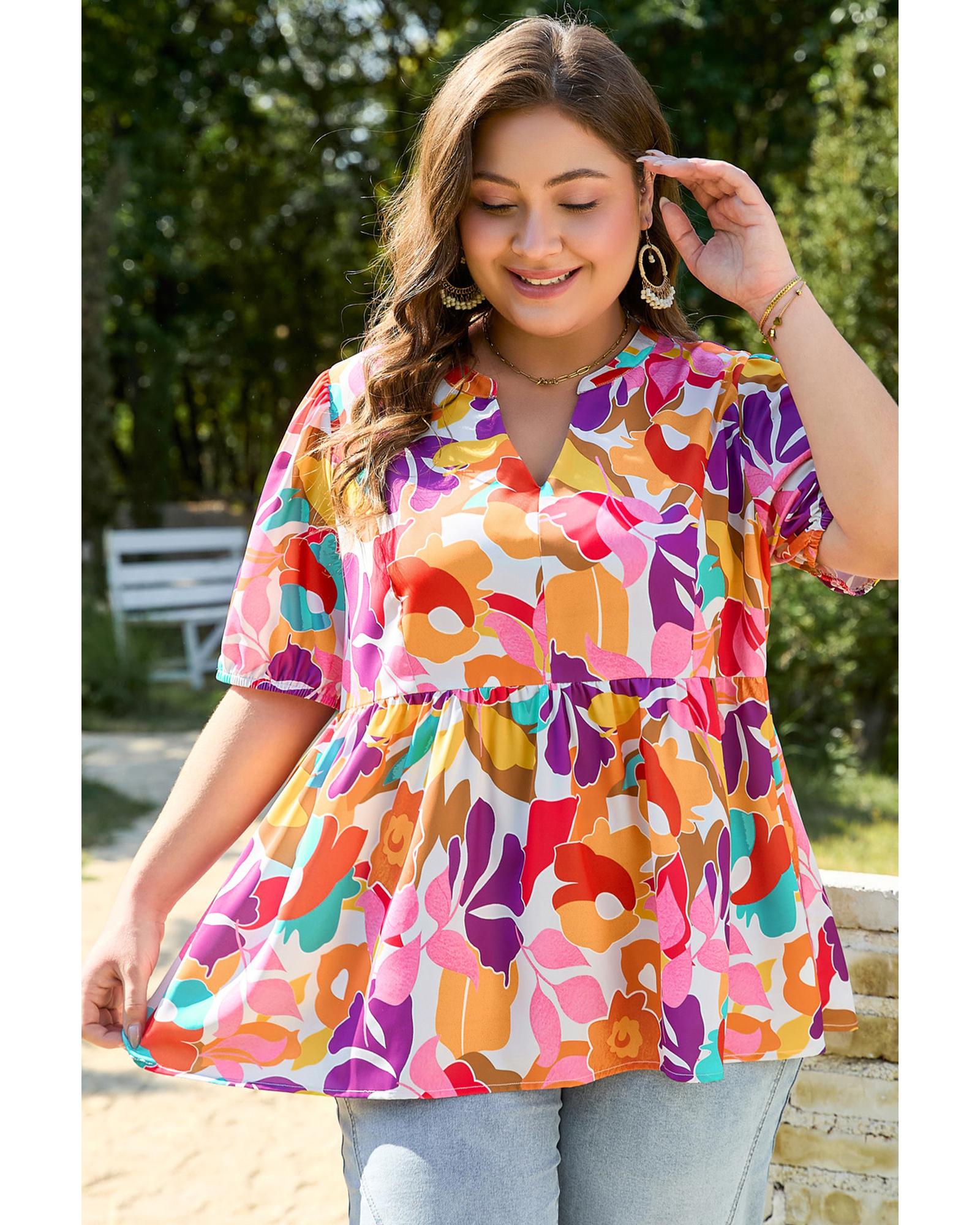 Pink Plus Size Floral Print V Neck Fit and Flare Blouse – 2X
