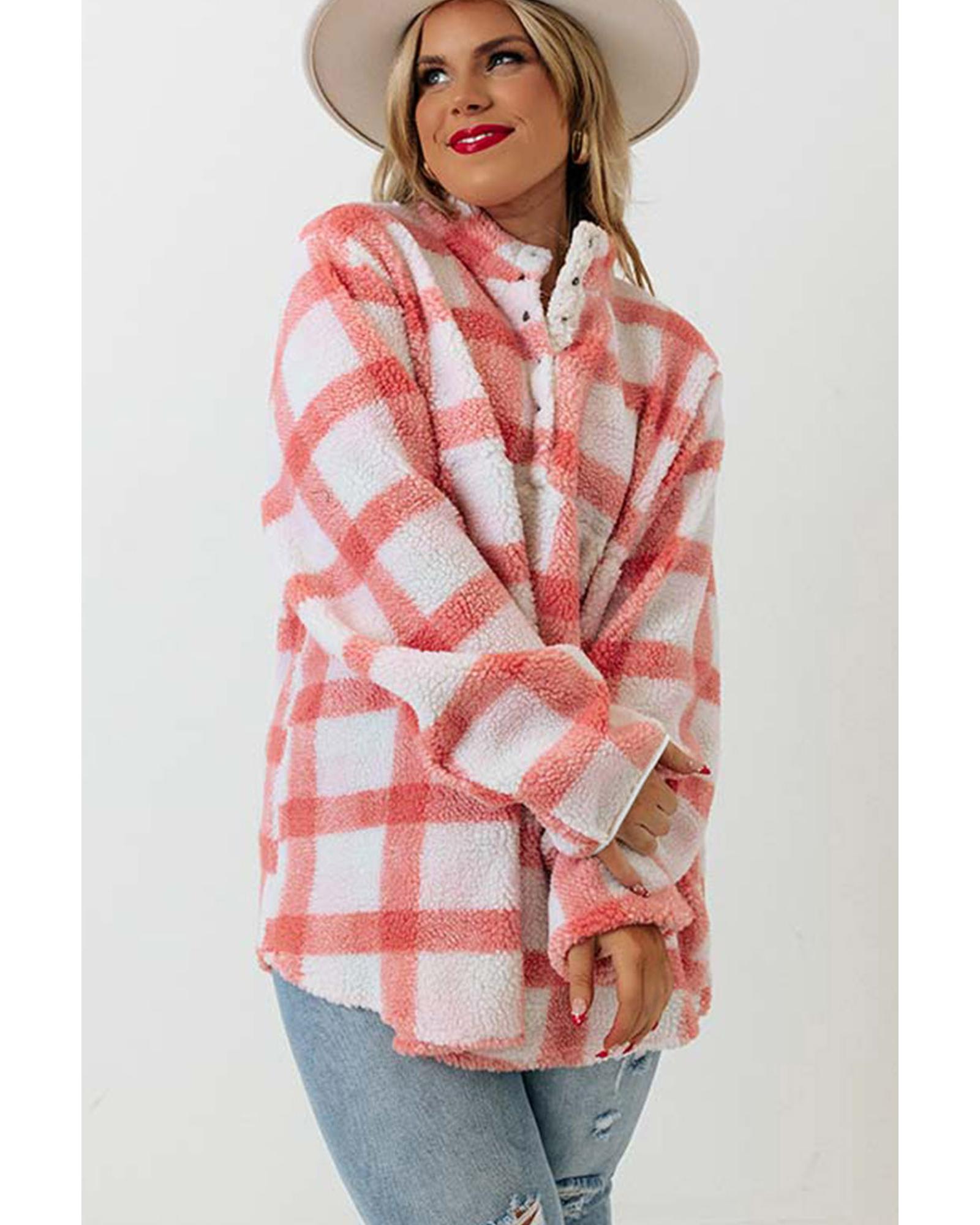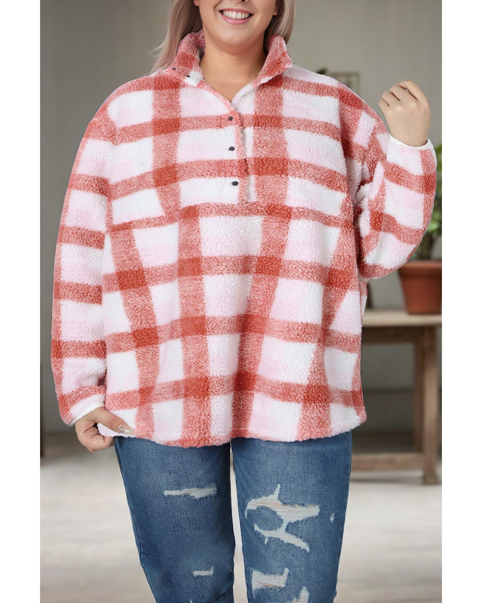 - Stay cozy and fashionable with our Pink Plus Size Tunic Plaid Sherpa Henley Sweatshirt