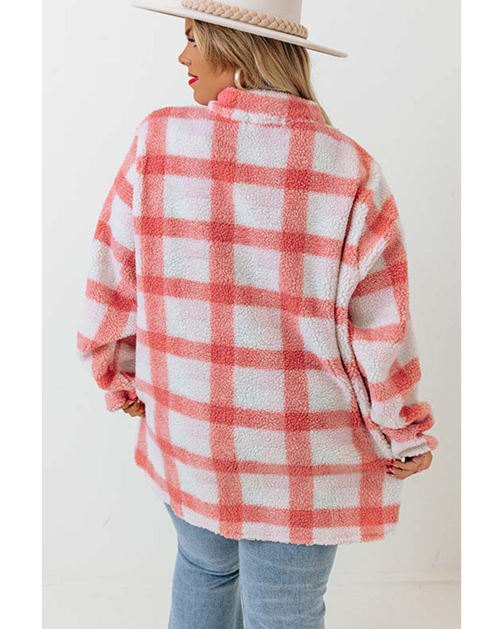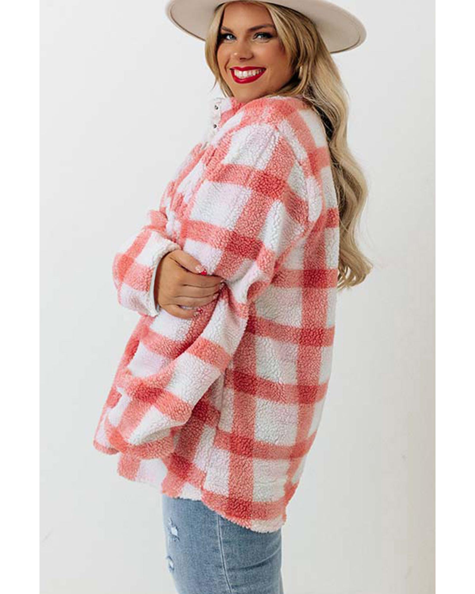Pink Plus Size Tunic Plaid Sherpa Henley Sweatshirt – 3X