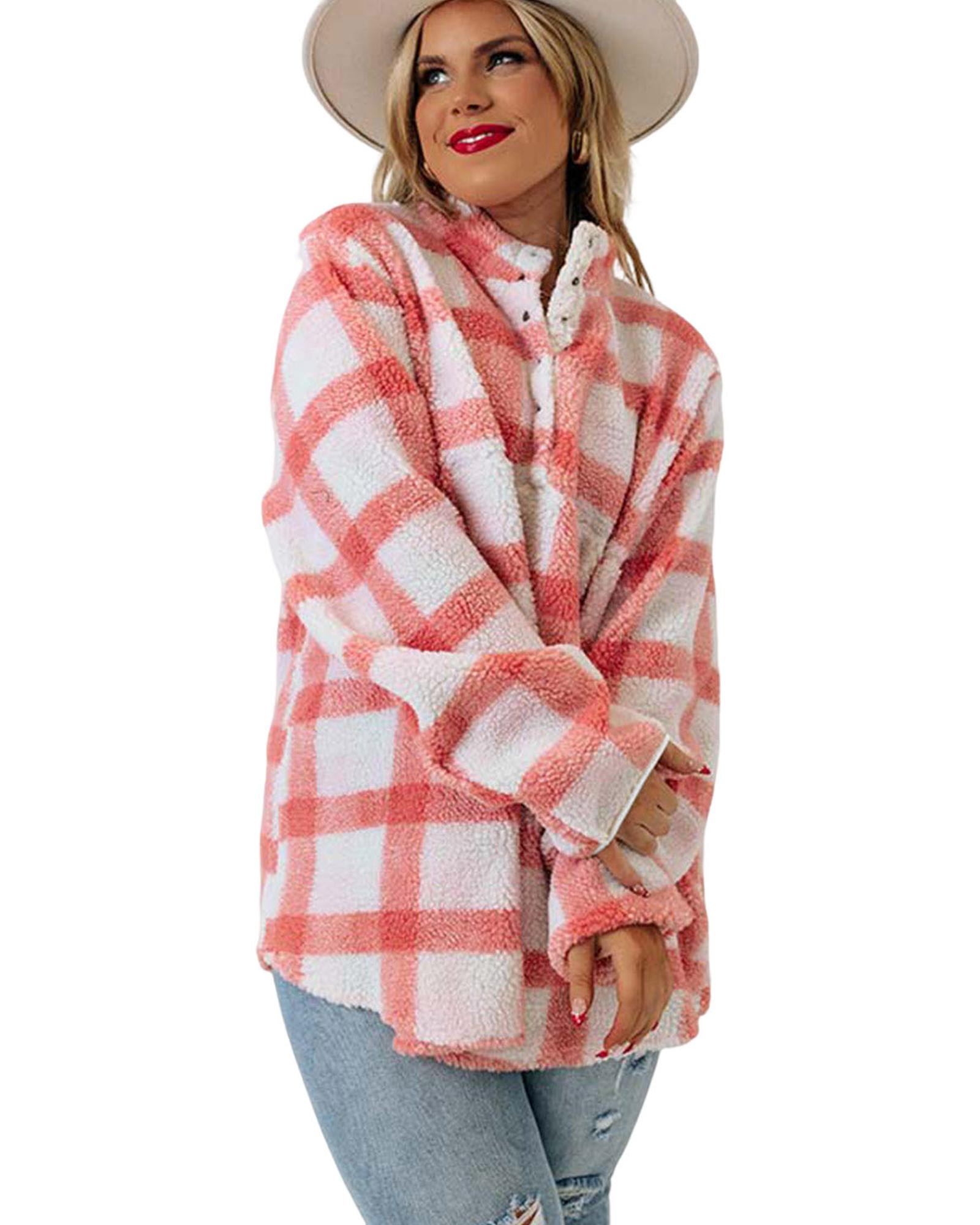 - Stay cozy and fashionable with our Pink Plus Size Tunic Plaid Sherpa Henley Sweatshirt