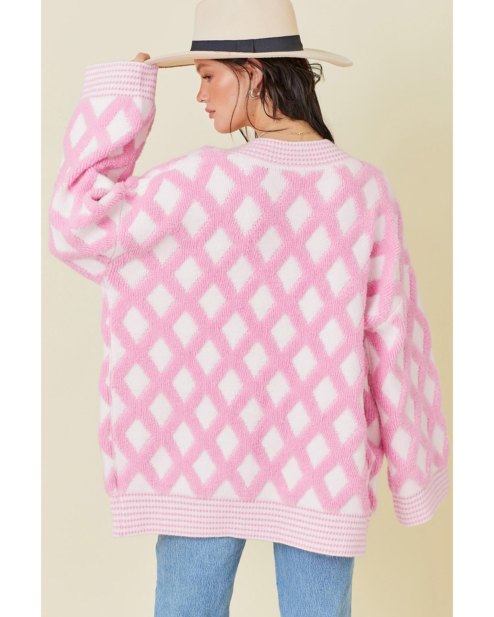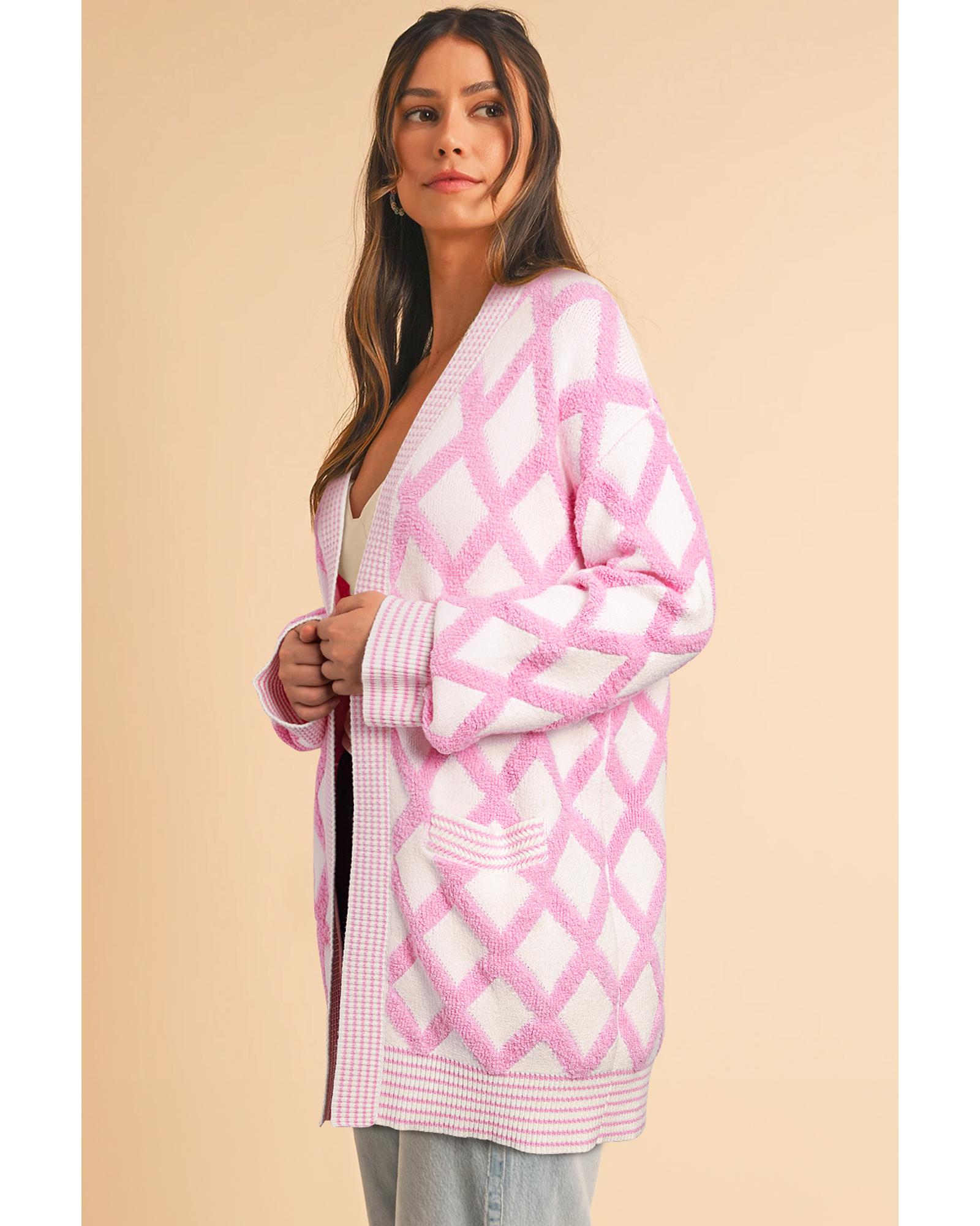 - Pink Rhombus Pattern Knit Open Front Pocketed Cardigans