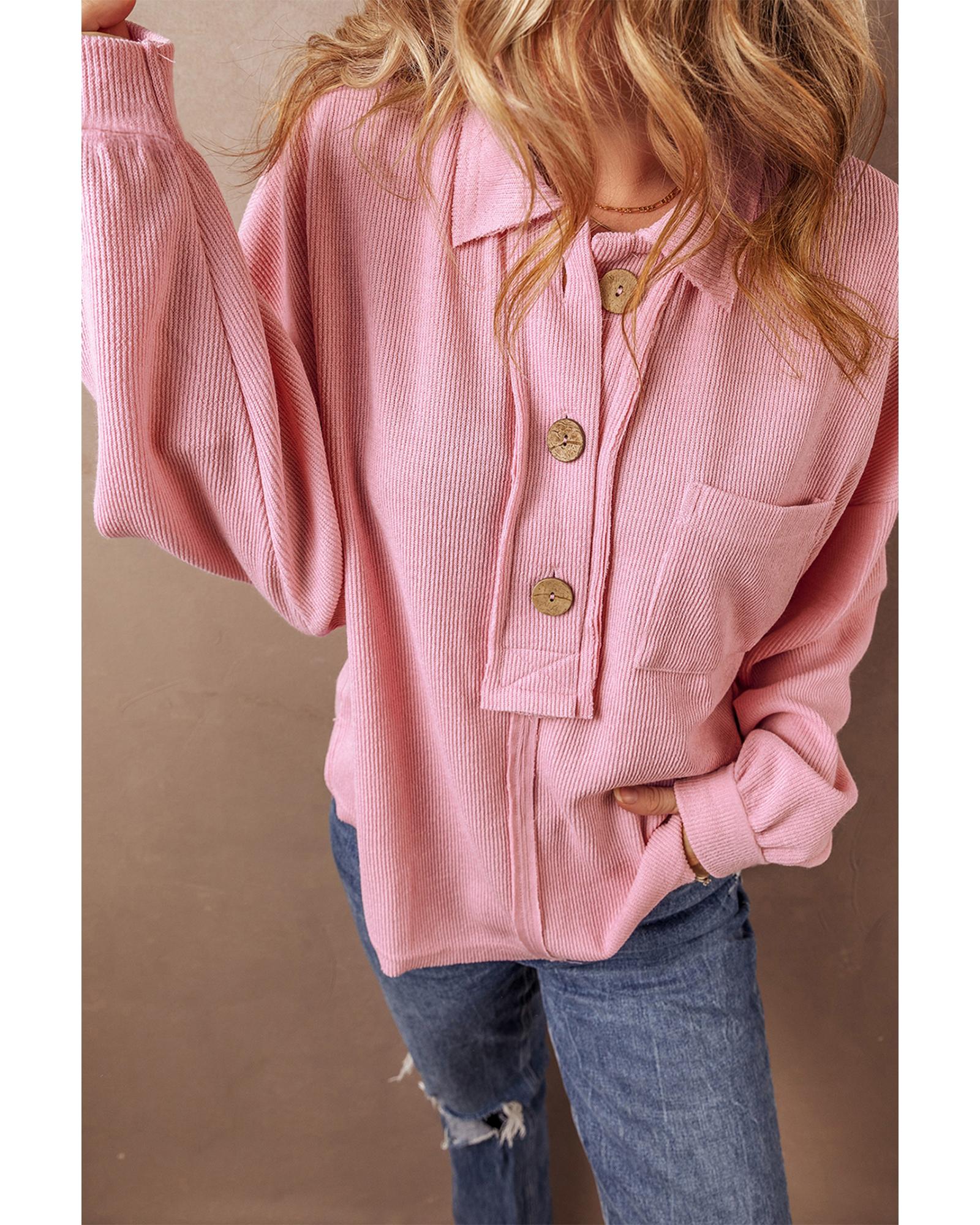 Pink Ribbed Knit Collared Henley Top with Chest Pocket – M