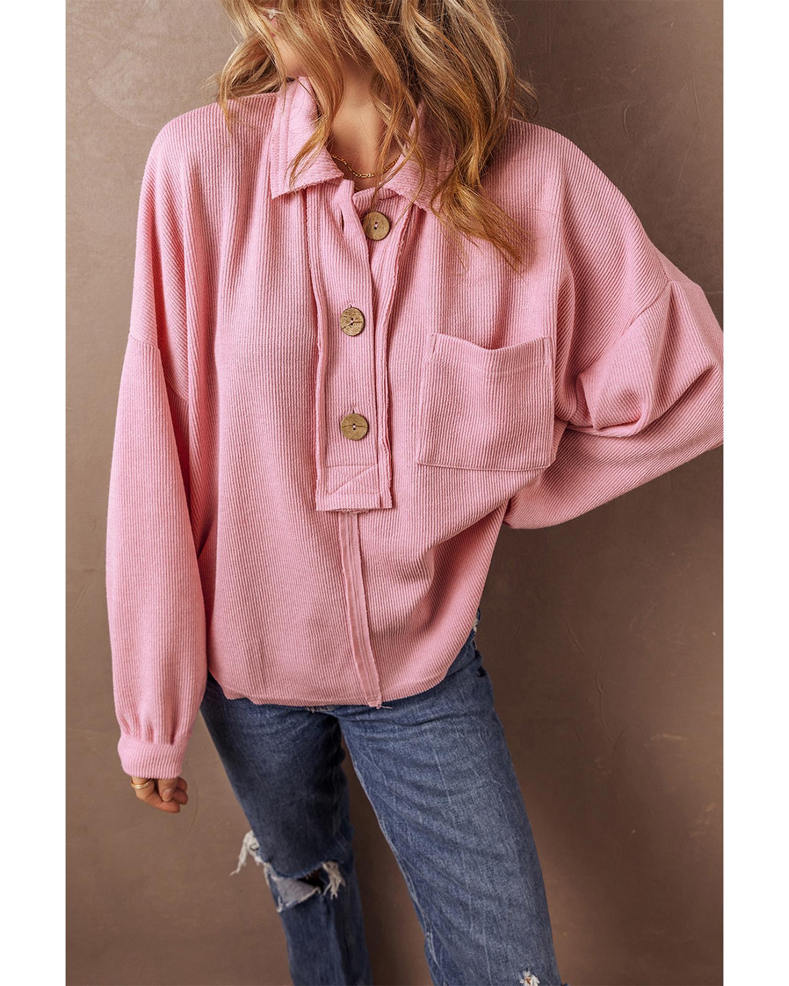 Pink Ribbed Knit Collared Henley Top with Chest Pocket – S