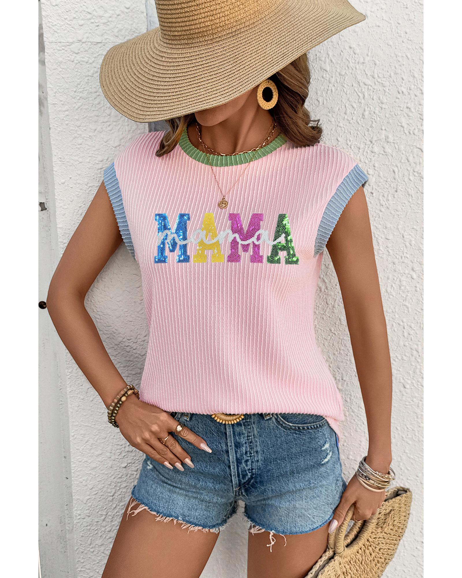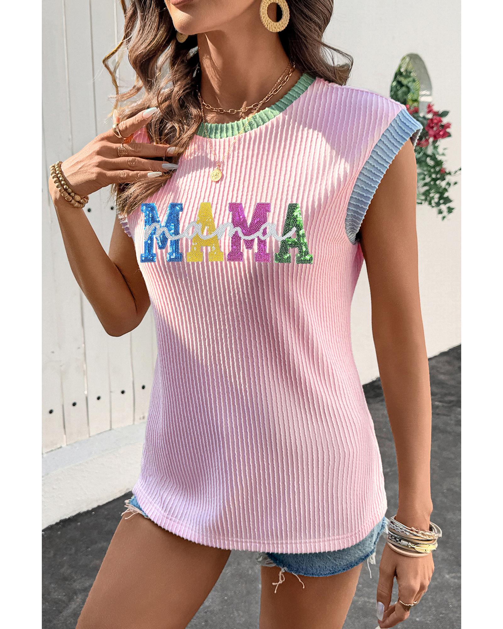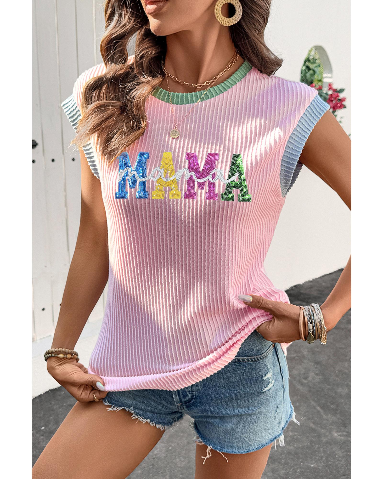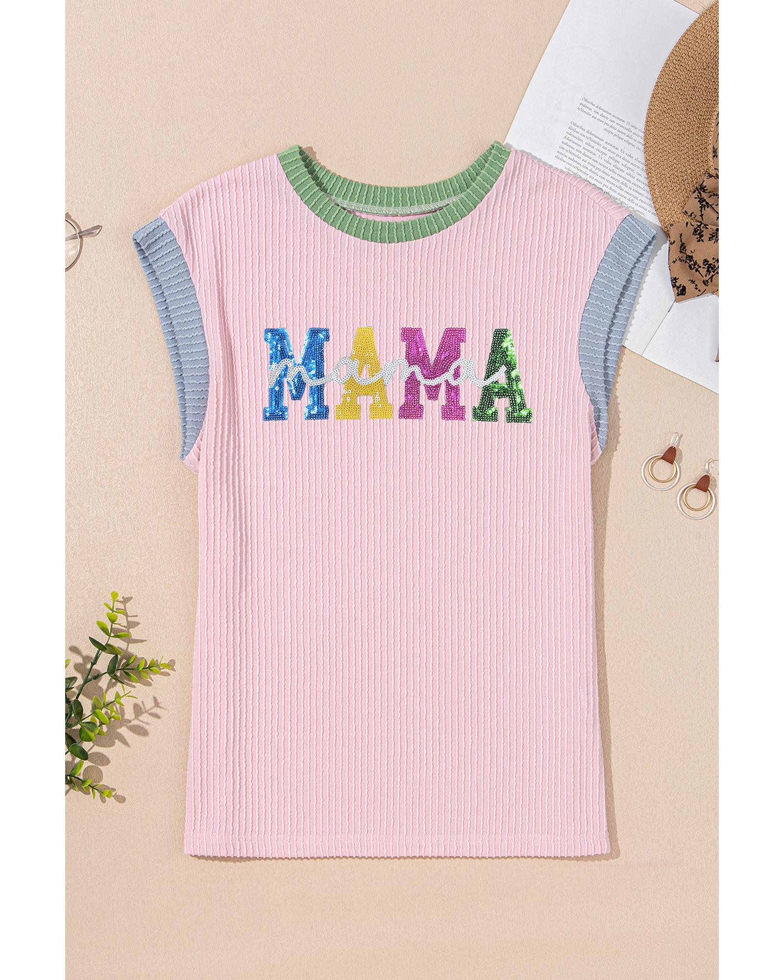 Pink Sequined MAMA Graphic Corded Rib Knit Colorblock T Shirt – S