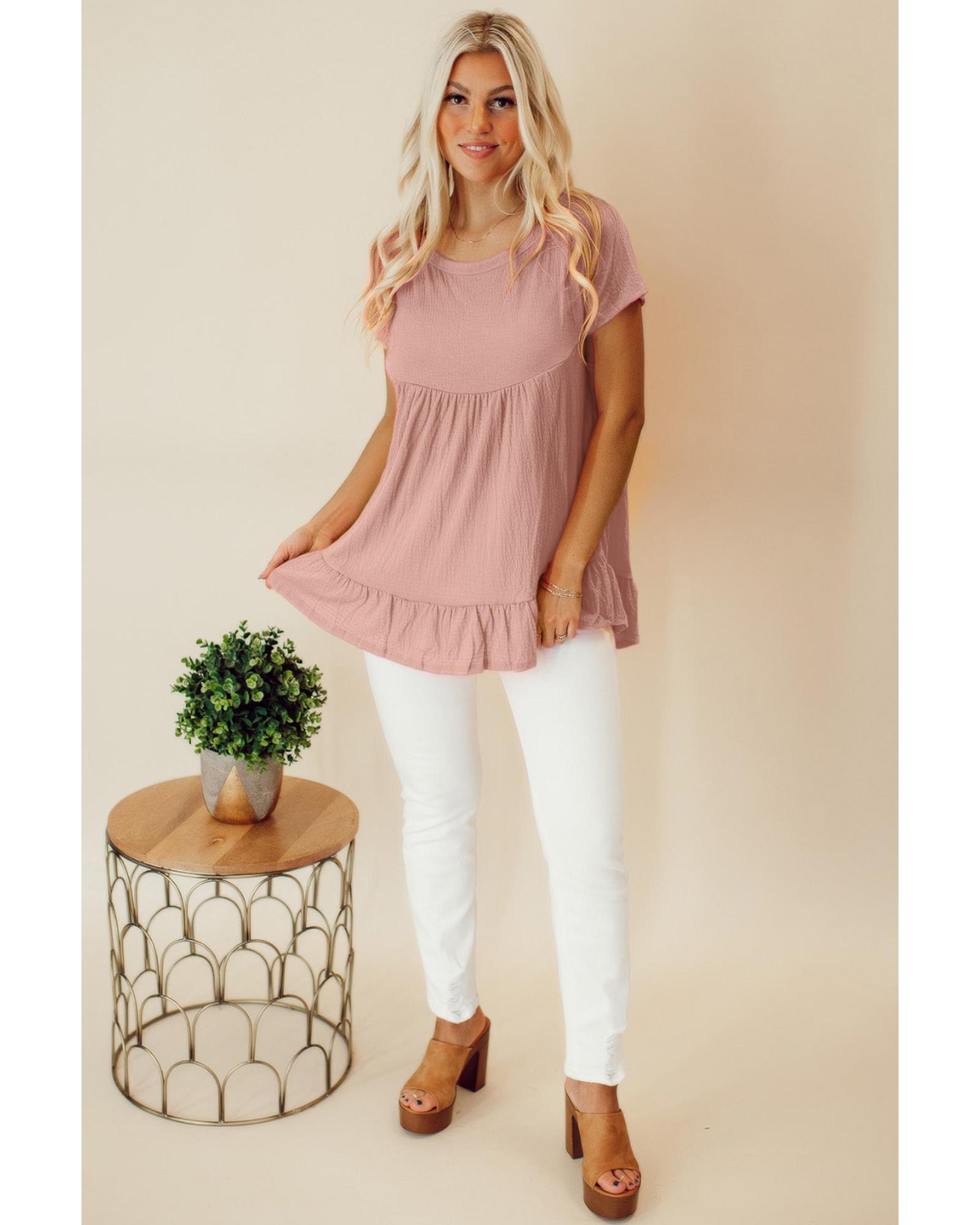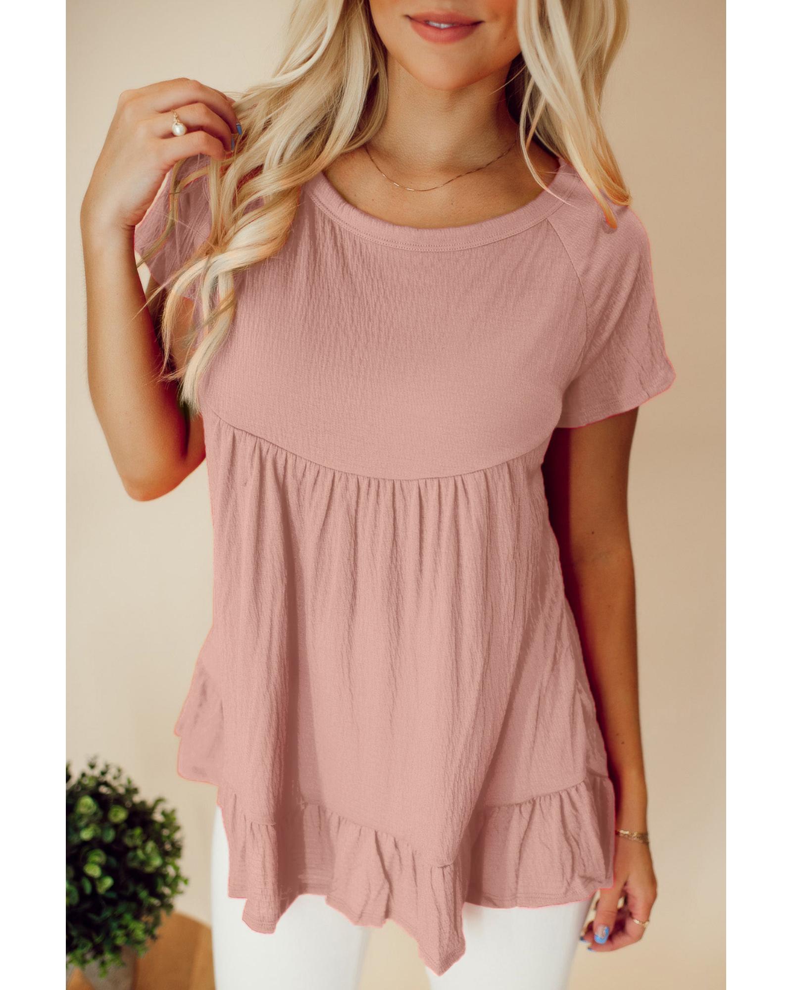 Pink Solid Short Sleeve Ruffle Hem Top – M