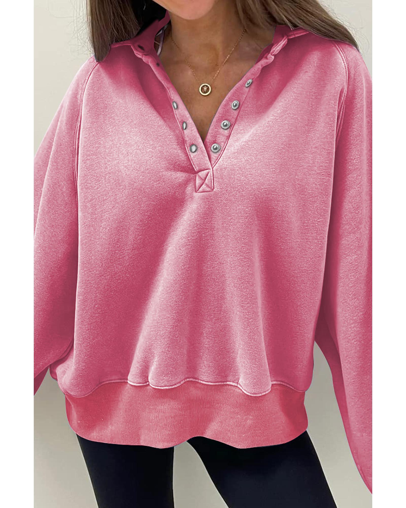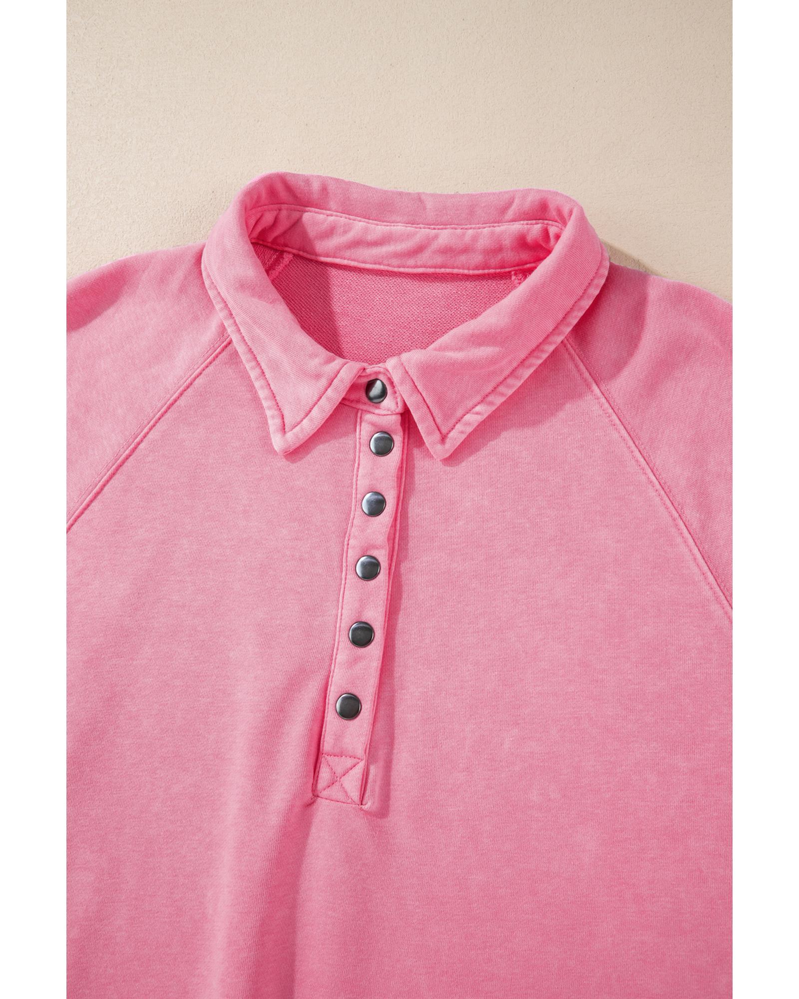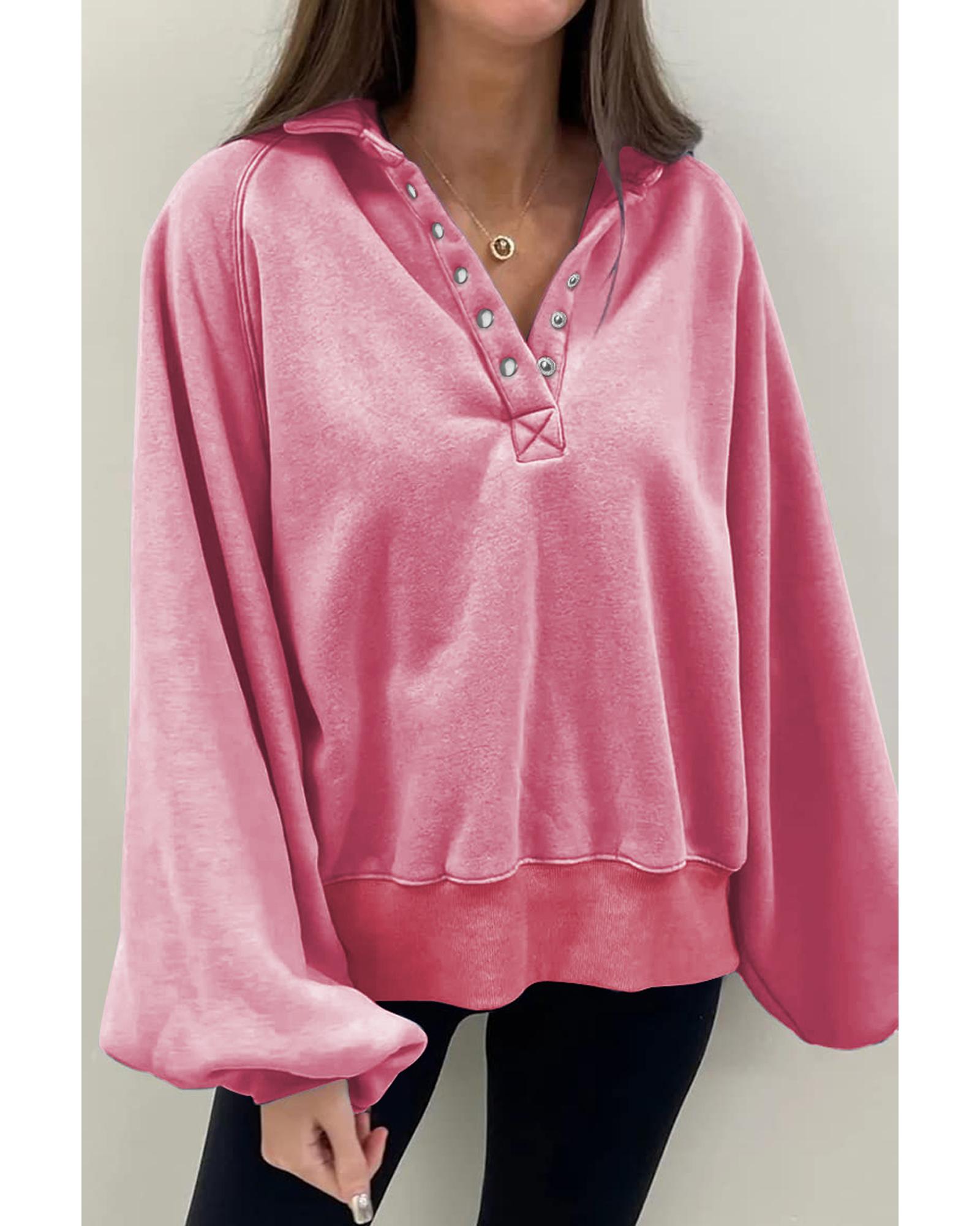 Pink Solid Snap Buttons Collared Balloon Sleeve Oversized Sweatshirt – M