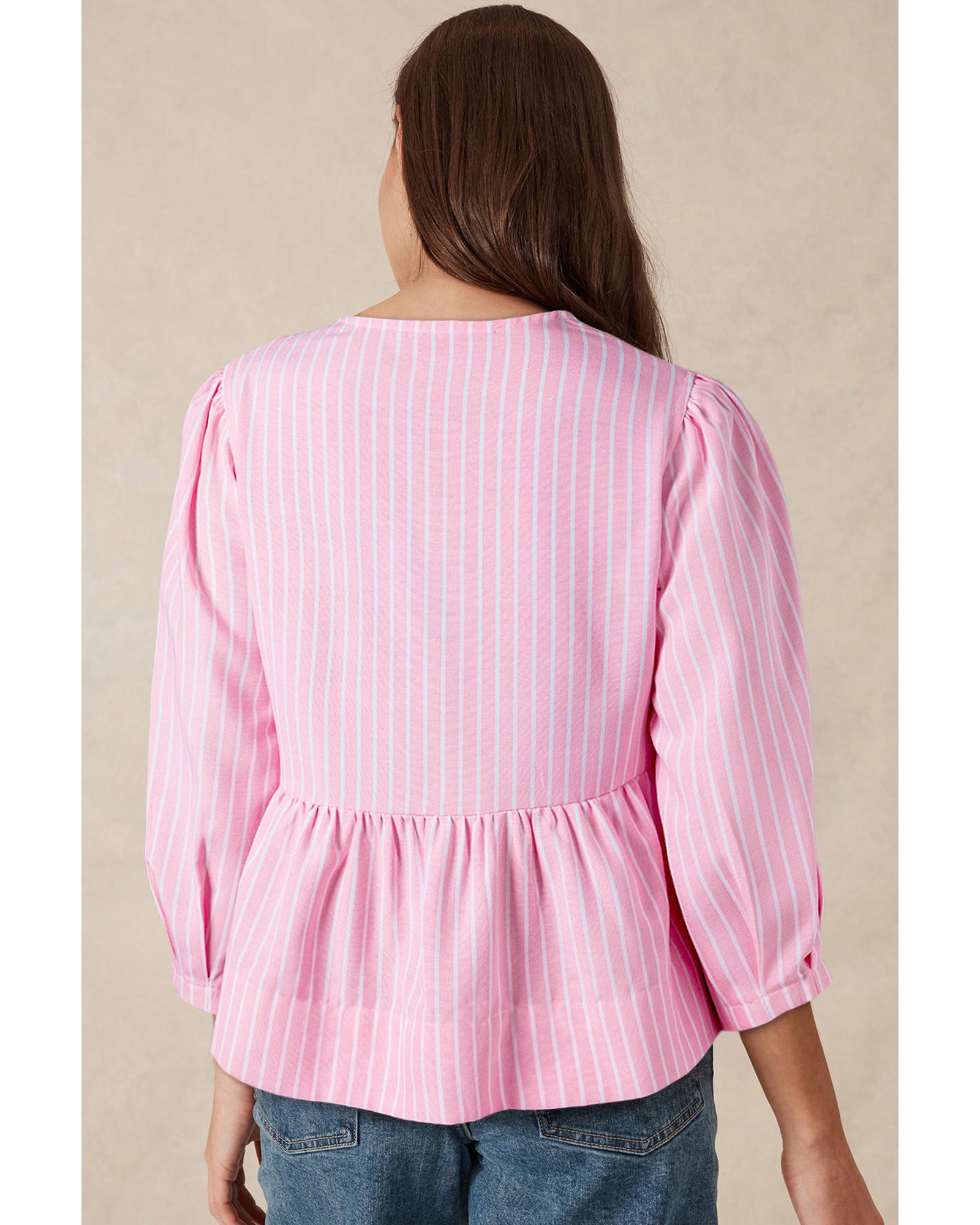 Pink Stripe Bowknot Front Crew Neck Puff Sleeve Blouse – S