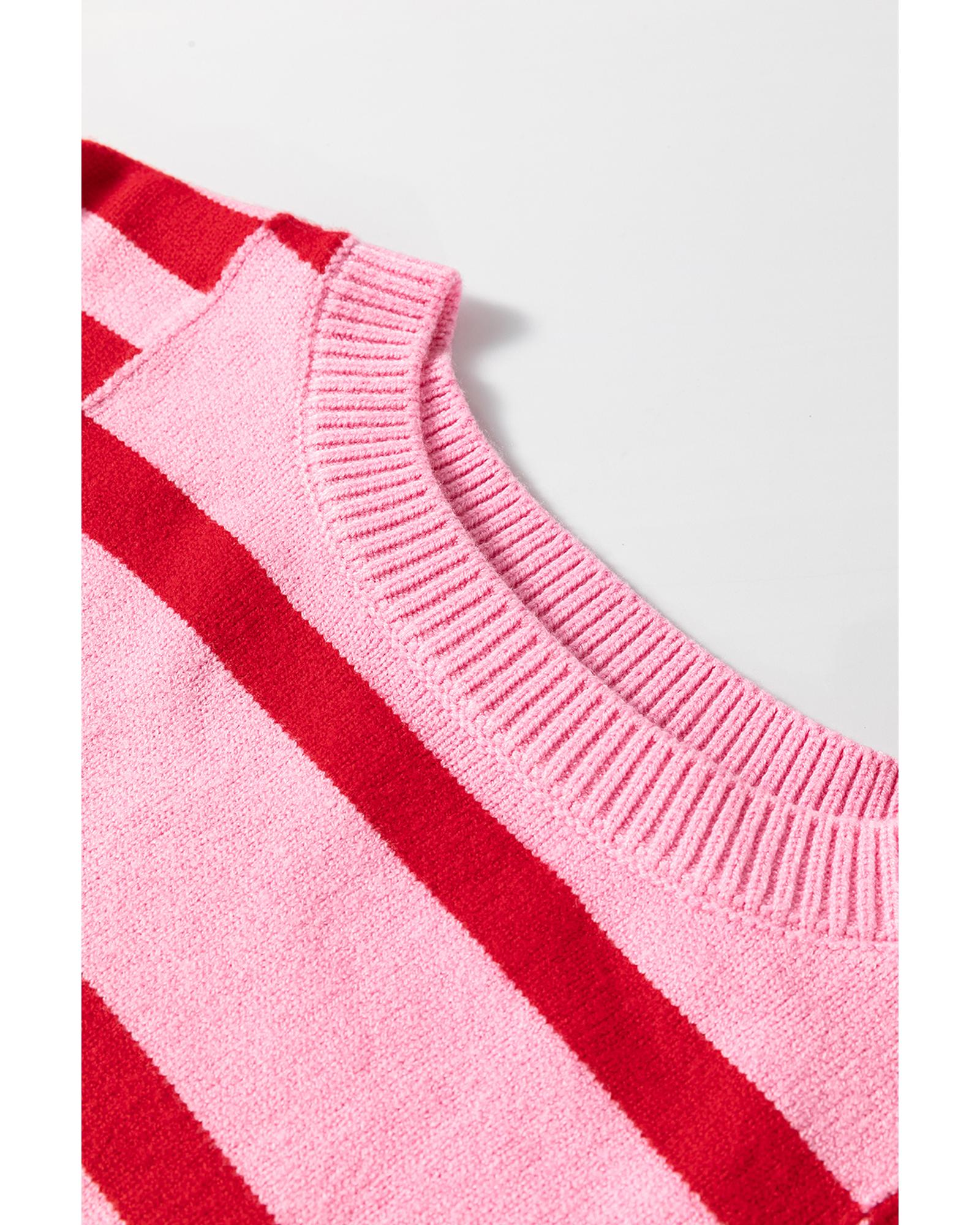 Pink Stripe Bubble Sleeve Drop Shoulder Ribbed Trim Sweater – S
