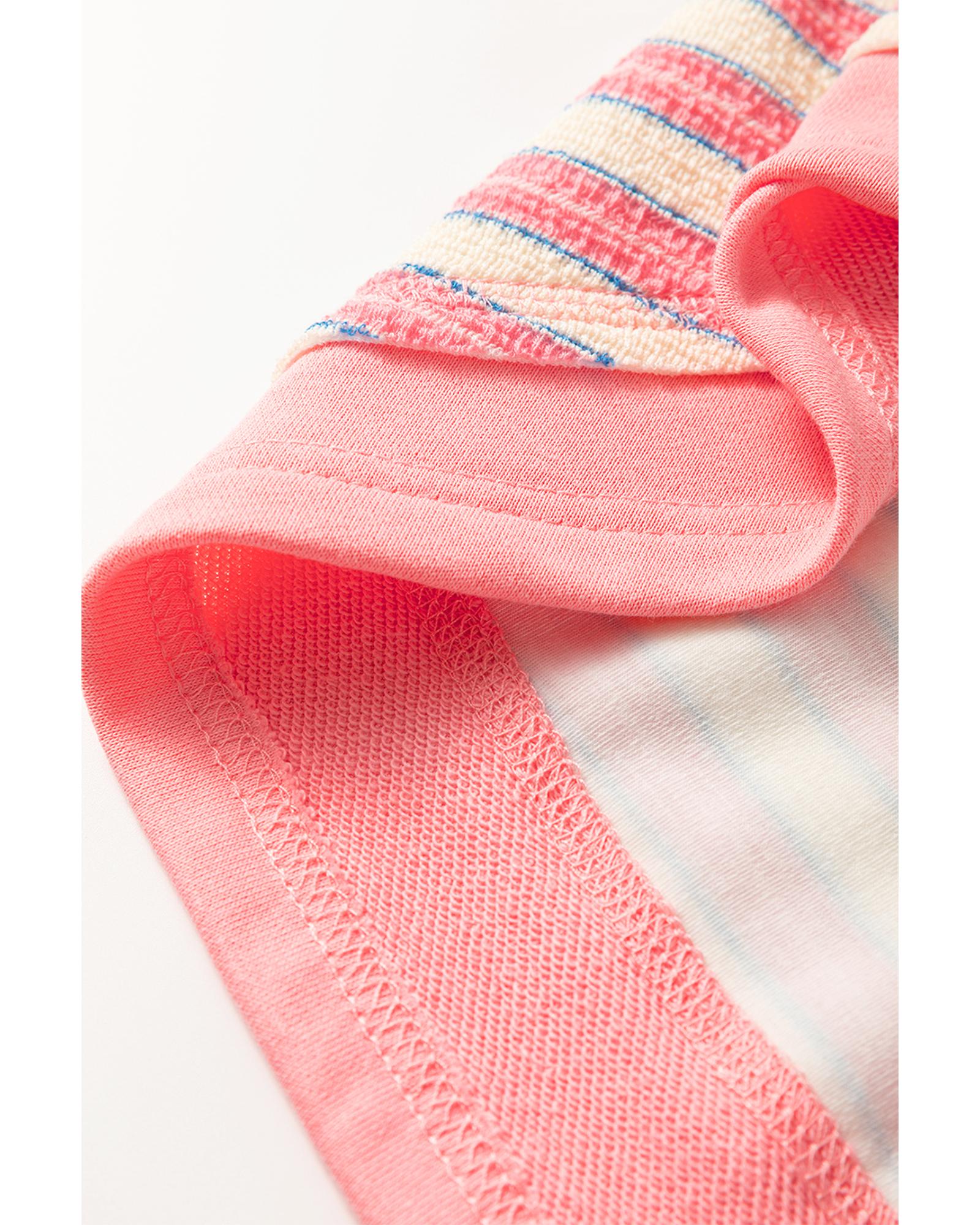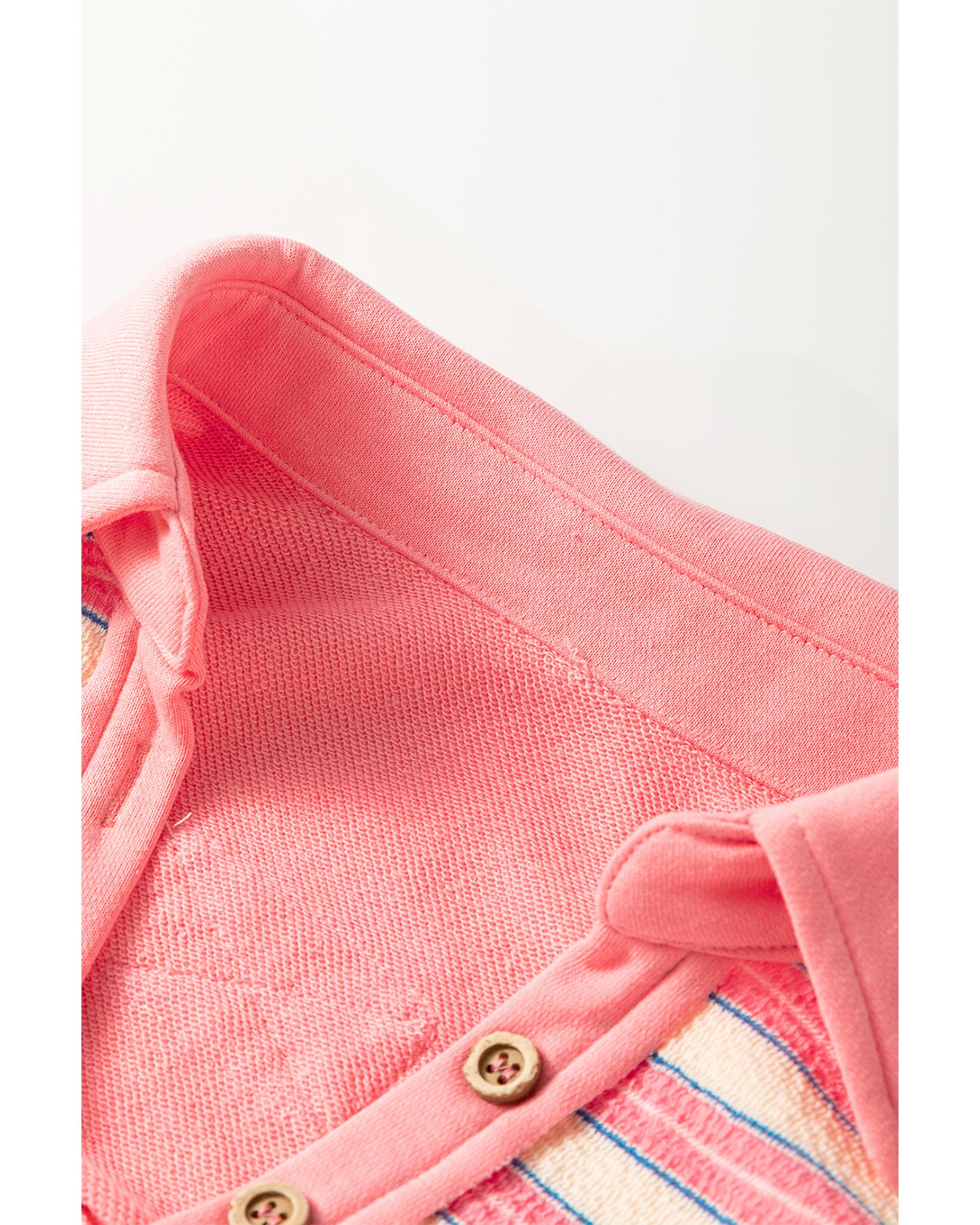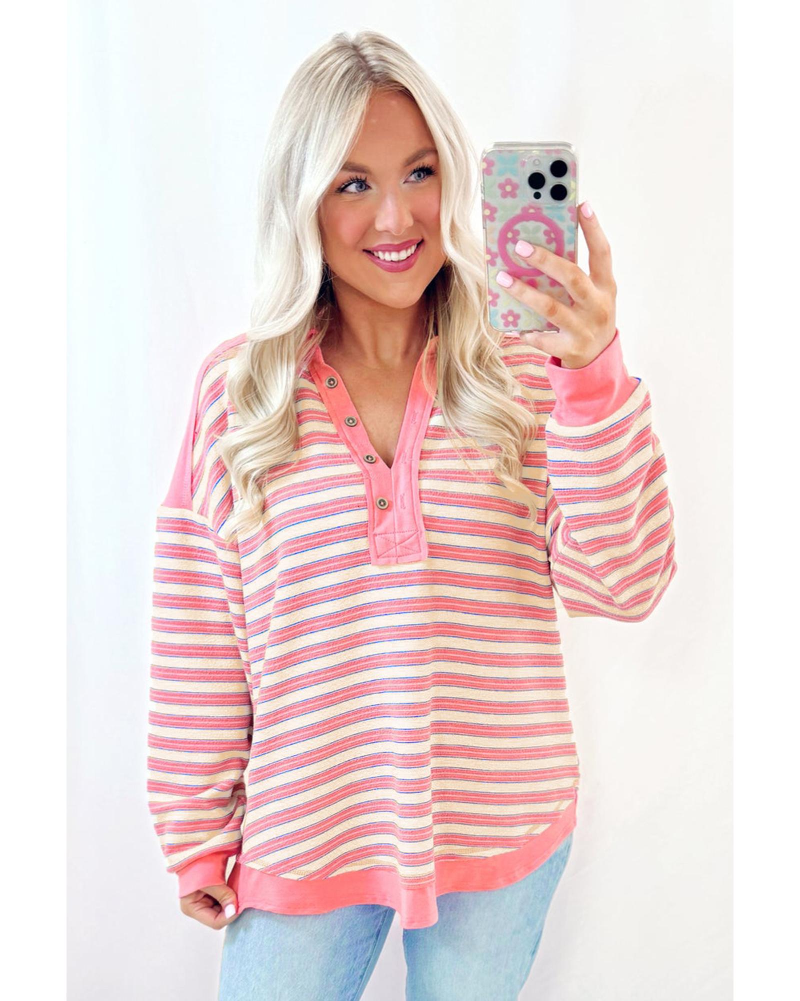Pink Stripe Buttoned V Neck Collared Drop Shoulder Top – M