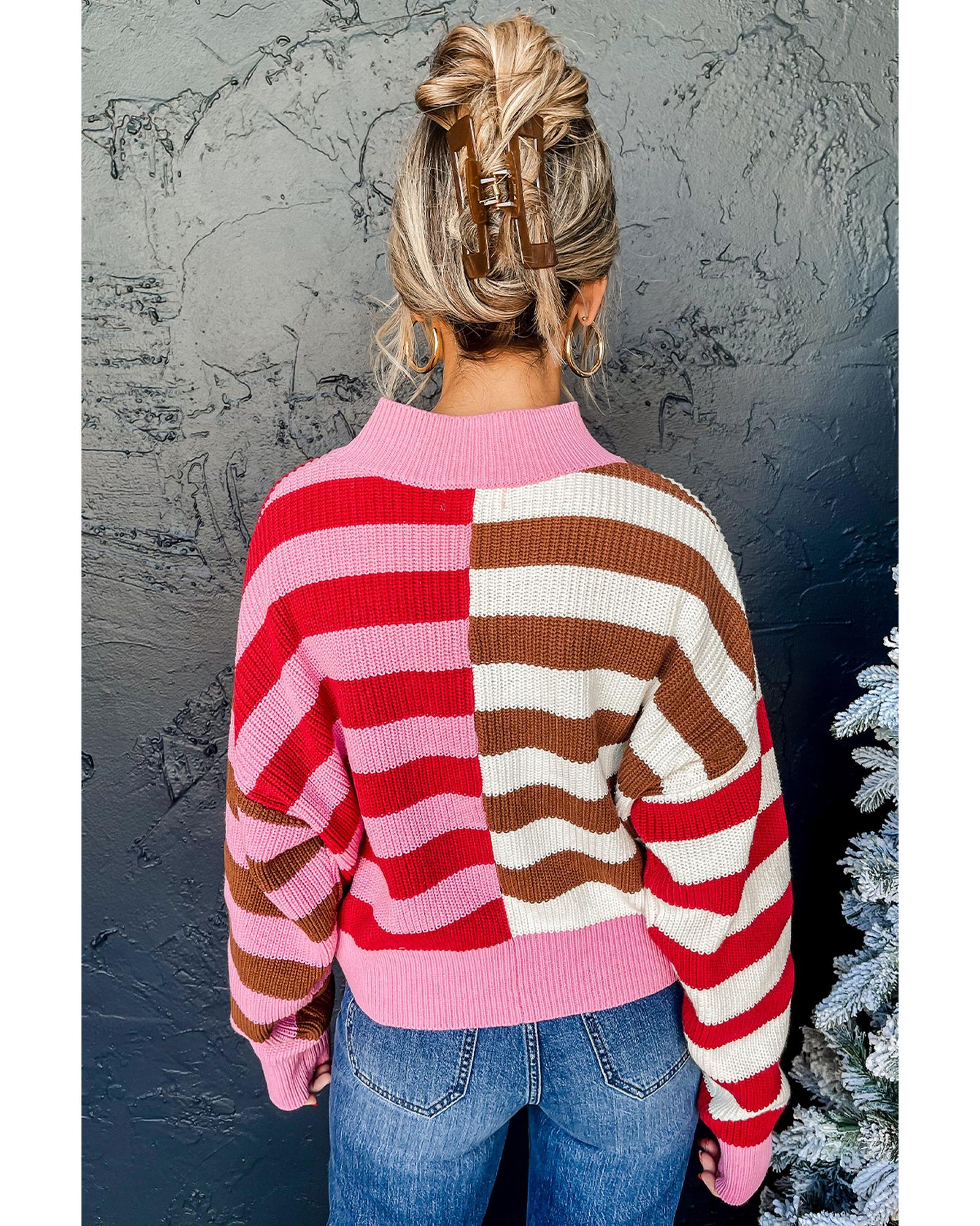 Pink Stripe Color Block High Neck Drop Shoulder Loose Sweater – L