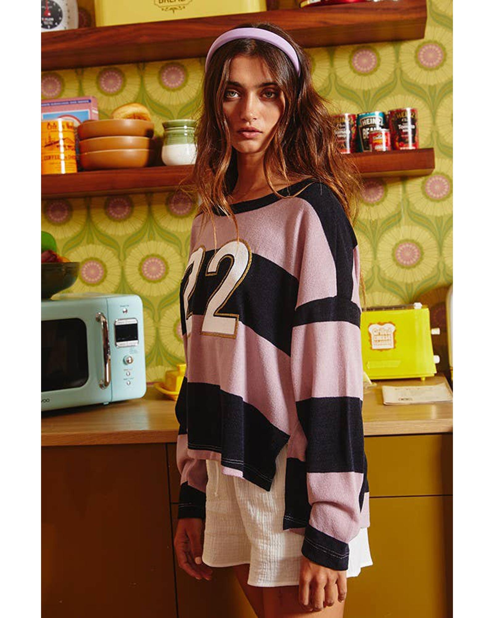 Pink Stripe Color Block Number 22 Print Game Day Loose Long Sleeve Top – XL