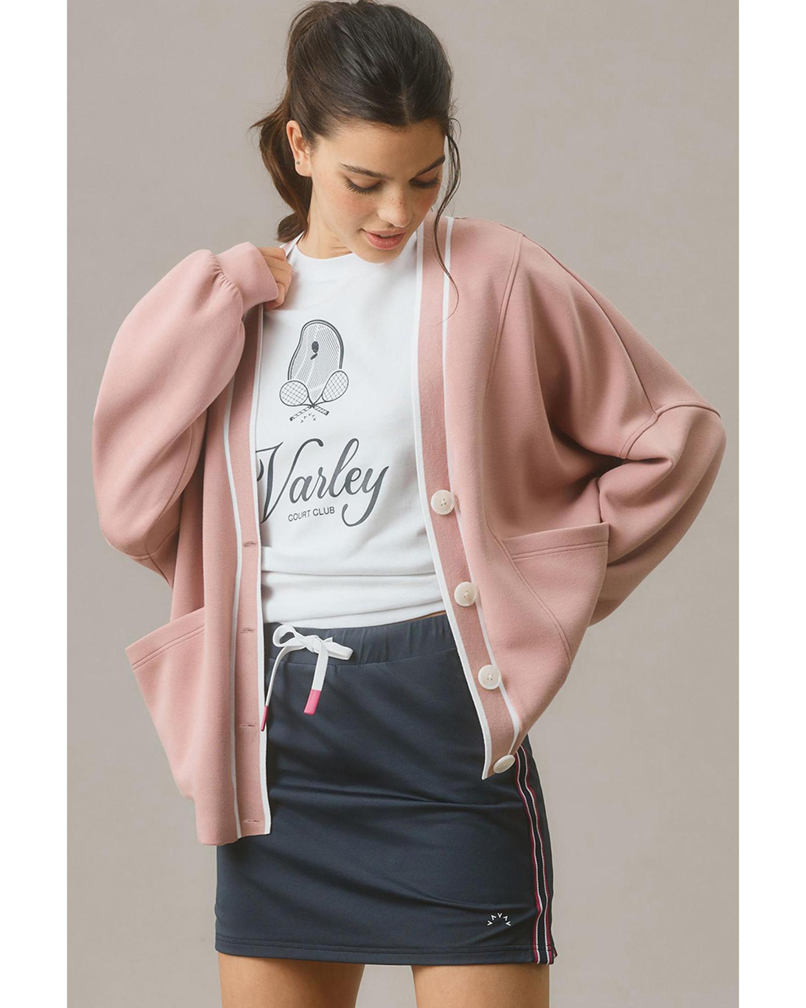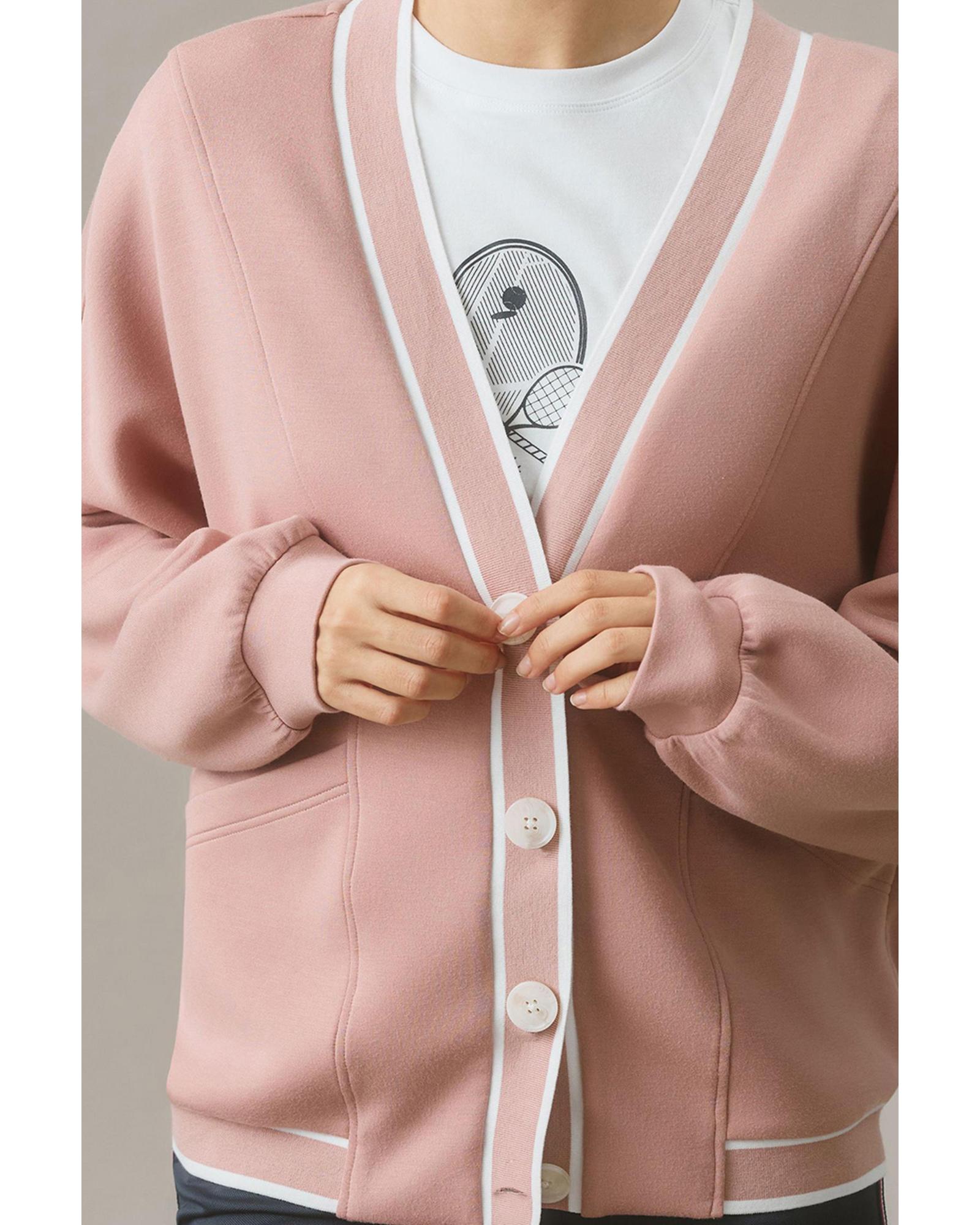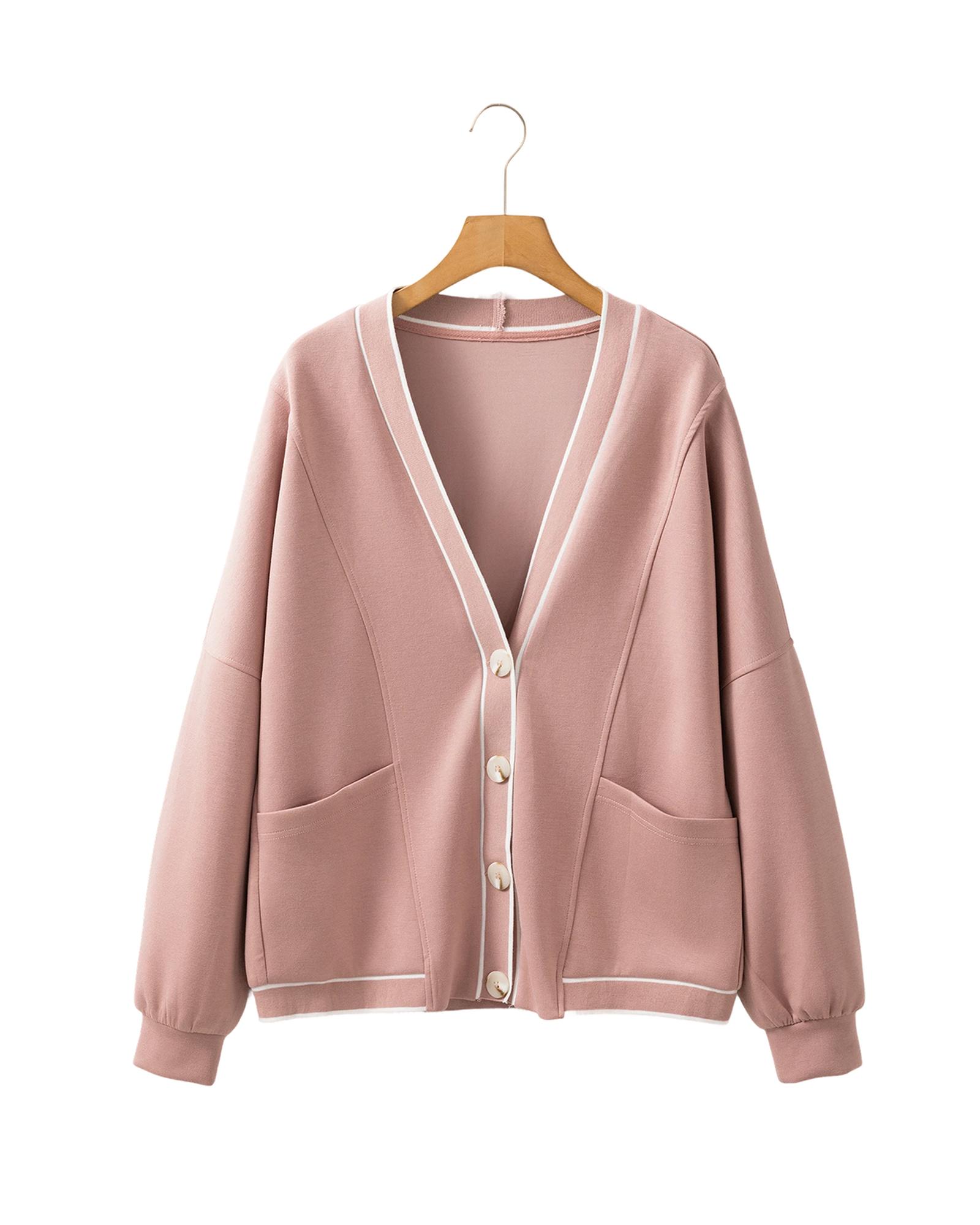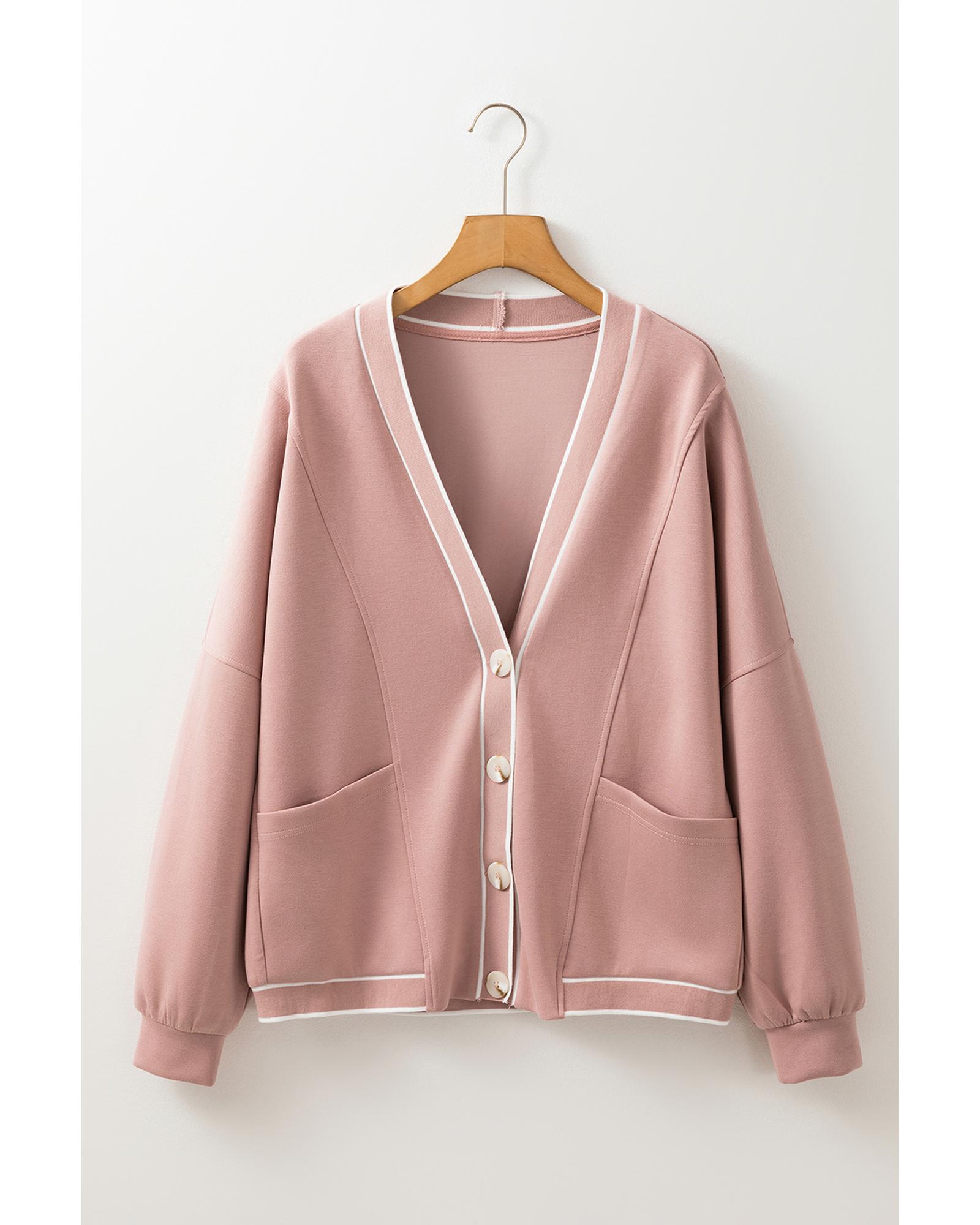 Pink Stripe Contrast Trim V Neck Buttoned Front Pocketed Knit Cardigan – L