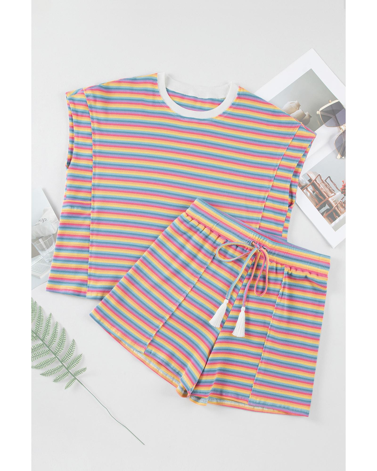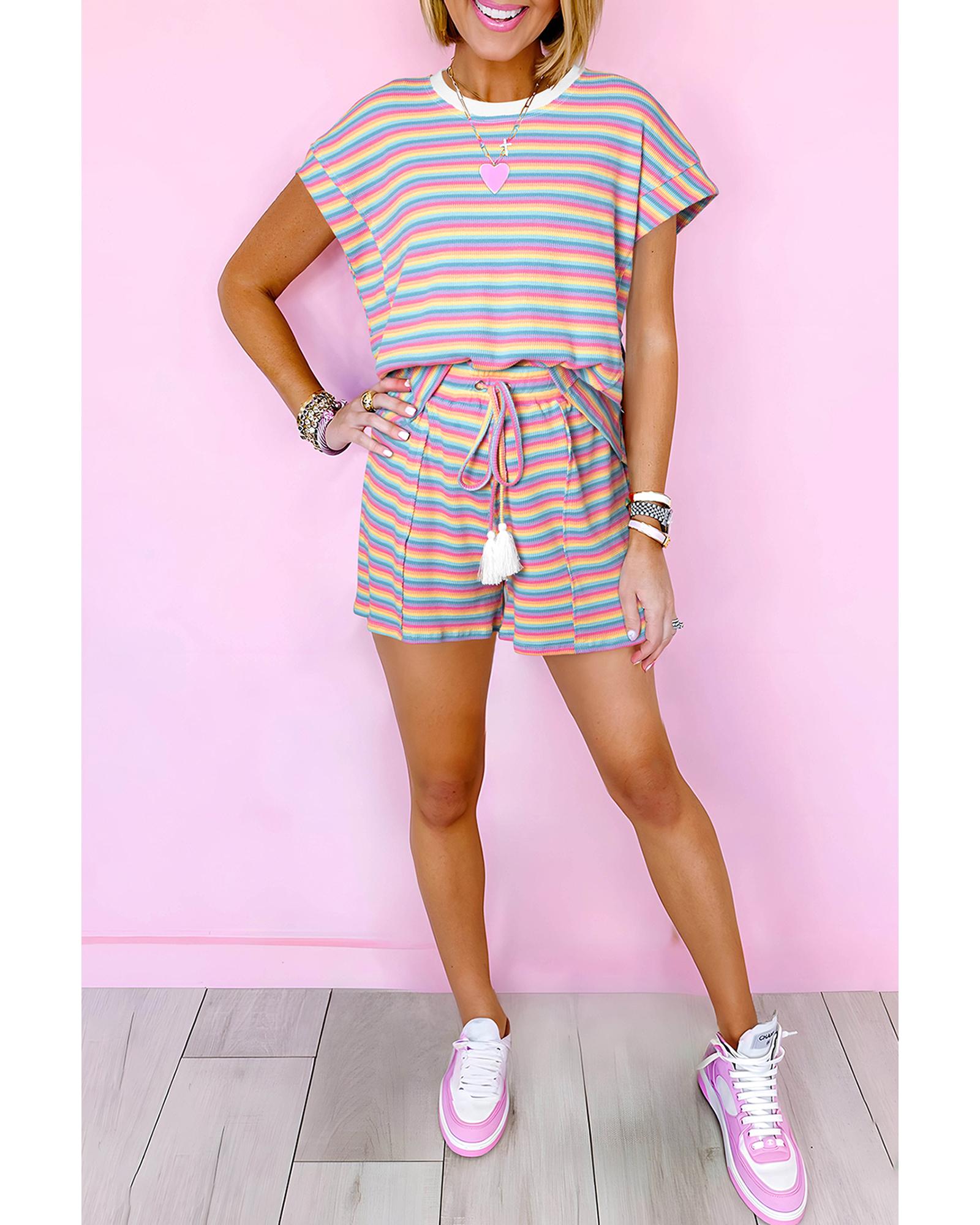 Pink Stripe Crew Neck Tee and Tasseled Drawstring Shorts Set – XL